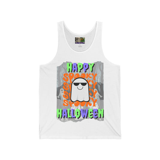 Spooky Happy Halloween Ghost Mixed font Unisex Jersey Tank Top by CreepyCrafts.boo