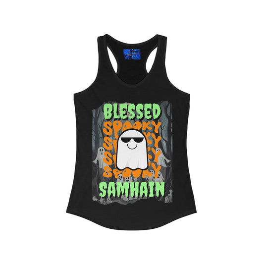Spooky Blessed Samhain Ghost PRfont Women's Racerback Tank Top by cypherpunkgear