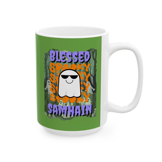 Spooky Blessed Samhain Ghost PRfont Green Mug by cypherpunkgear