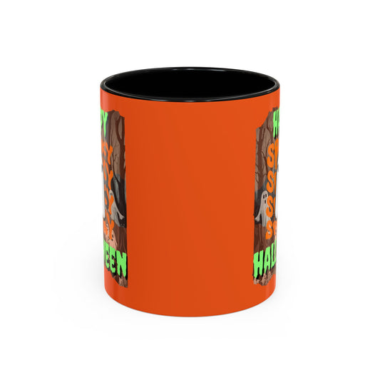 Spooky Happy Halloween Ghost Green font Orange Accent Mug by CreepyCrafts.boo