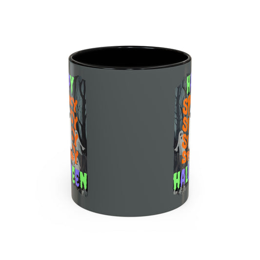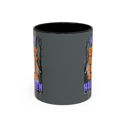 Spooky Happy Halloween Ghost Mixed font Grey Accent Mug by CreepyCrafts.boo