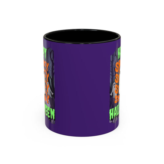 Spooky Happy Halloween Ghost Mixed font Purple Accent Mug by CreepyCrafts.boo
