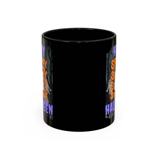 Spooky Happy Halloween Ghost Mixed font Black Accent Mug by CreepyCrafts.boo