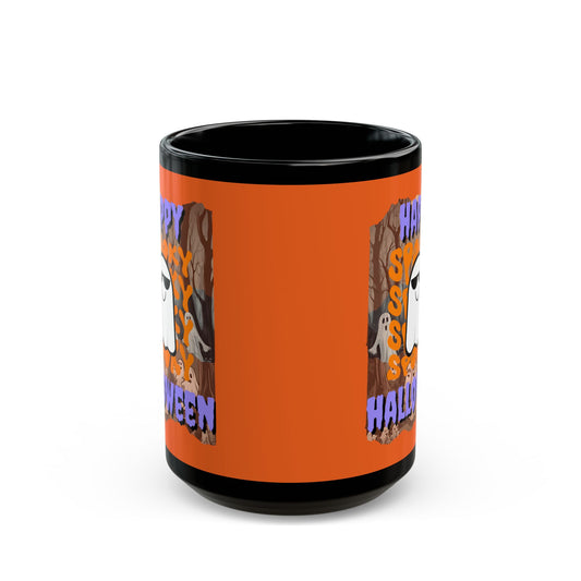 Spooky Happy Halloween Ghost Mixed font Black Mug by CreepyCrafts.boo