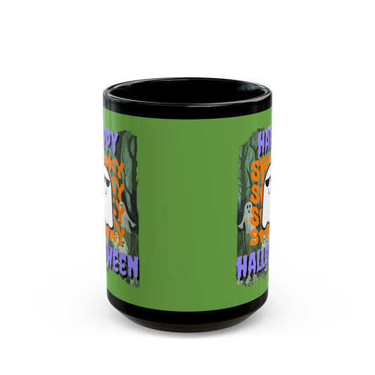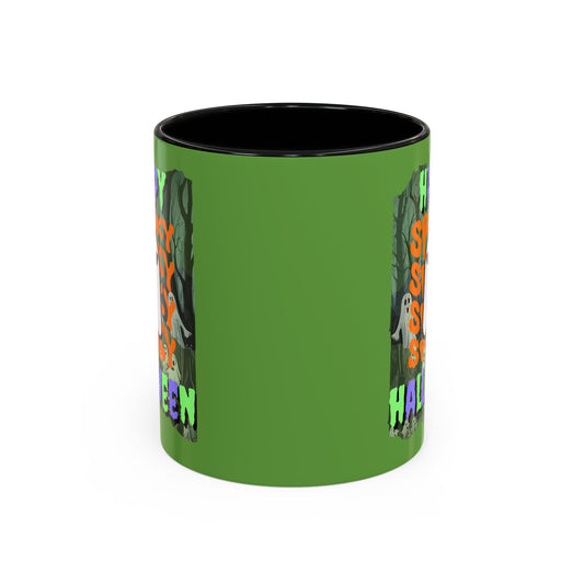 Spooky Happy Halloween Ghost Mixed font Green Accent Mug by CreepyCrafts.boo