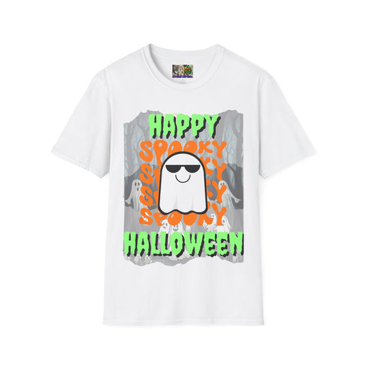 Spooky Happy Halloween Ghost Light colors Green font Unisex T-Shirt by CreepyCrafts.boo