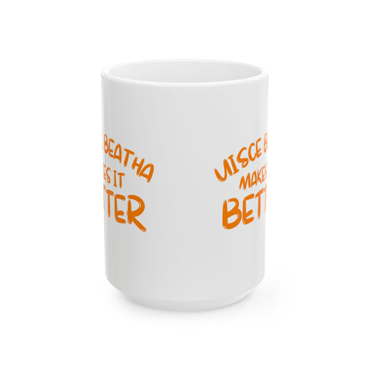 Uisce Beatha makes it better Orange font White Mug by cypherpunkgear.com