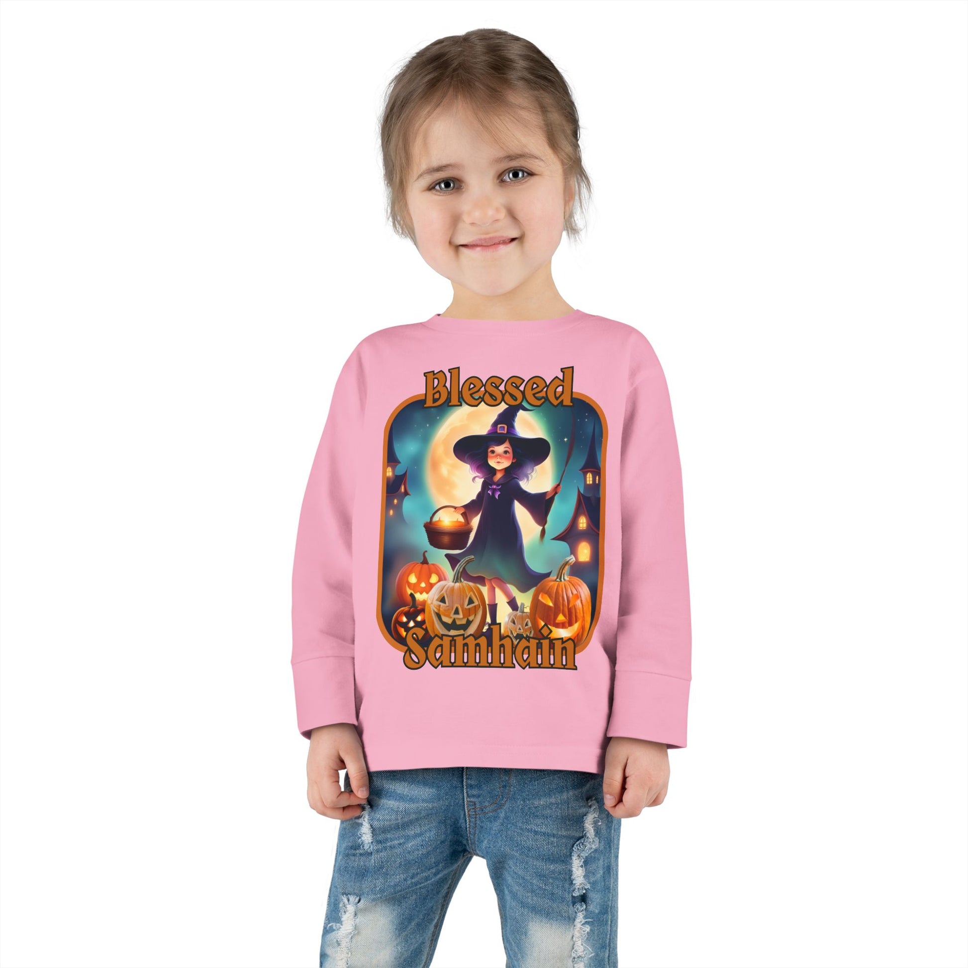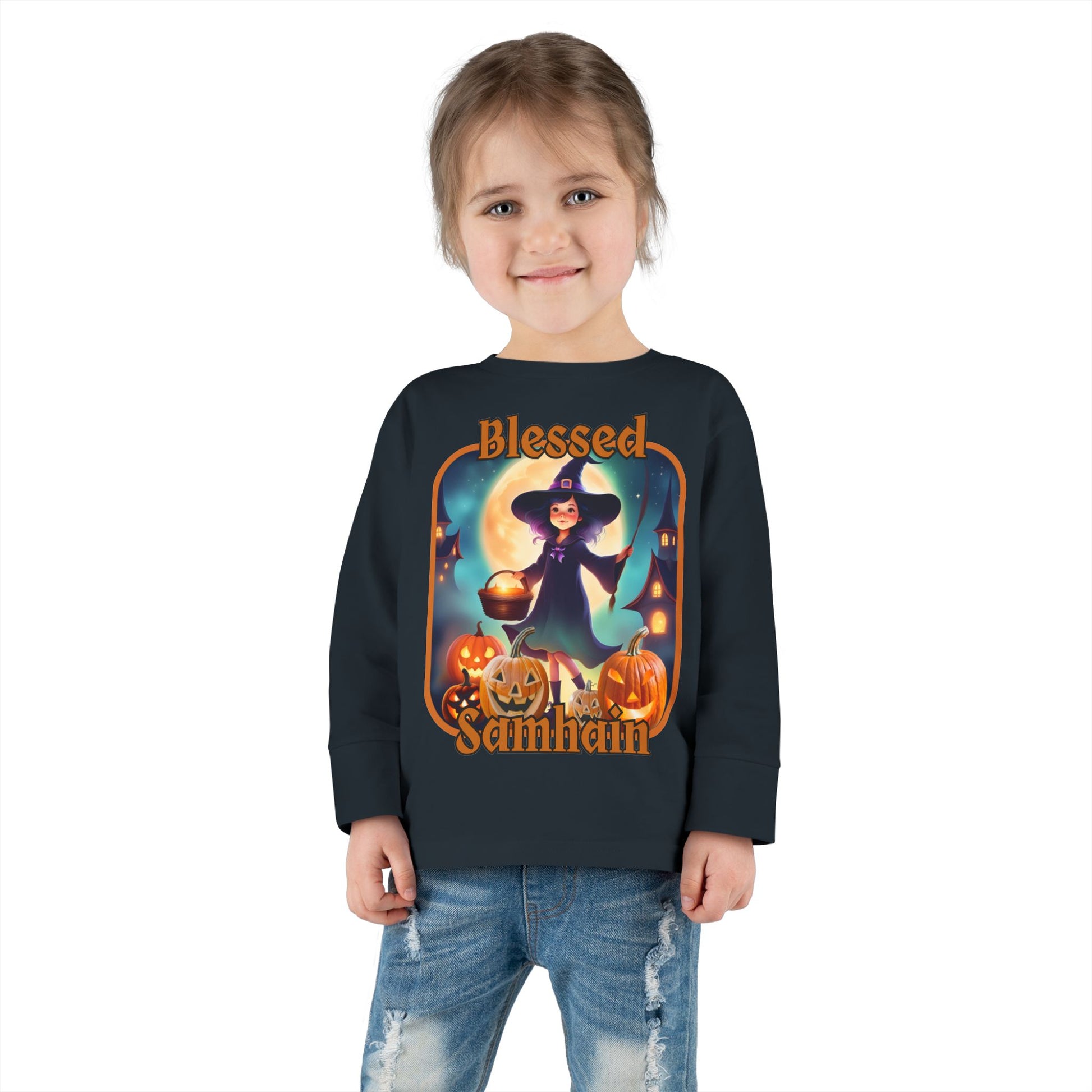 Blessed Samhain Little Witch Orange font Toddler Long Sleeve Tee by CreepyCrafts.boo