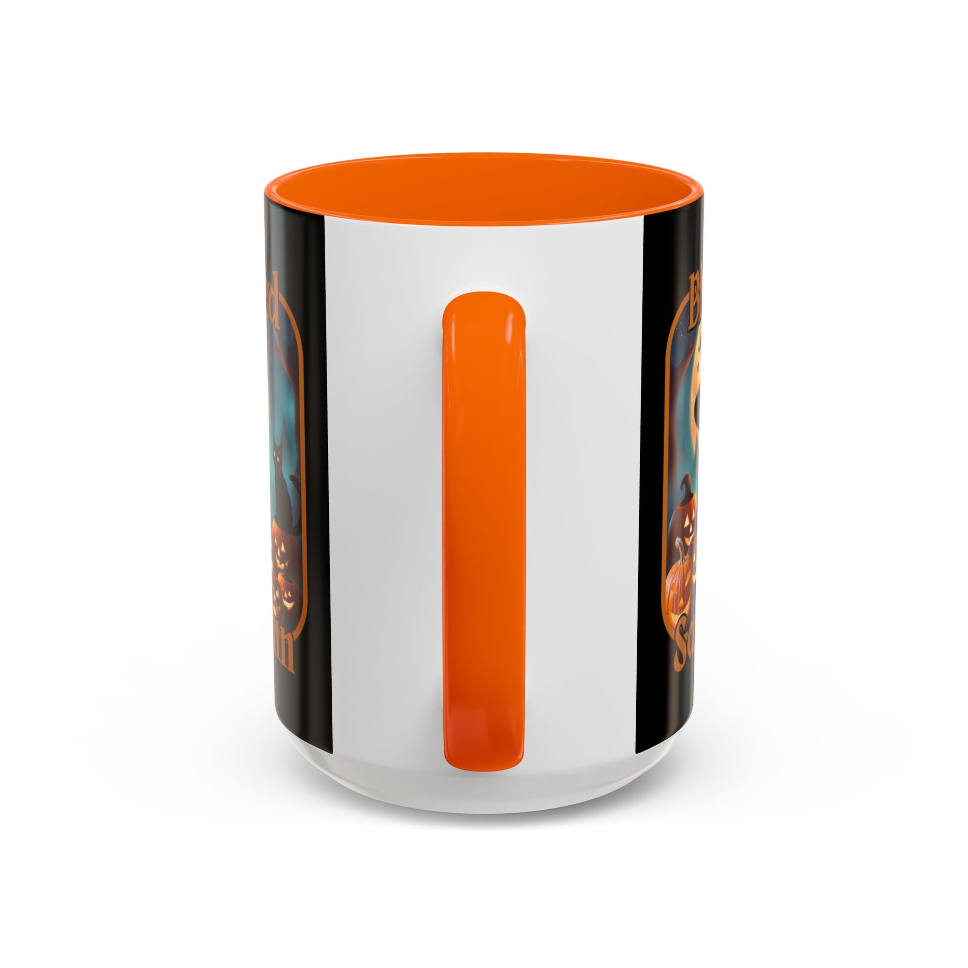 Blessed Samhain Cute Witch Orange font Black Accent Mug by CreepyCrafts.boo