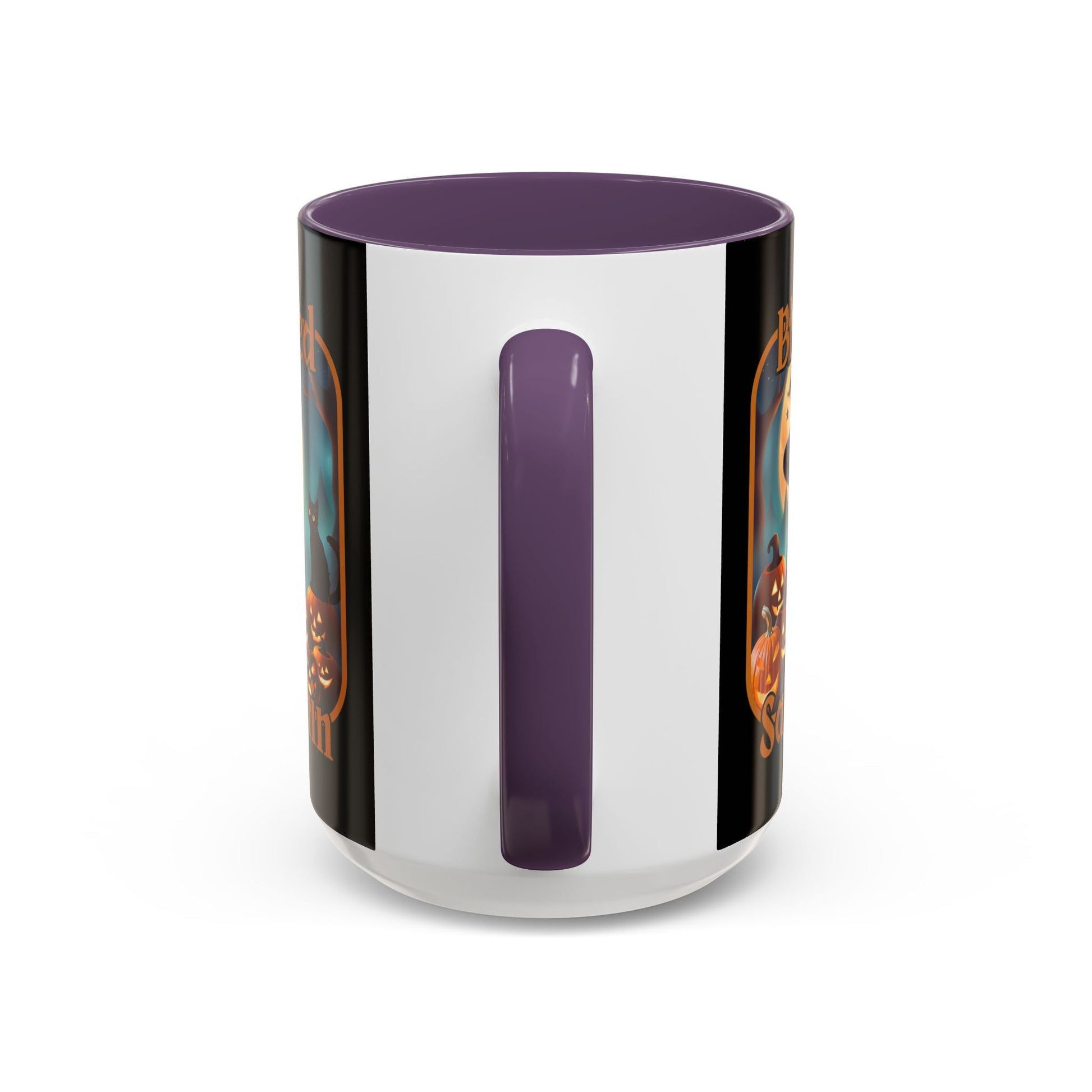 Also available with purple font: Blessed Samhain Cute Witch Purple font Black Accent Mug by CreepyCrafts.boo