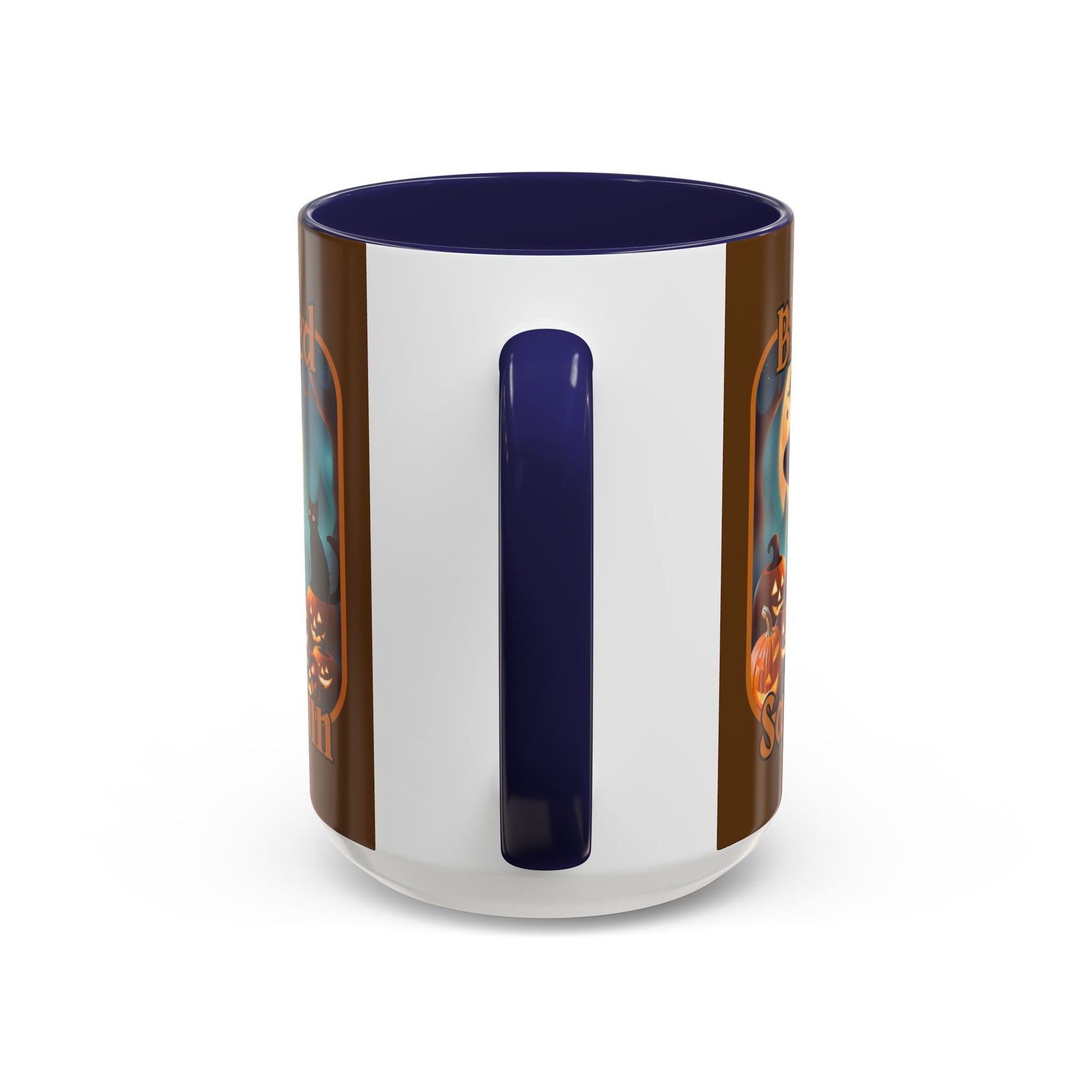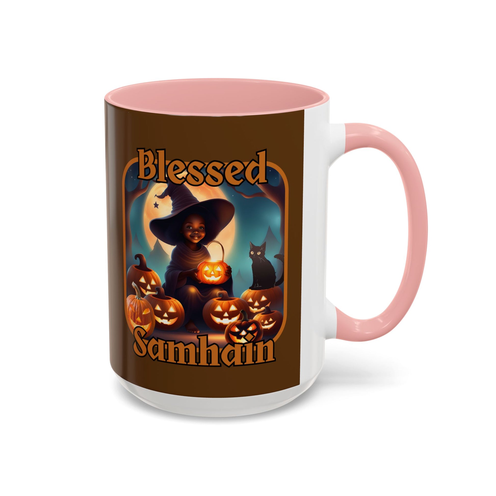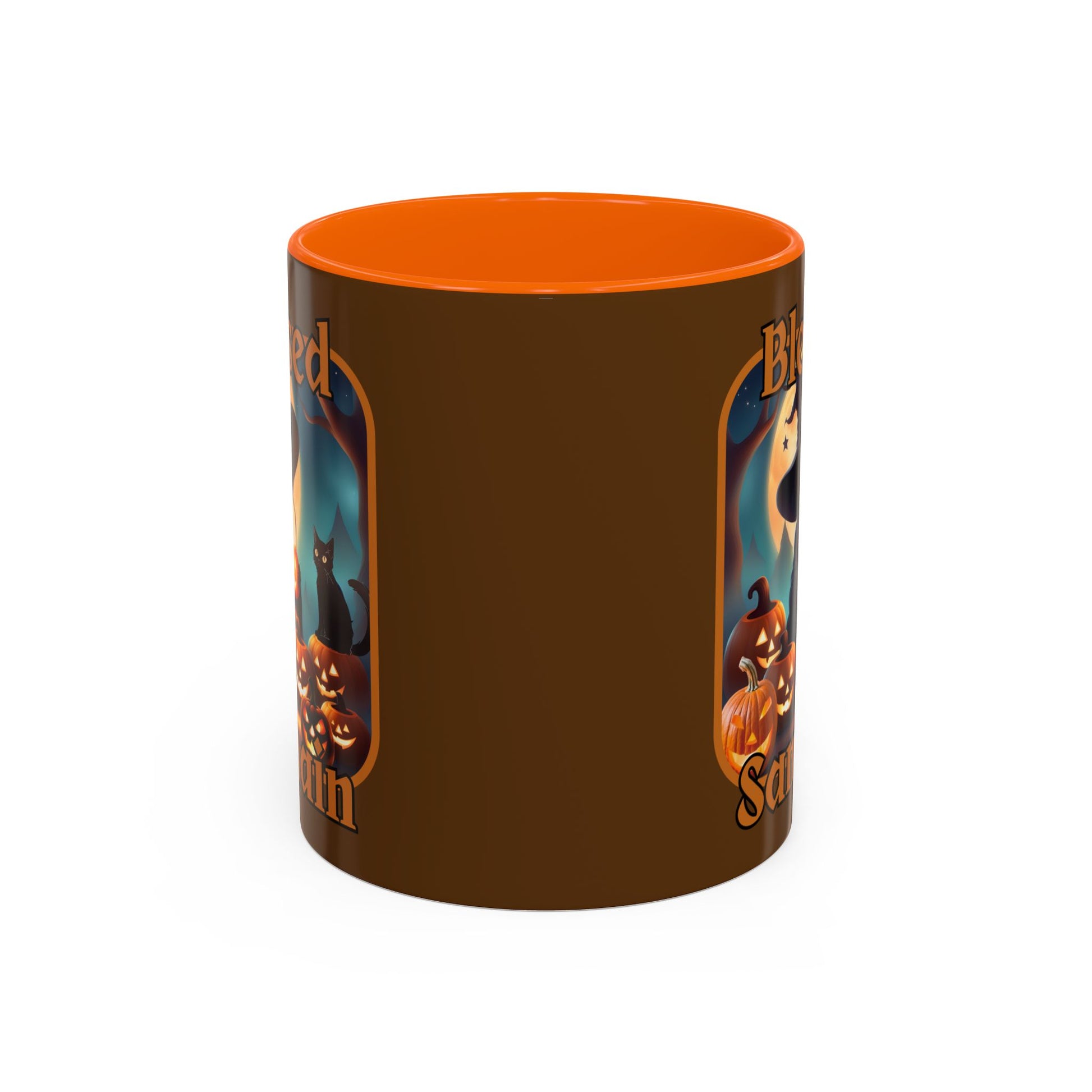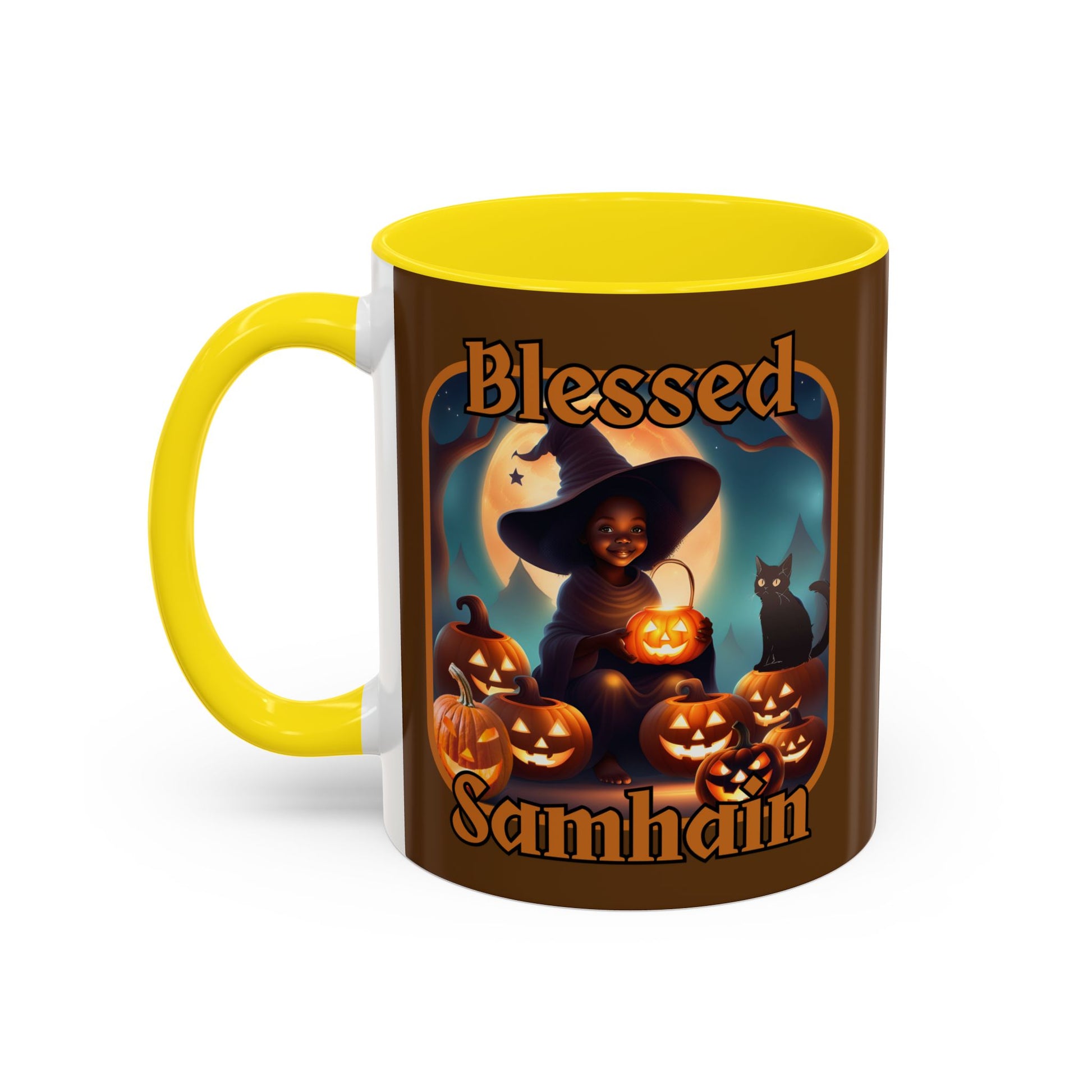 Blessed Samhain Cute Witch Orange font Brown Accent Mug by CreepyCrafts.boo