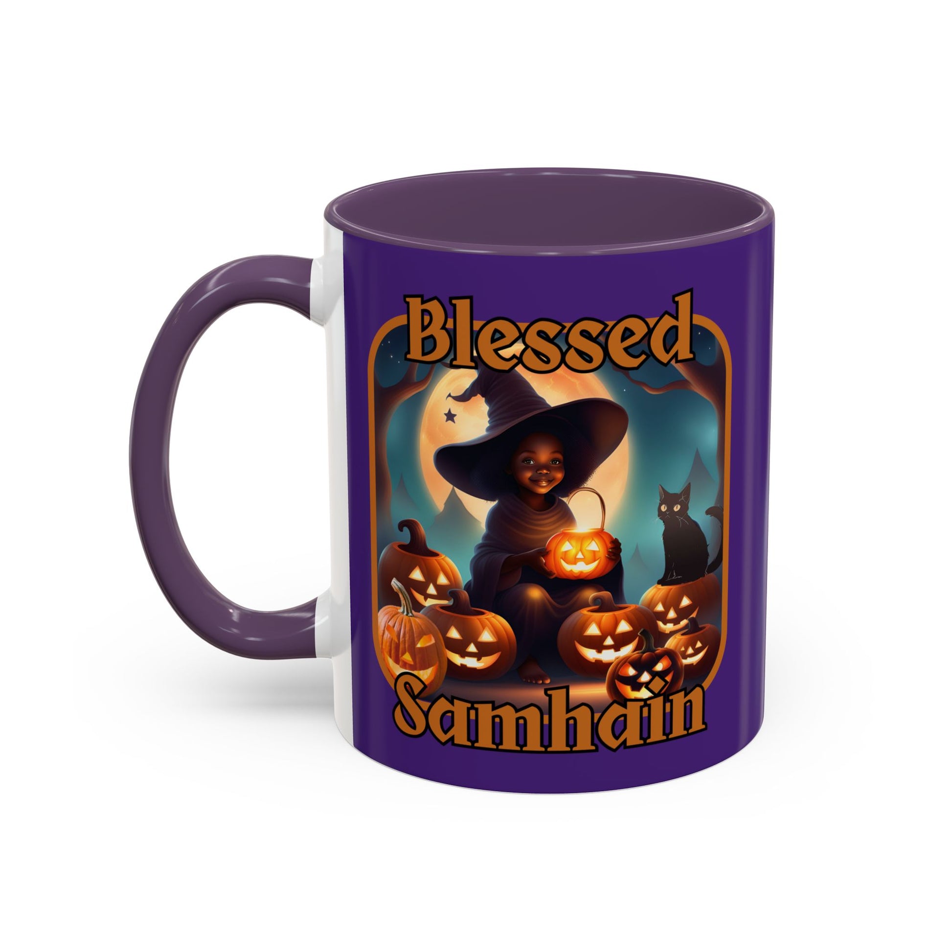 Also available with purple font: Blessed Samhain Cute Witch Purple font Purple Accent Mug by CreepyCrafts.boo