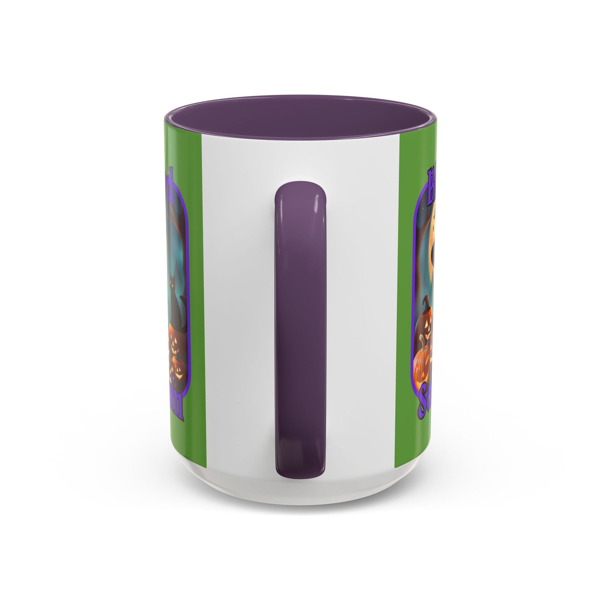 Blessed Samhain Cute Witch Purple font Green Accent Mug by CreepyCrafts.boo