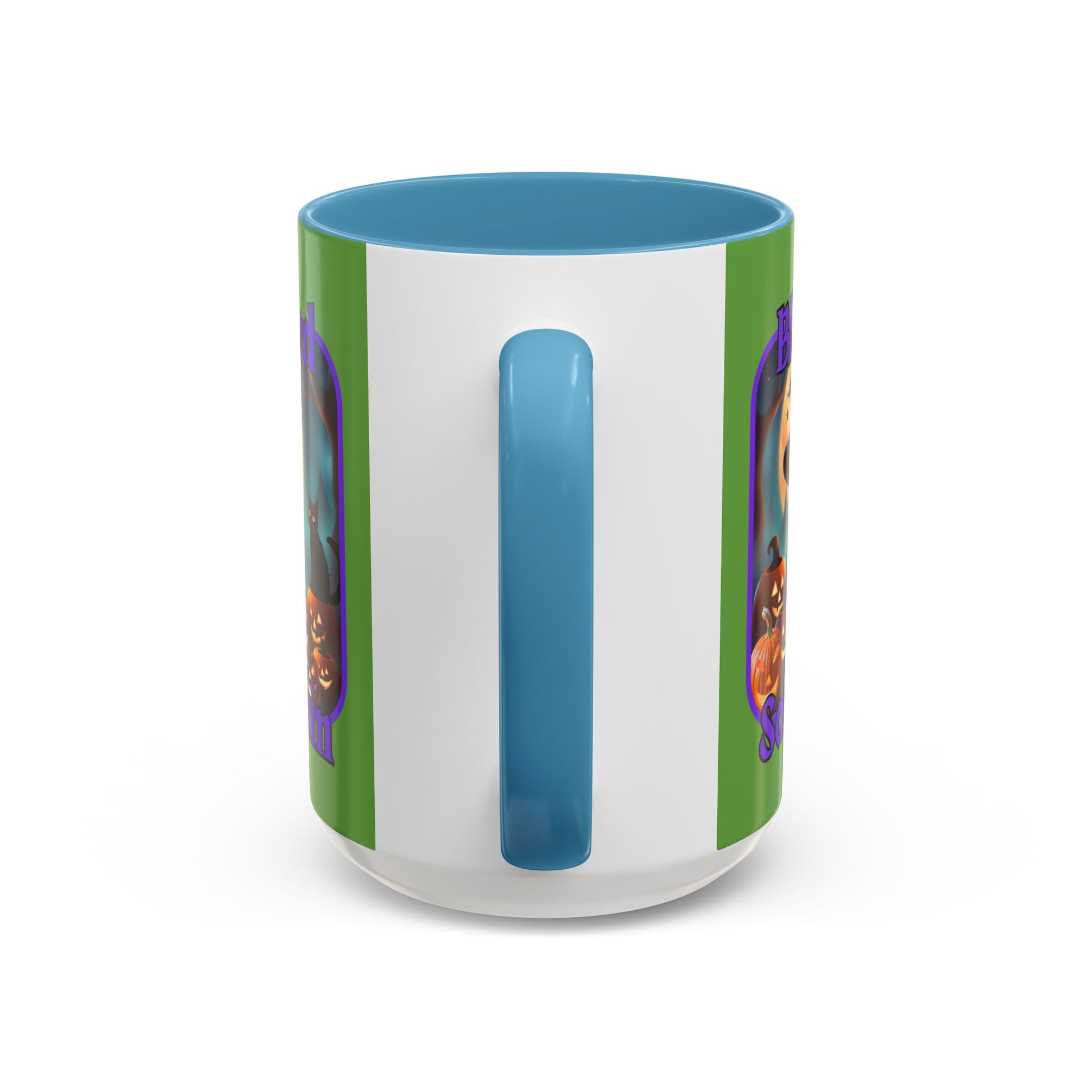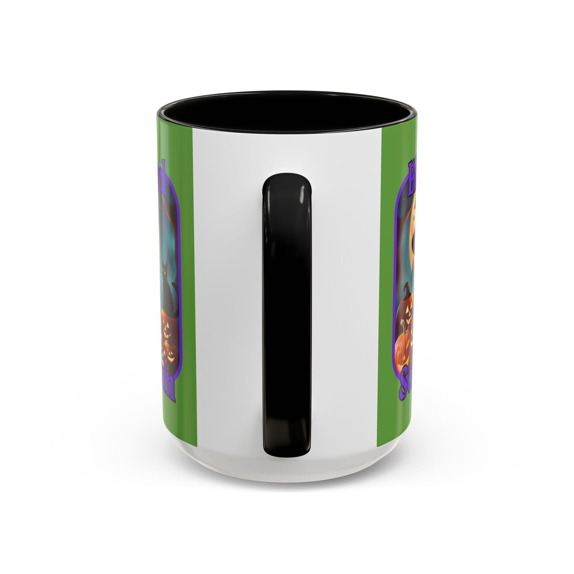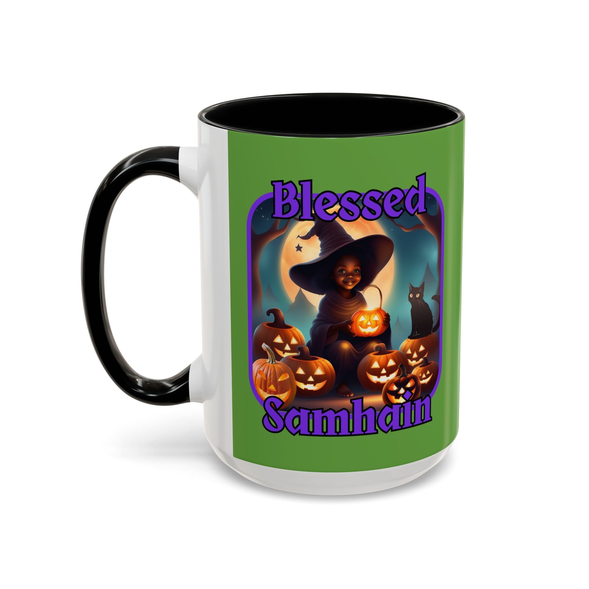 Also available with orange font: Blessed Samhain Cute Witch Orange font Green Accent Mug by CreepyCrafts.boo