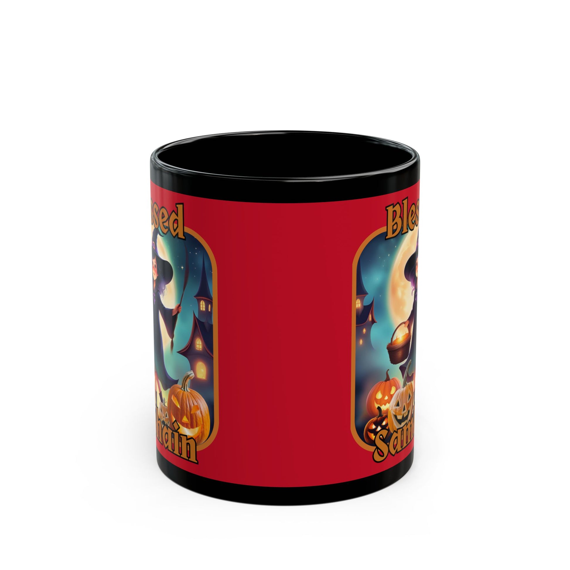 Also available with purple font: Blessed Samhain Little Witch Purple font Red Mug by CreepyCrafts.boo
