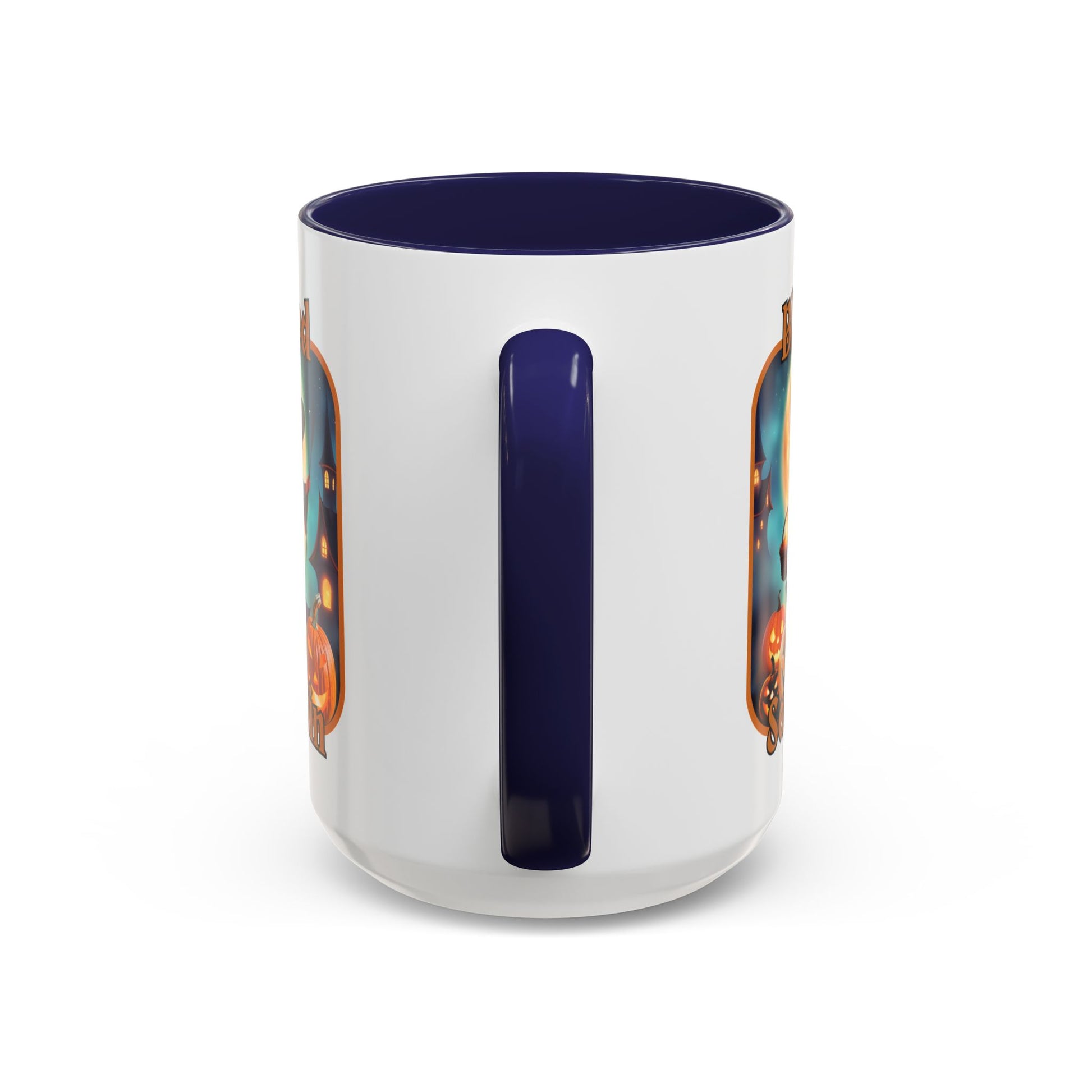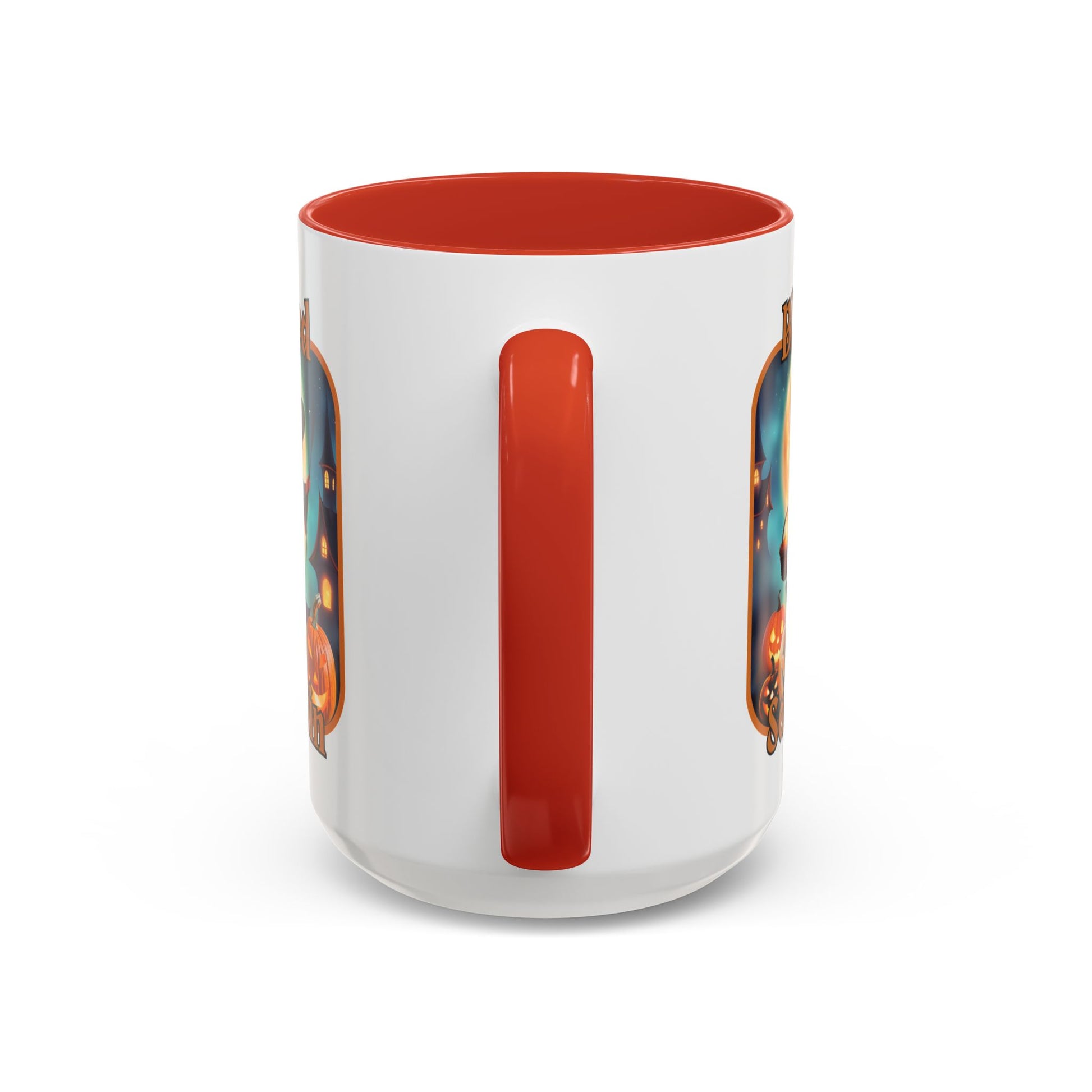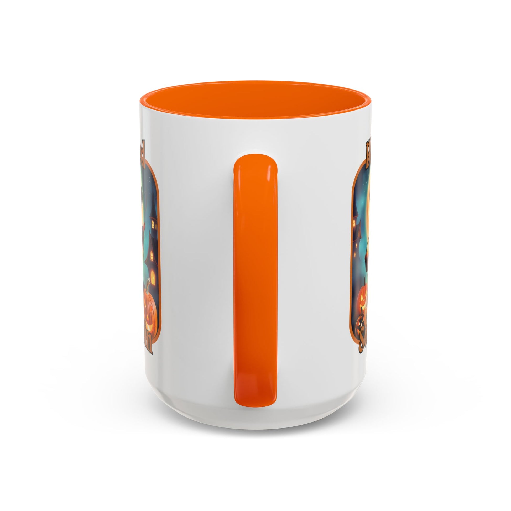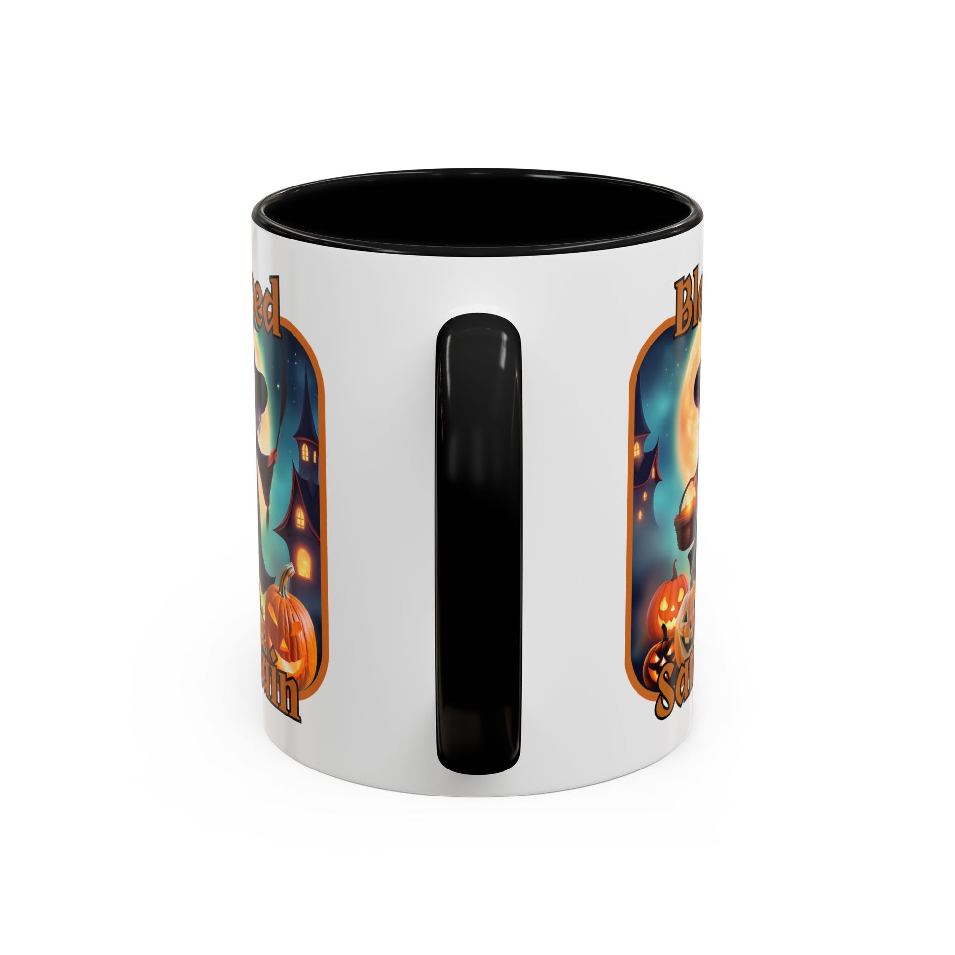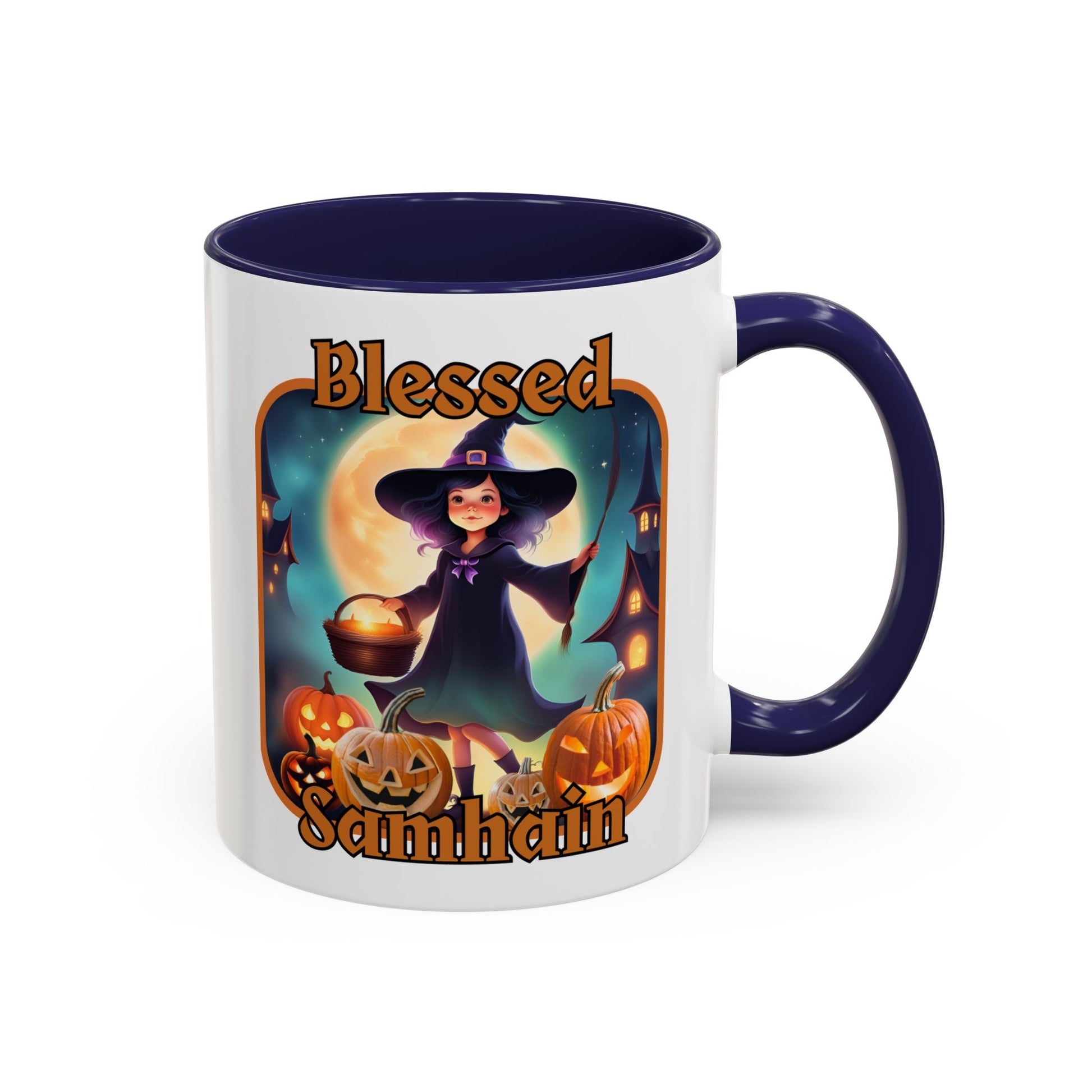 Blessed Samhain Little Witch Orange font White Accent Mug by CreepyCrafts.boo