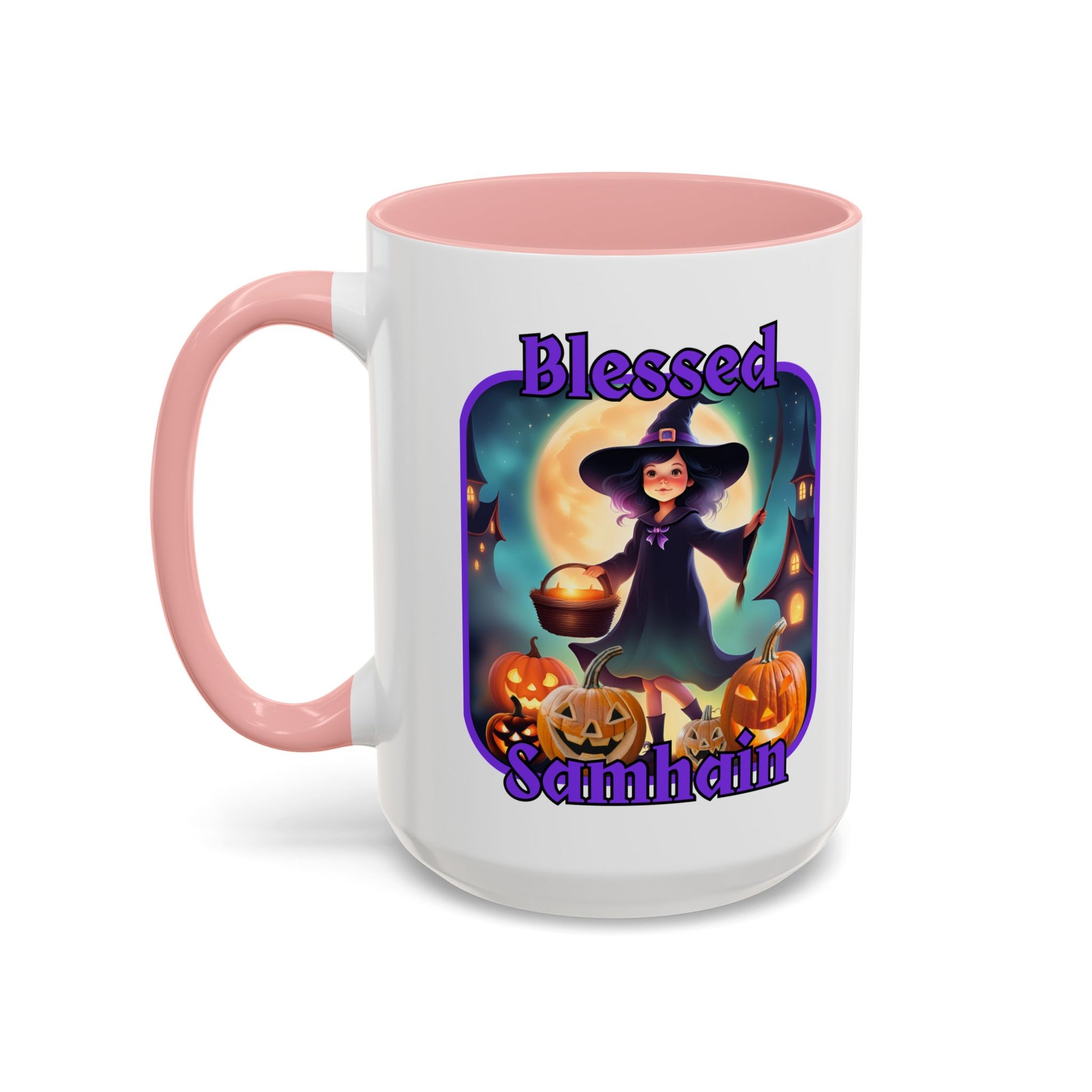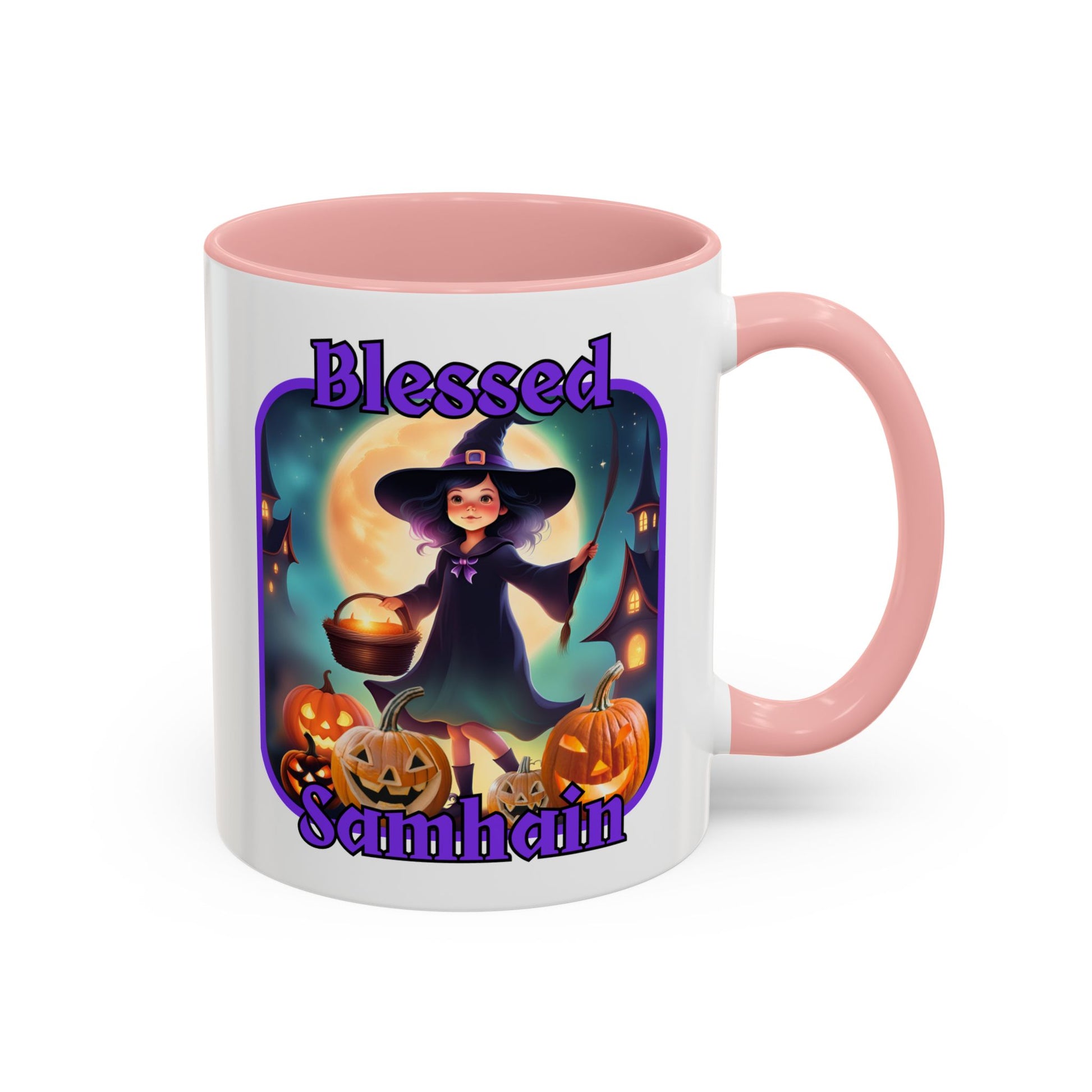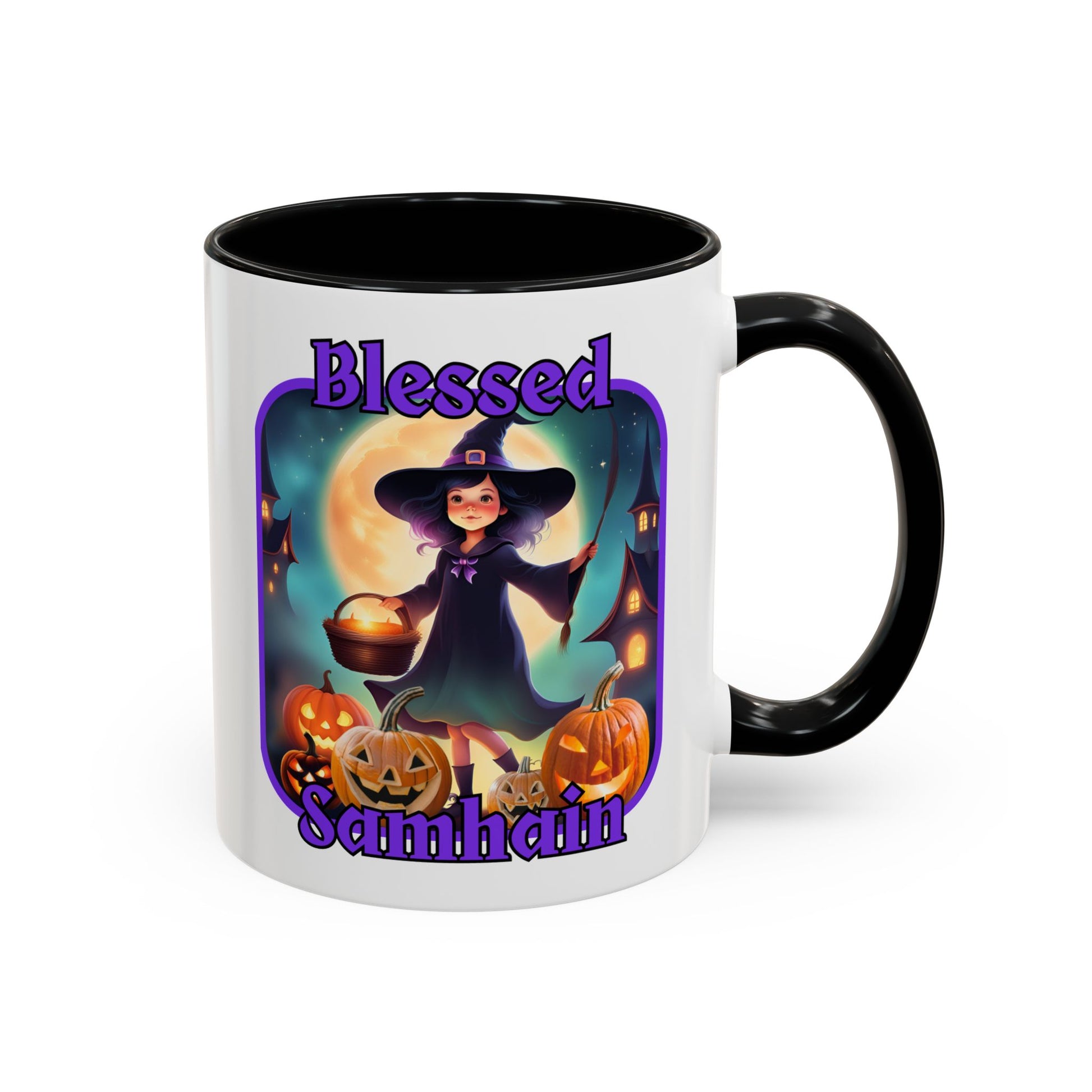 Blessed Samhain Little Witch Purple font White Accent Mug by CreepyCrafts.boo