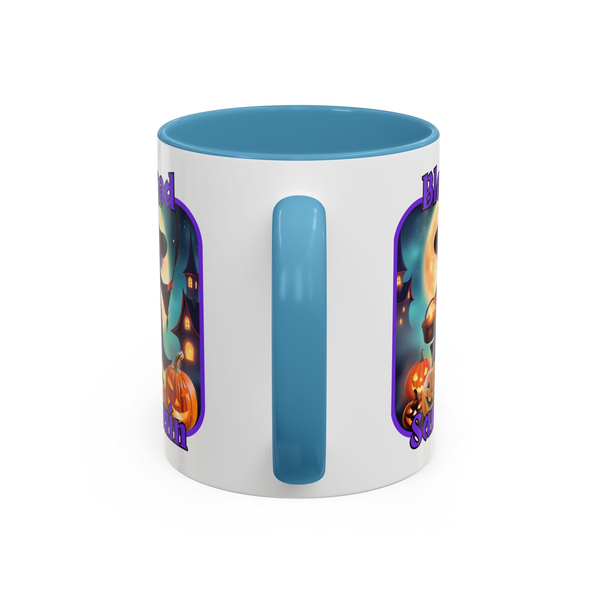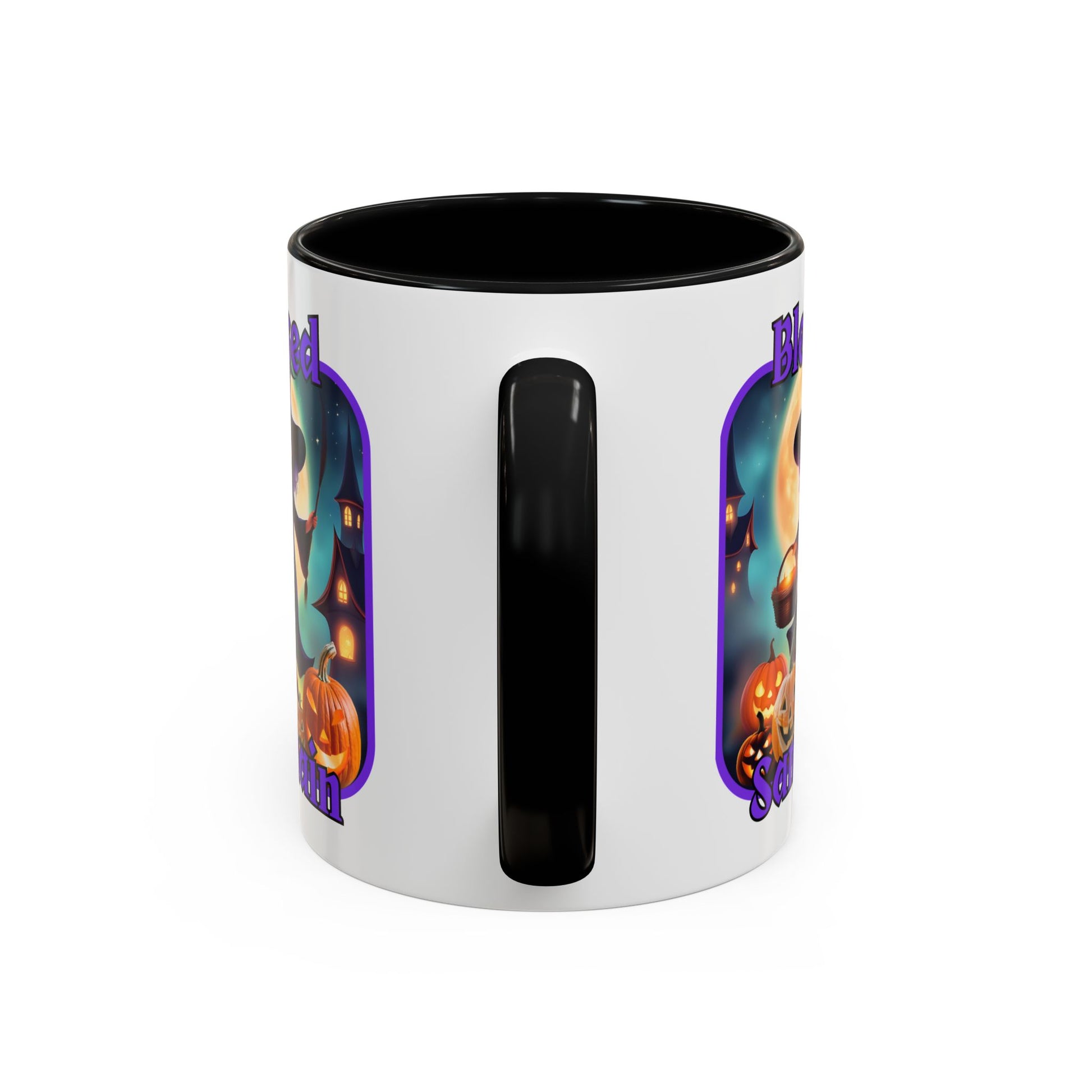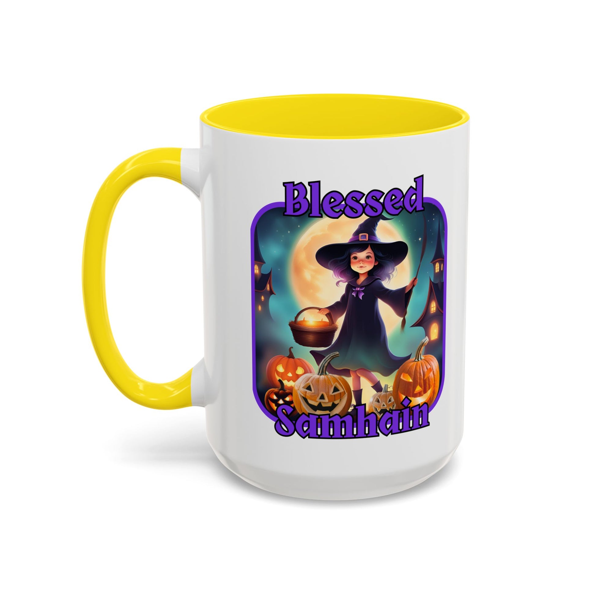 Blessed Samhain Little Witch Purple font White Accent Mug by CreepyCrafts.boo