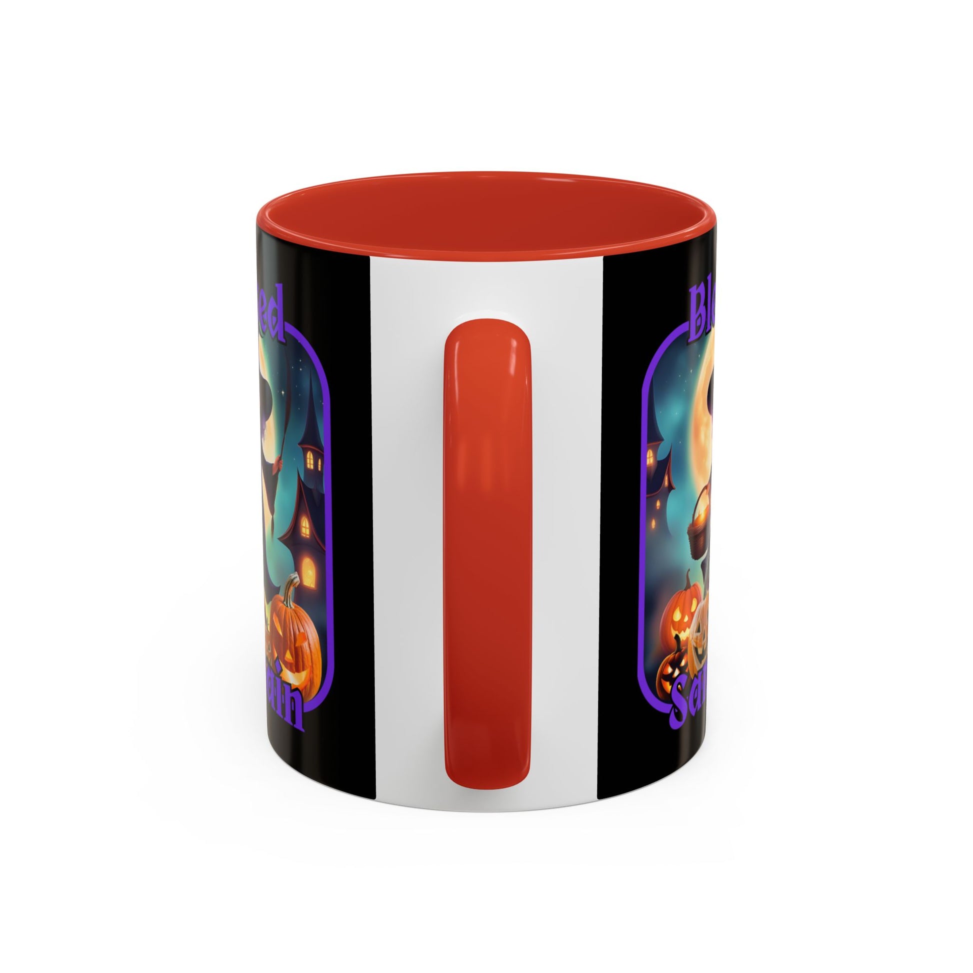 Or how about in traditional Samhain red with an accent of color: Blessed Samhain Little Witch Purple font Red Accent Mug by CreepyCrafts.boo