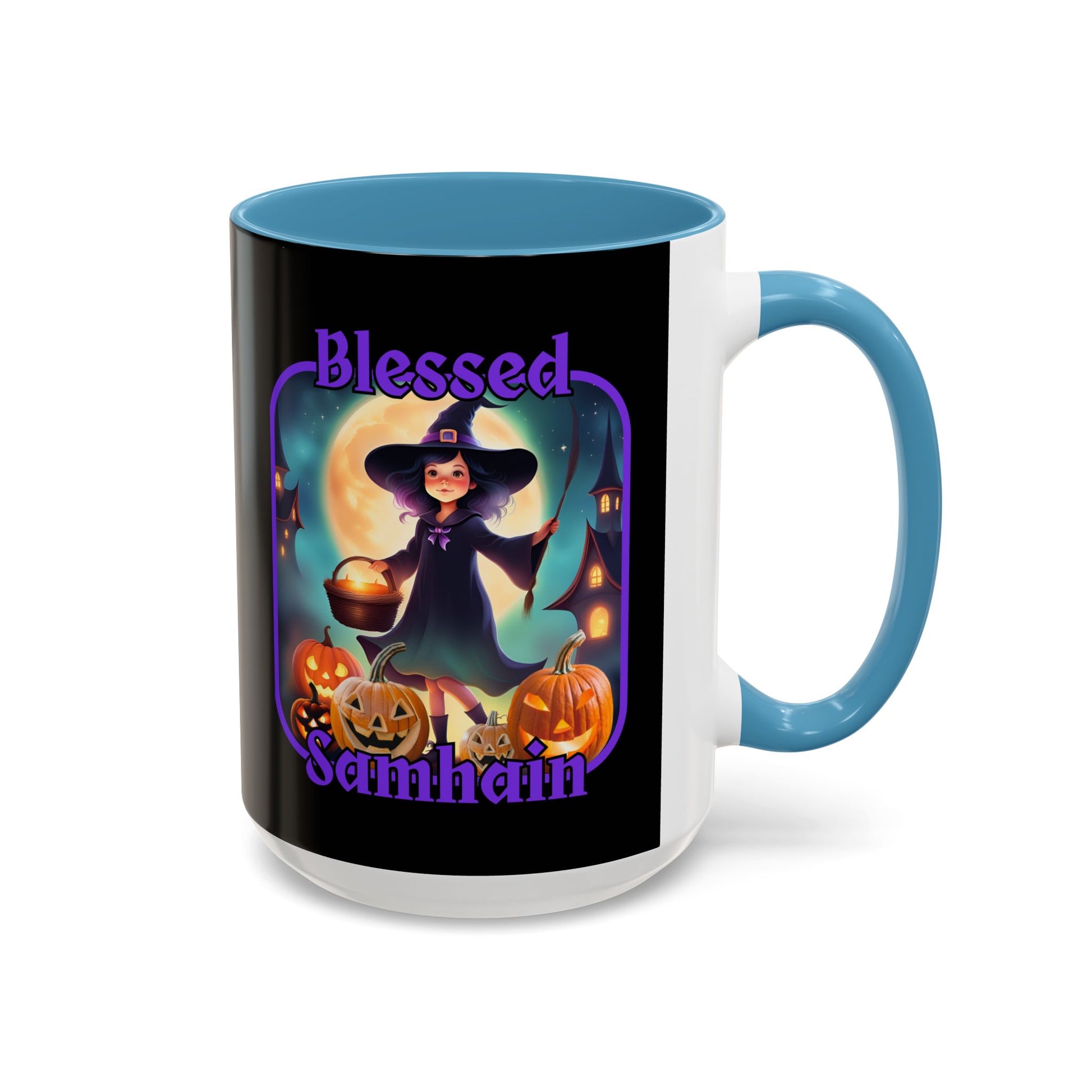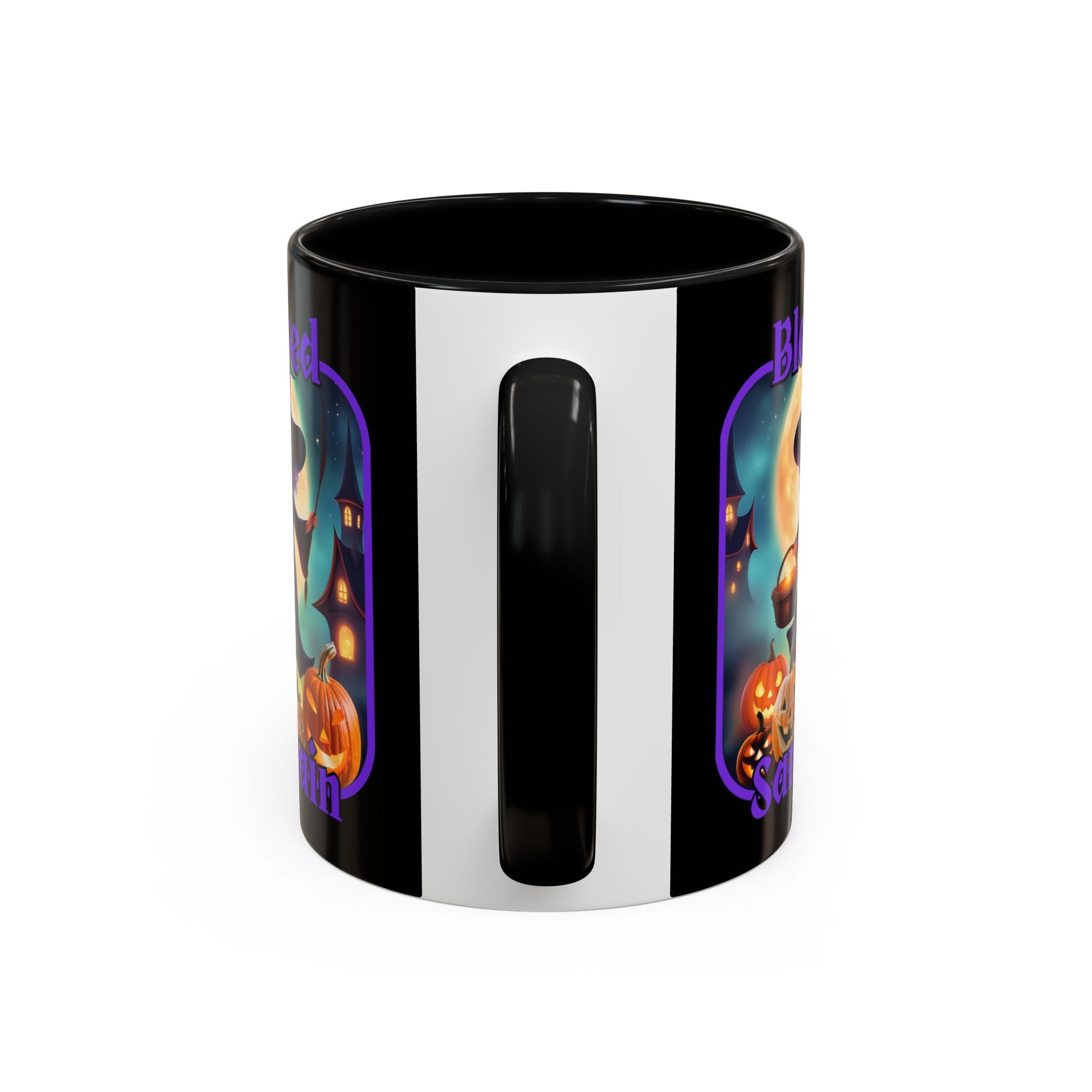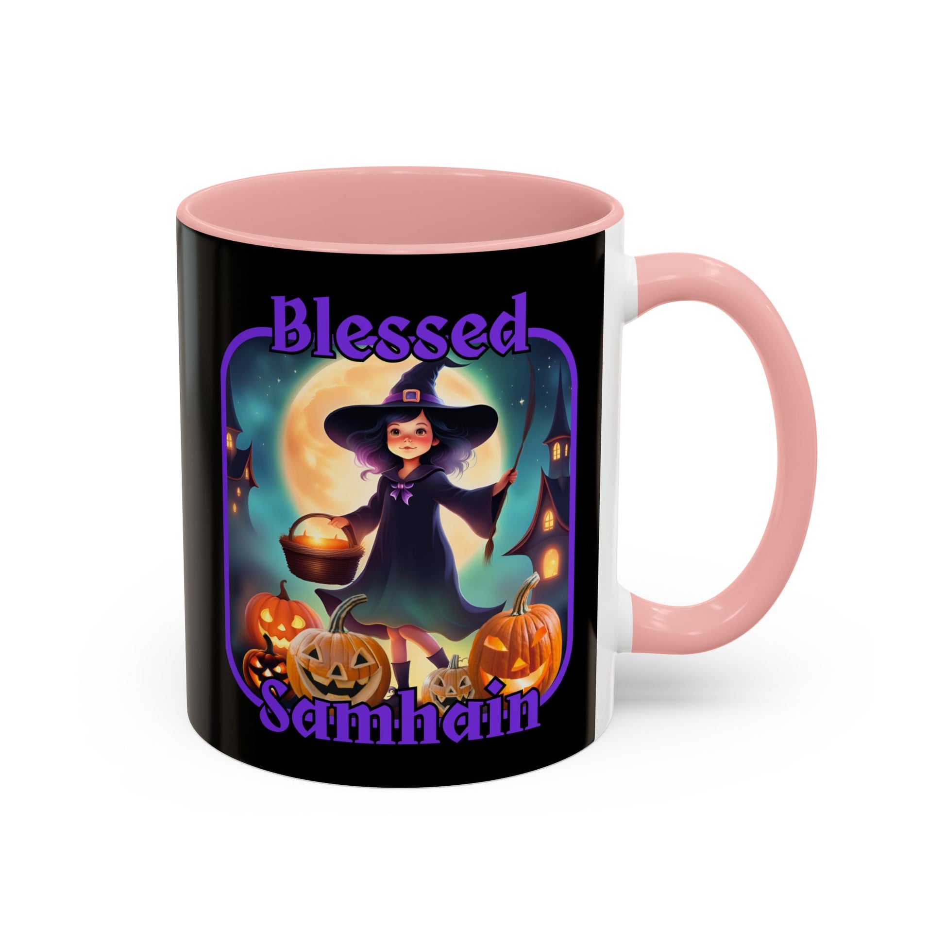 Blessed Samhain Little Witch Purple font Black Accent Mug by CreepyCrafts.boo