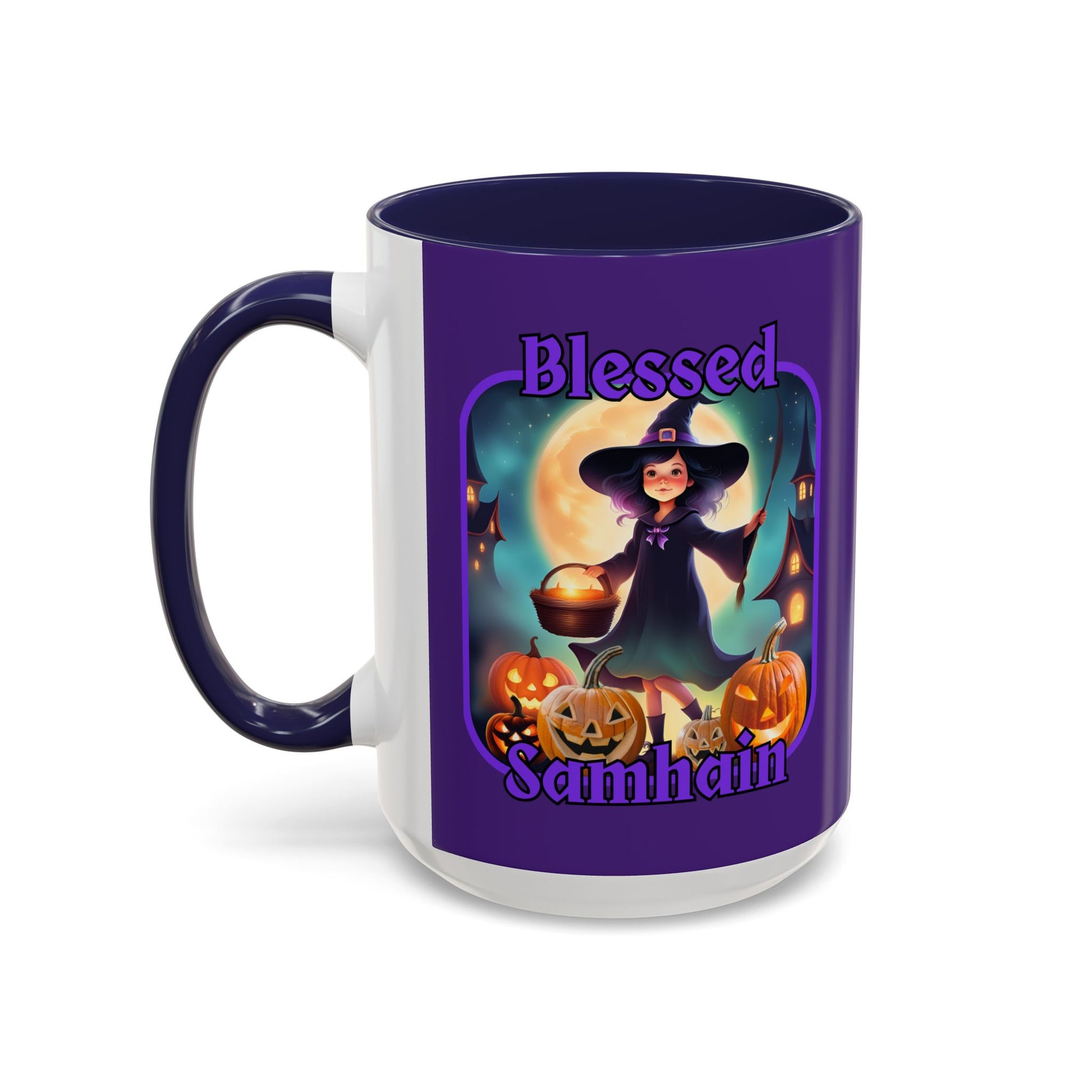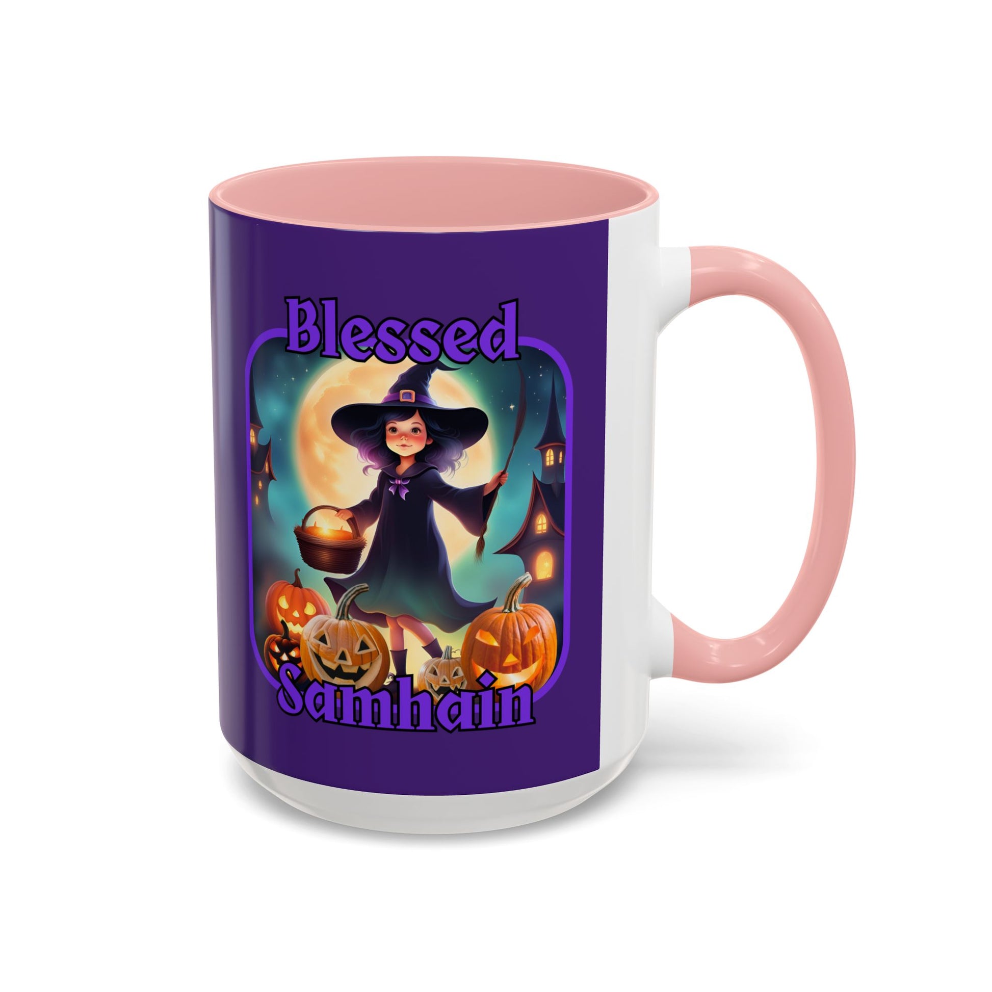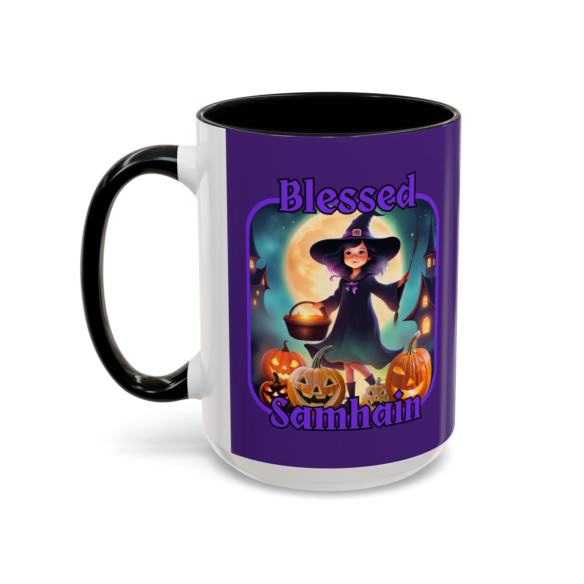 Blessed Samhain Little Witch Purple font Purple Accent Mug by CreepyCrafts.boo