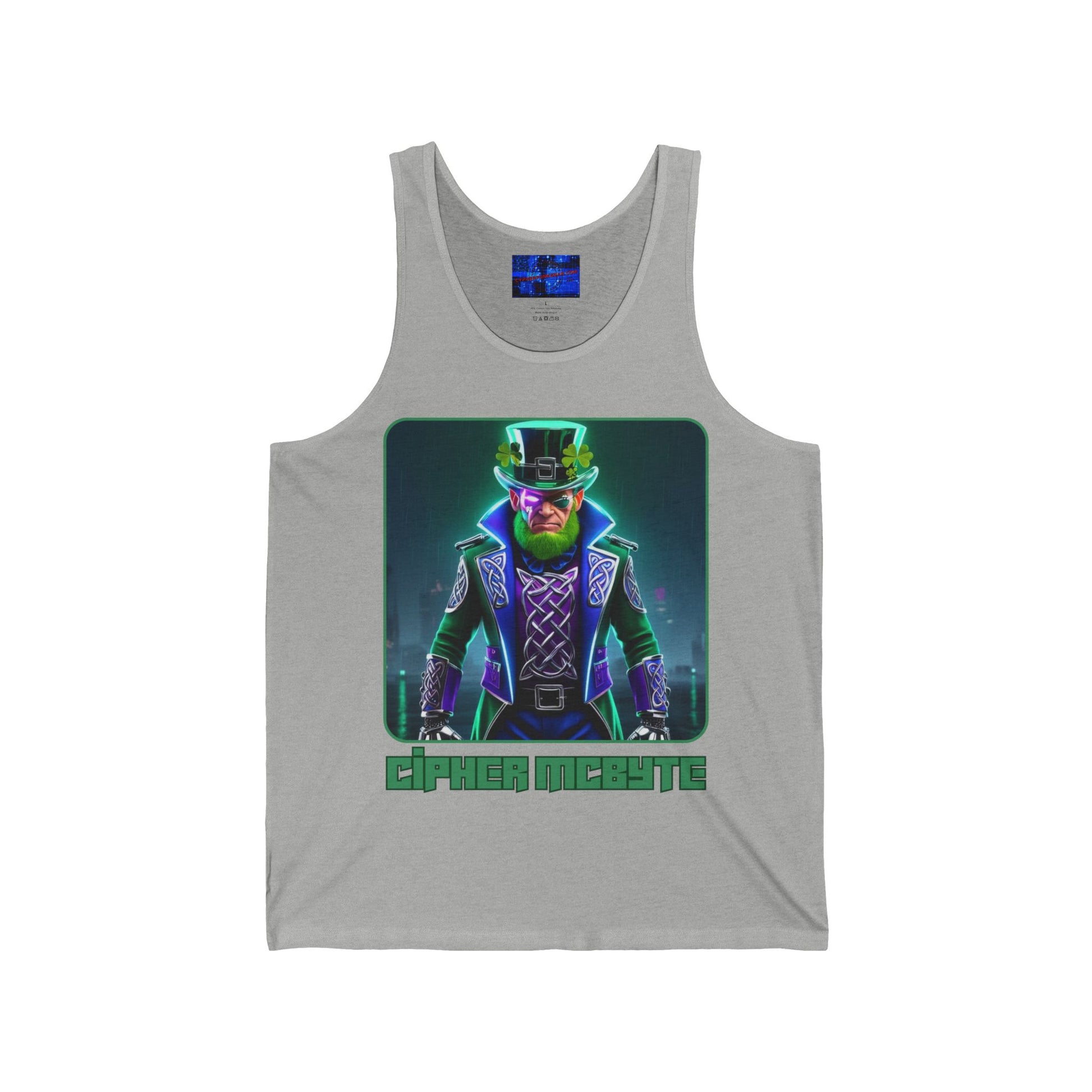 Step into the future with Cipher McByte, the tech-savvy, cyberpunk leprechaun who's hodling his pot of crypto and hacking his way through neon-drenched streets. Cipher’s always got a trick up his sleeve, merging his futuristic vibes with a bit of Irish mischief. Unlock your St Paddy's Day style and your luck with Cipher McByte Unisex Jersey Tank Top by cypherpunkgear.com