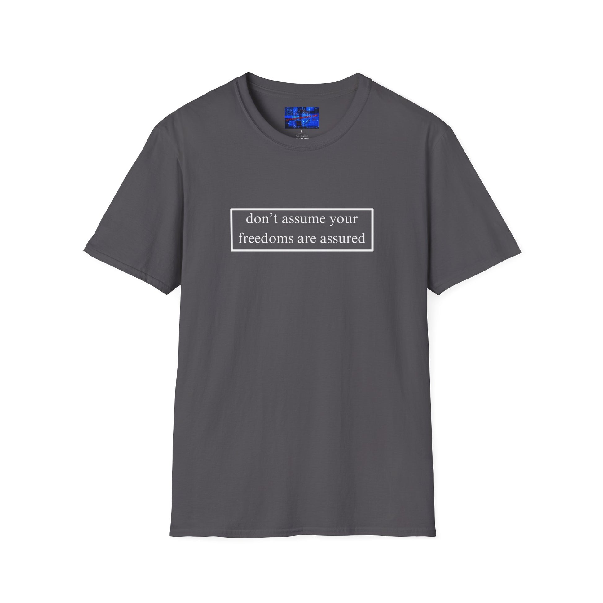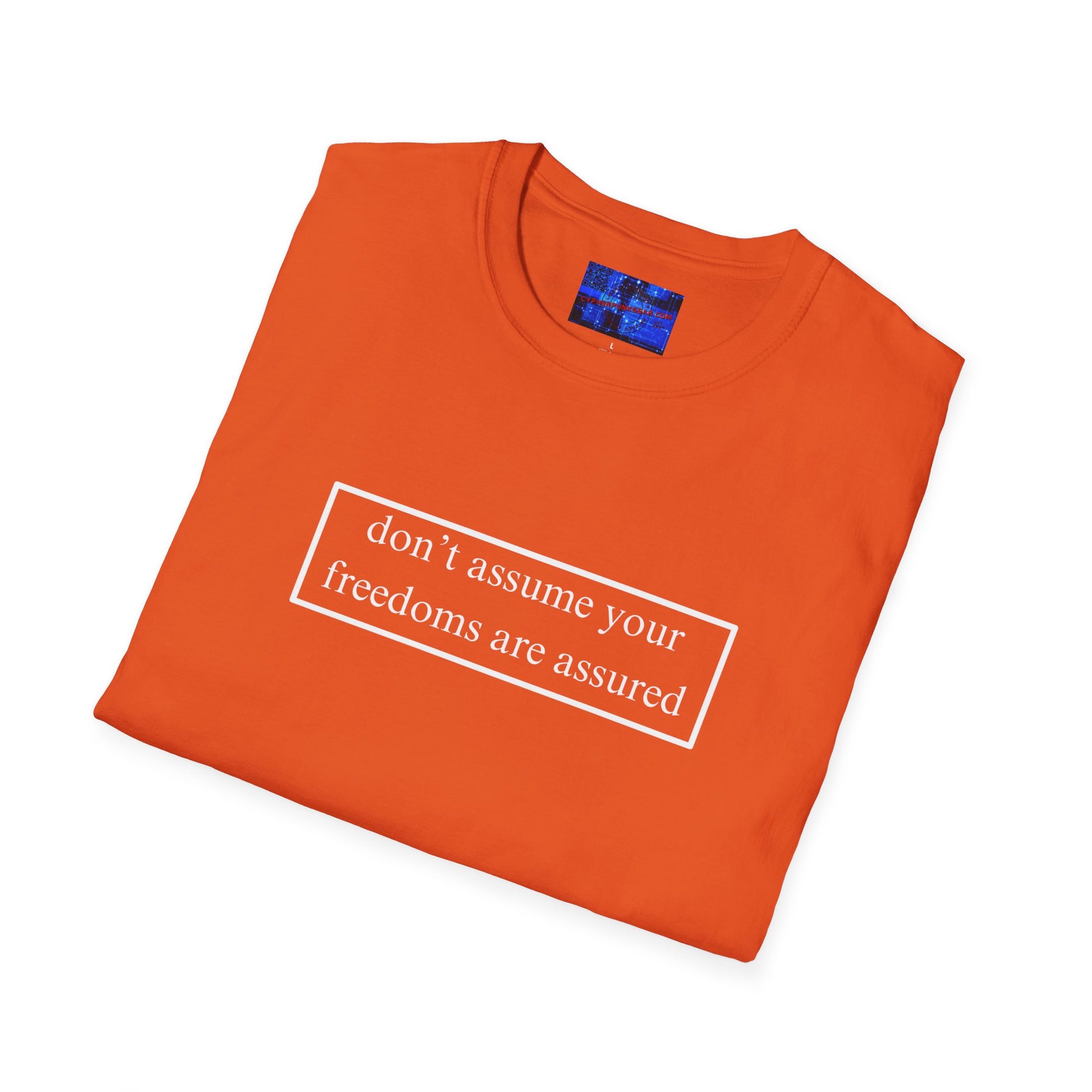 Make a simple but profound statement with, don't assume your freedoms are assured, Dark colors, White font, Unisex T-Shirt by cypherpunkgear.com