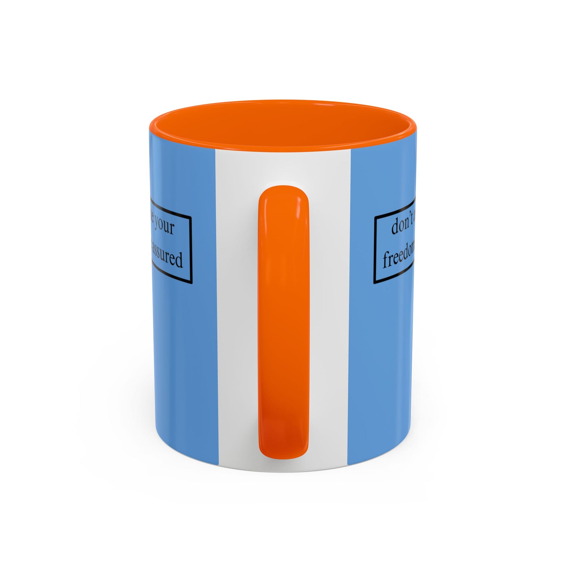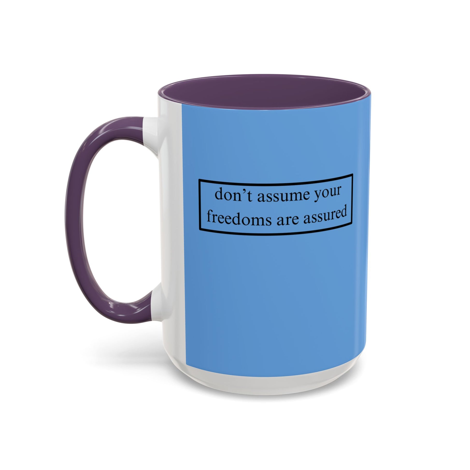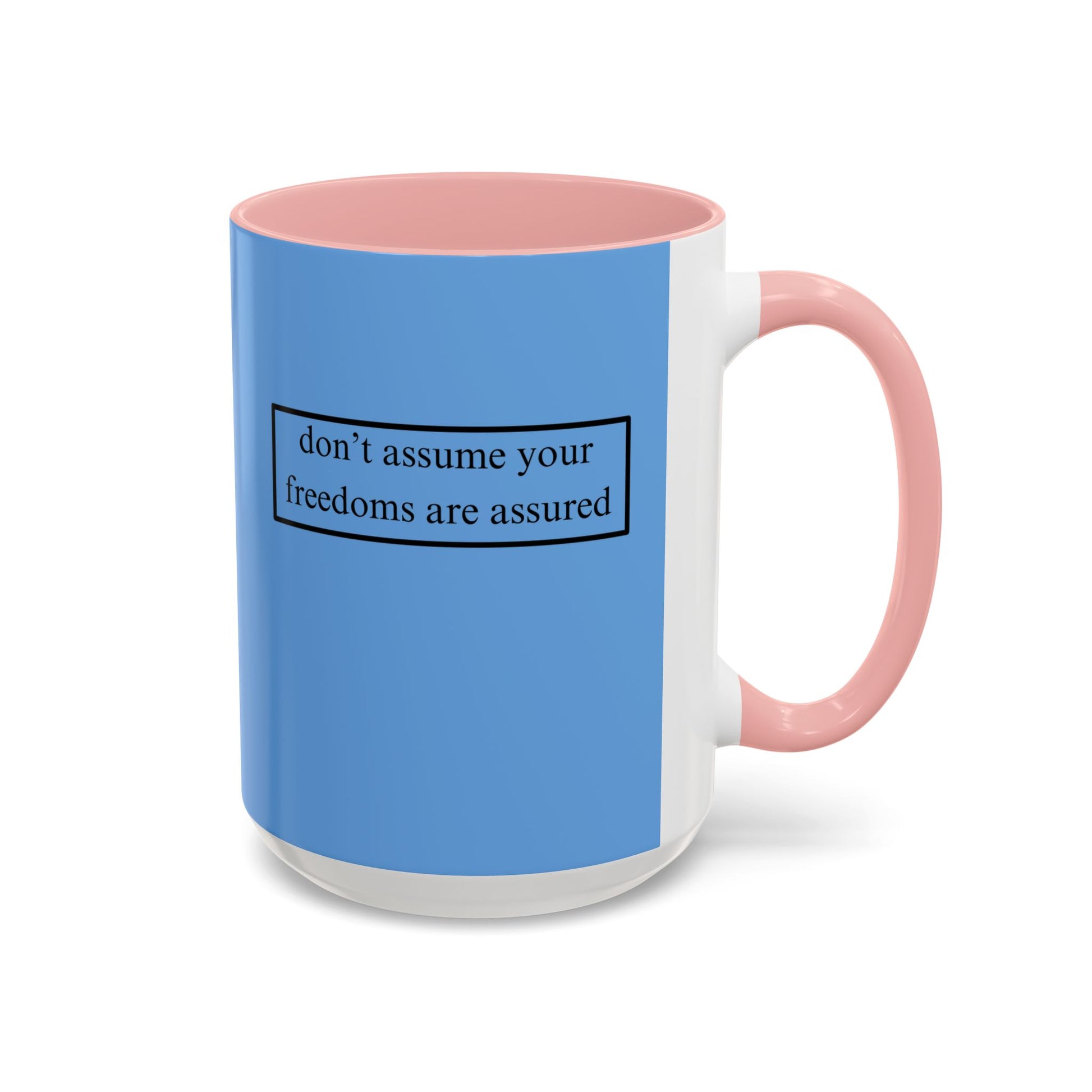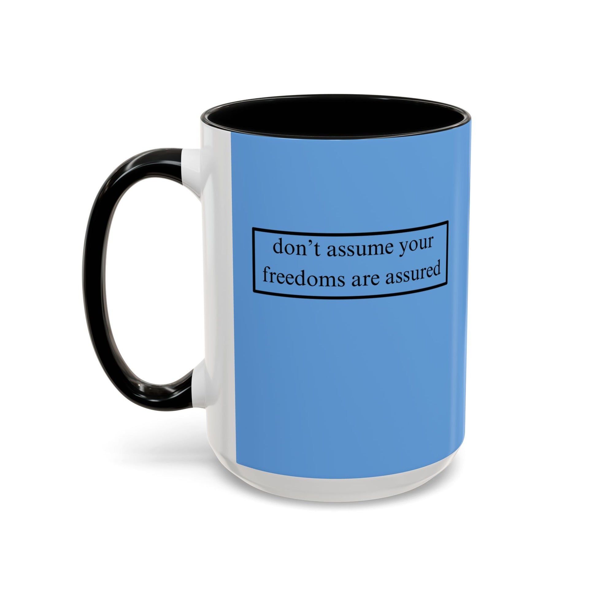 A simple but important message don't assume your freedoms are assured, Black font, Light Blue Accent Mug by cypherpunkgear.com