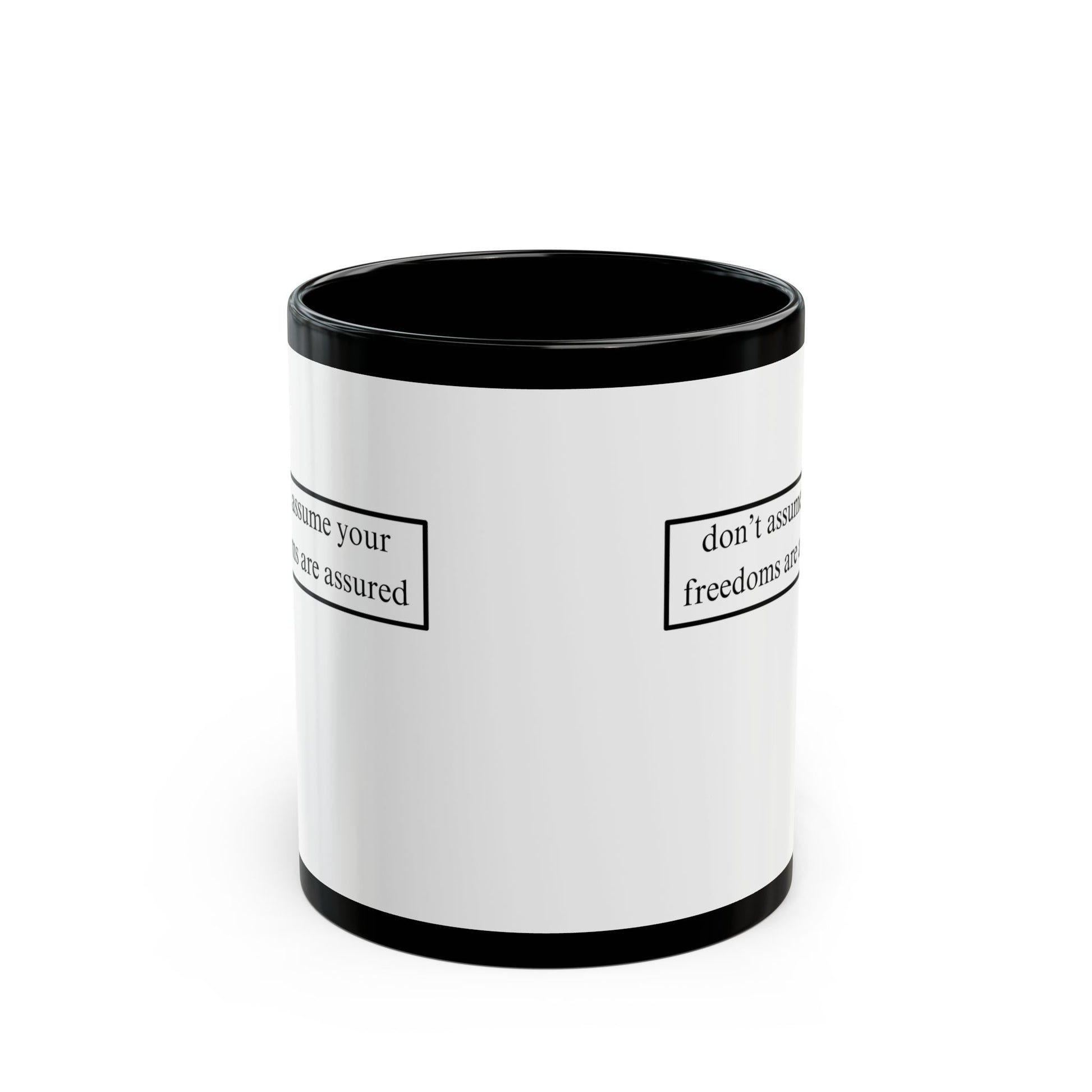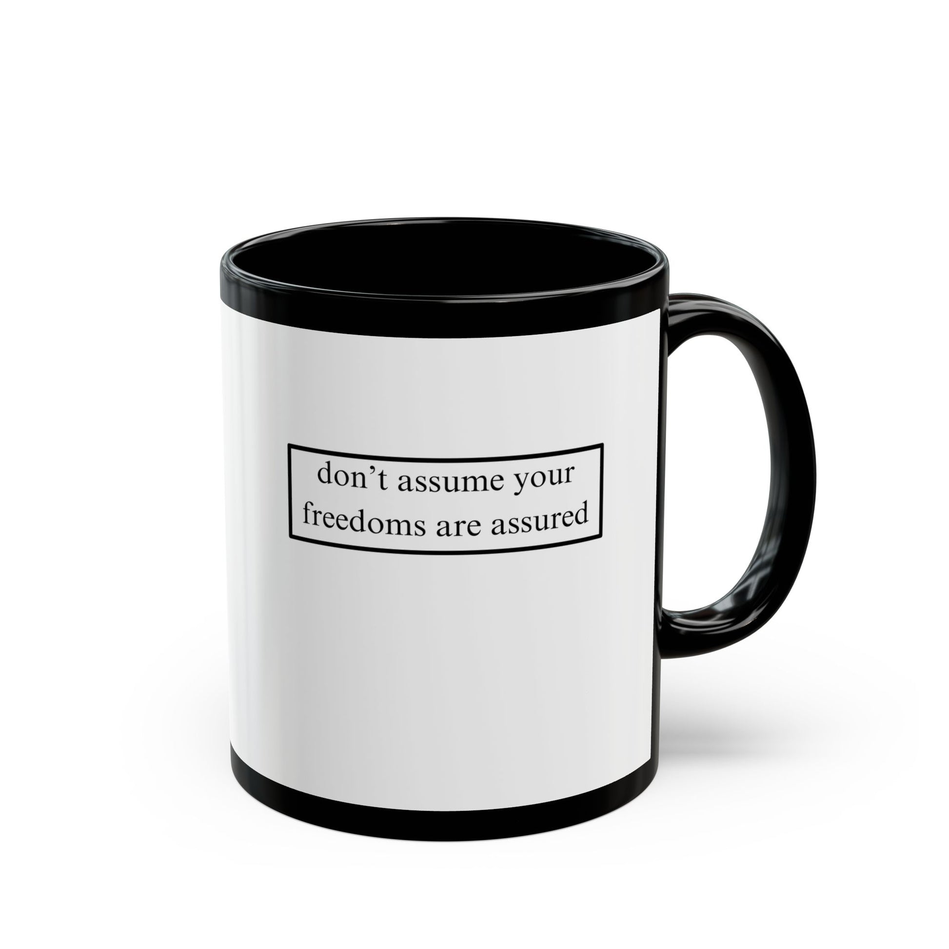 A simple but important message don't assume your freedoms are assured, Black font, White/Black Mug by cypherpunkgear.com