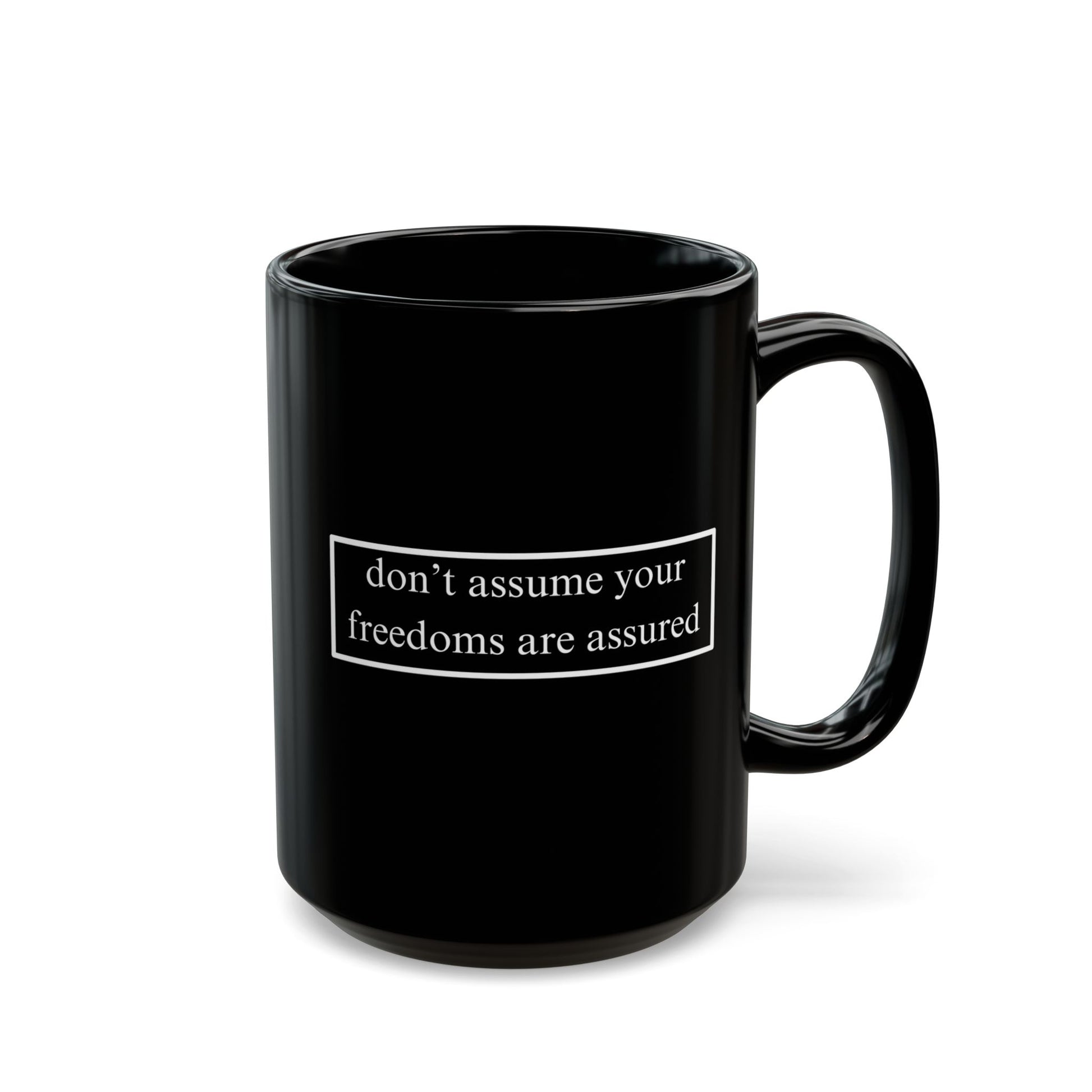 don't assume your freedoms are assured, White font, Black Mug by cypherpunkgear.com