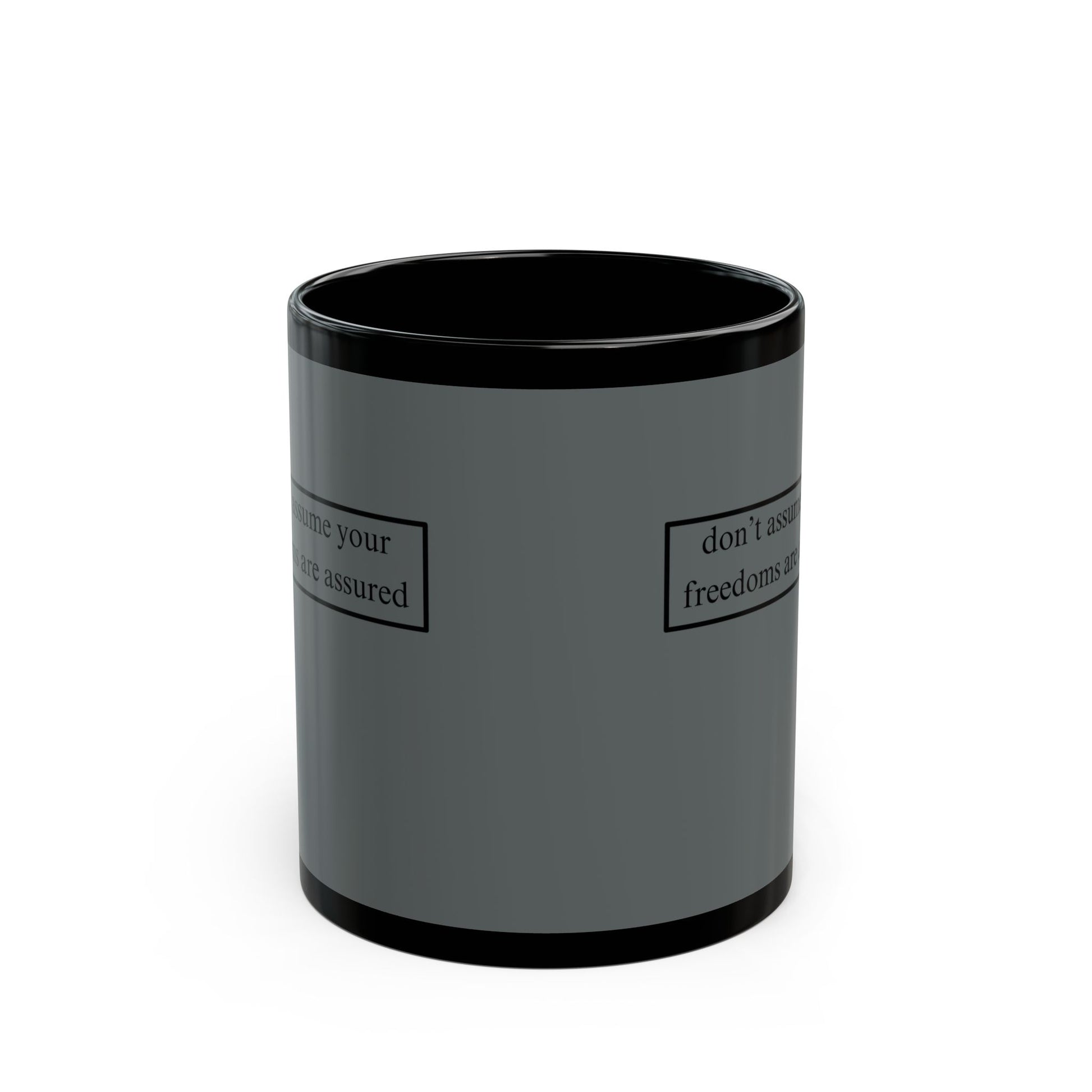 A simple but important message don't assume your freedoms are assured, Black font, Grey/Black Mug by cypherpunkgear.com