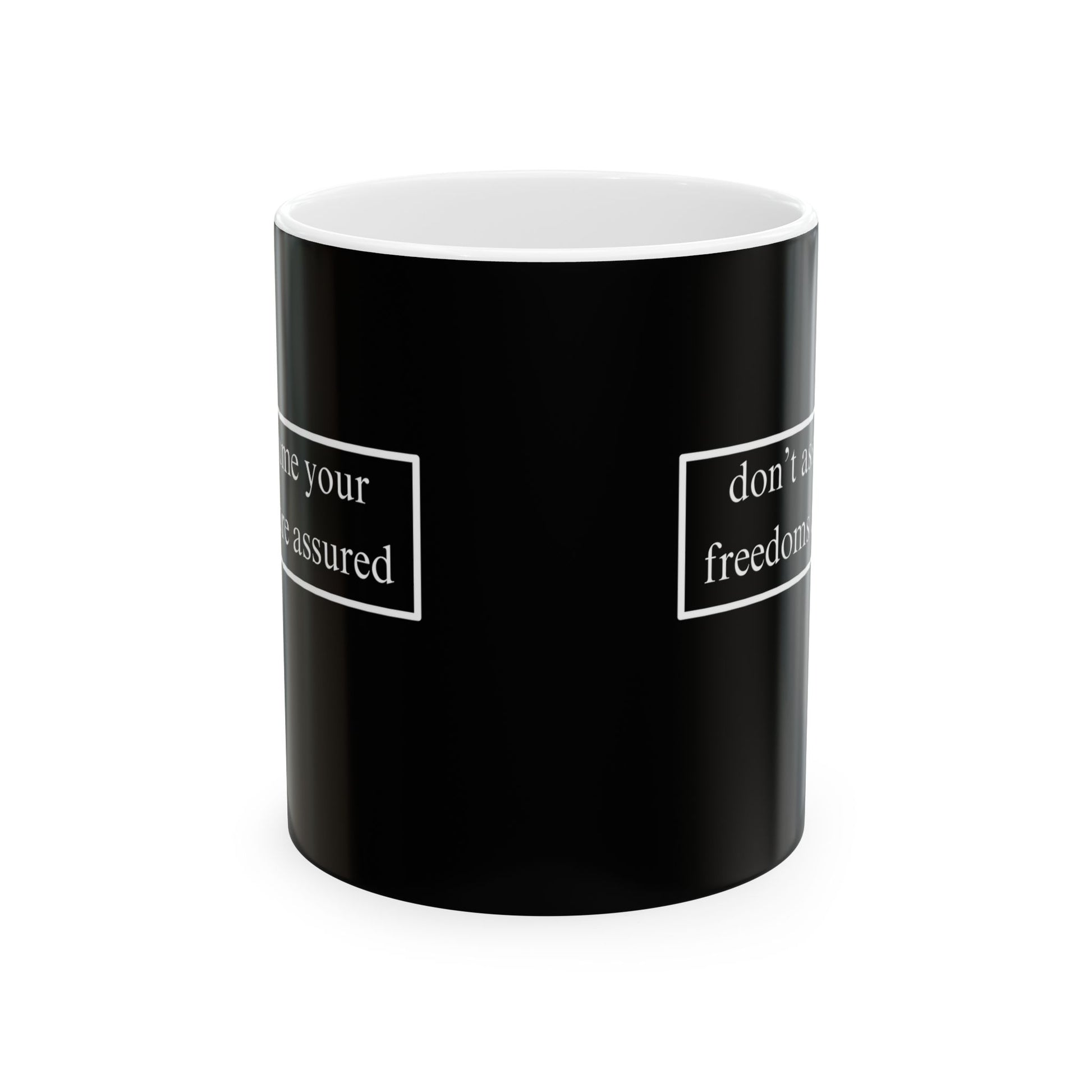 A simple but important message don't assume your freedoms are assured, White font, Black/White Mug by cypherpunkgear.com