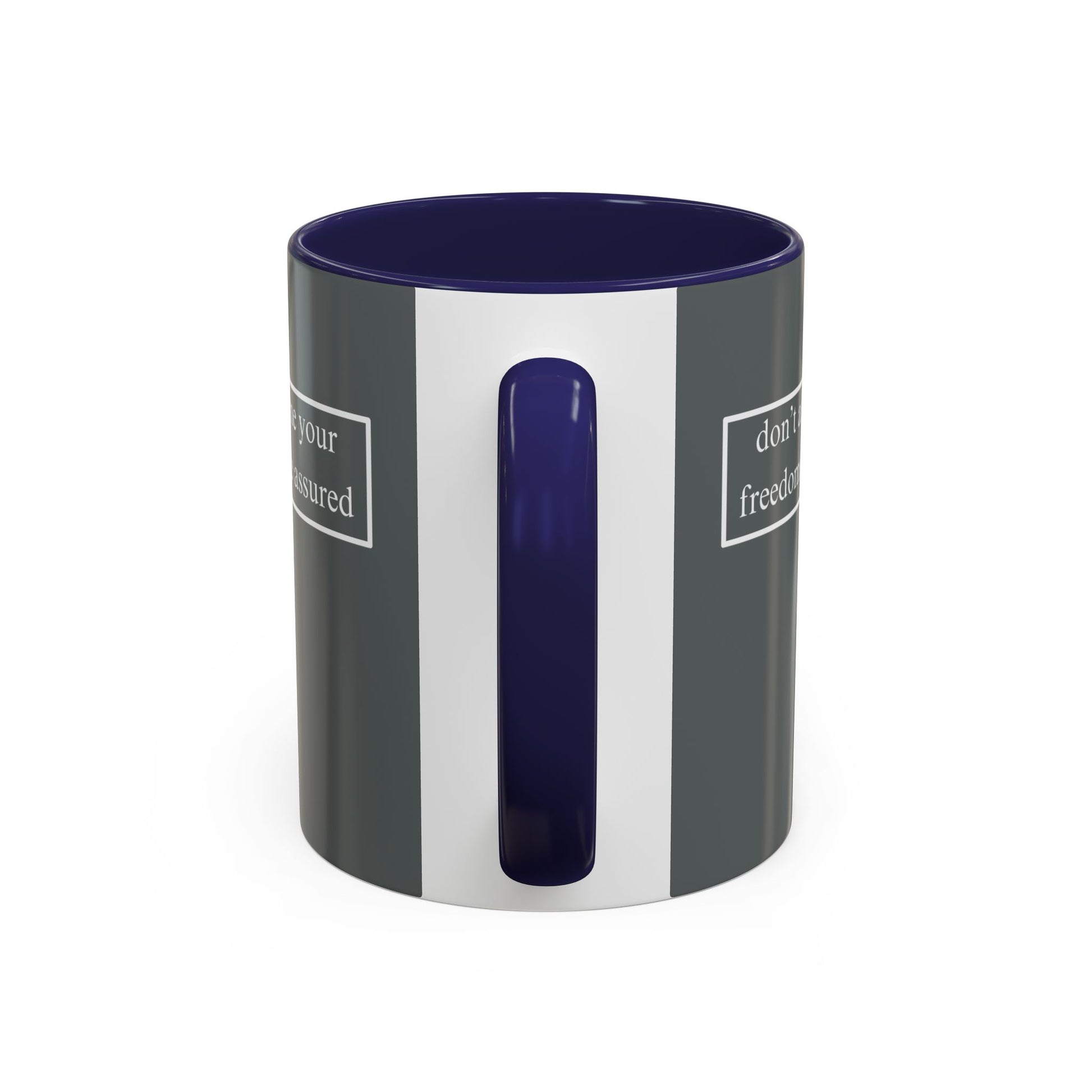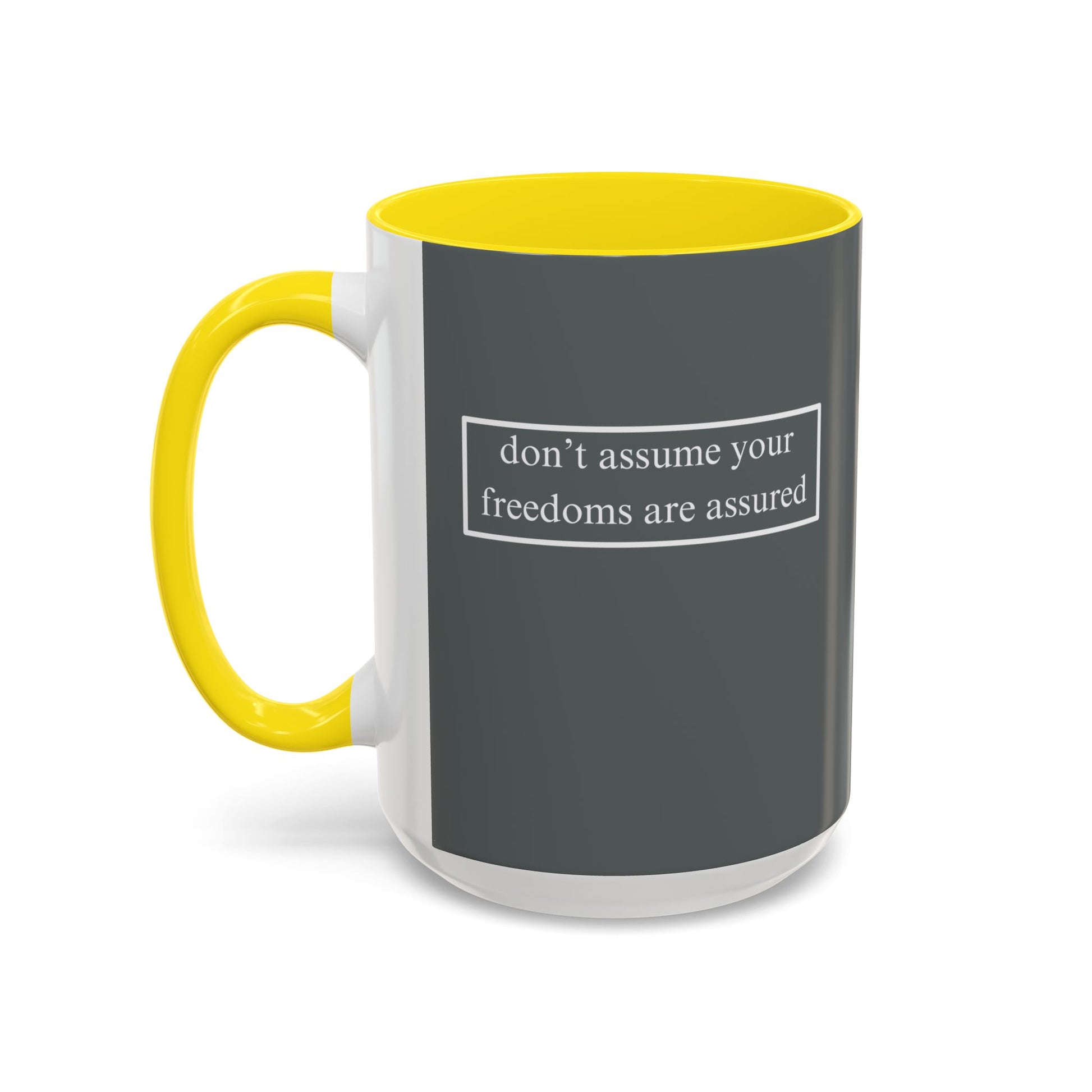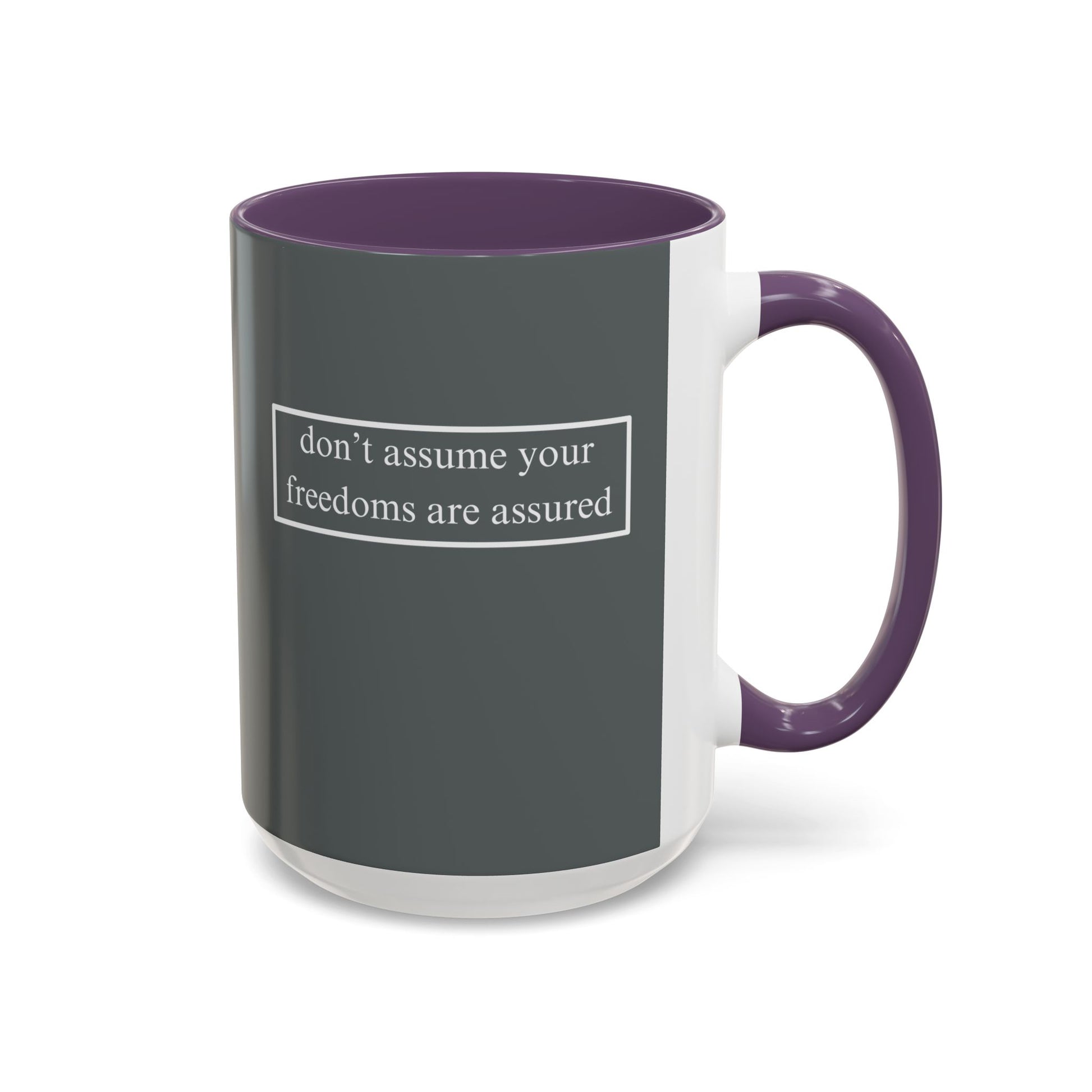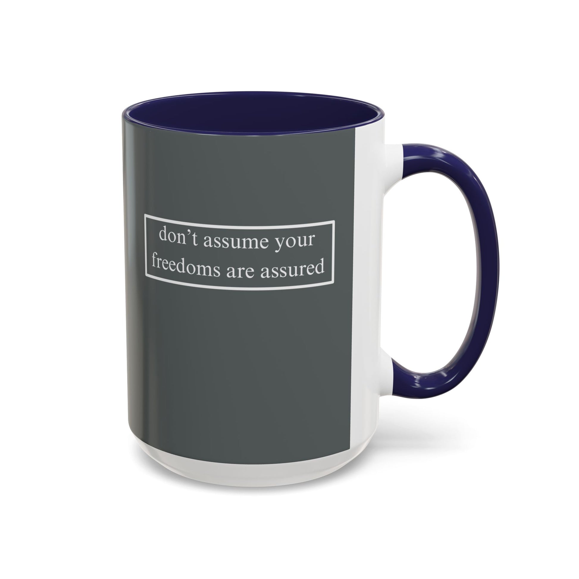 don't assume your freedoms are assured, White font, Grey Accent Mug by cypherpunkgear.com