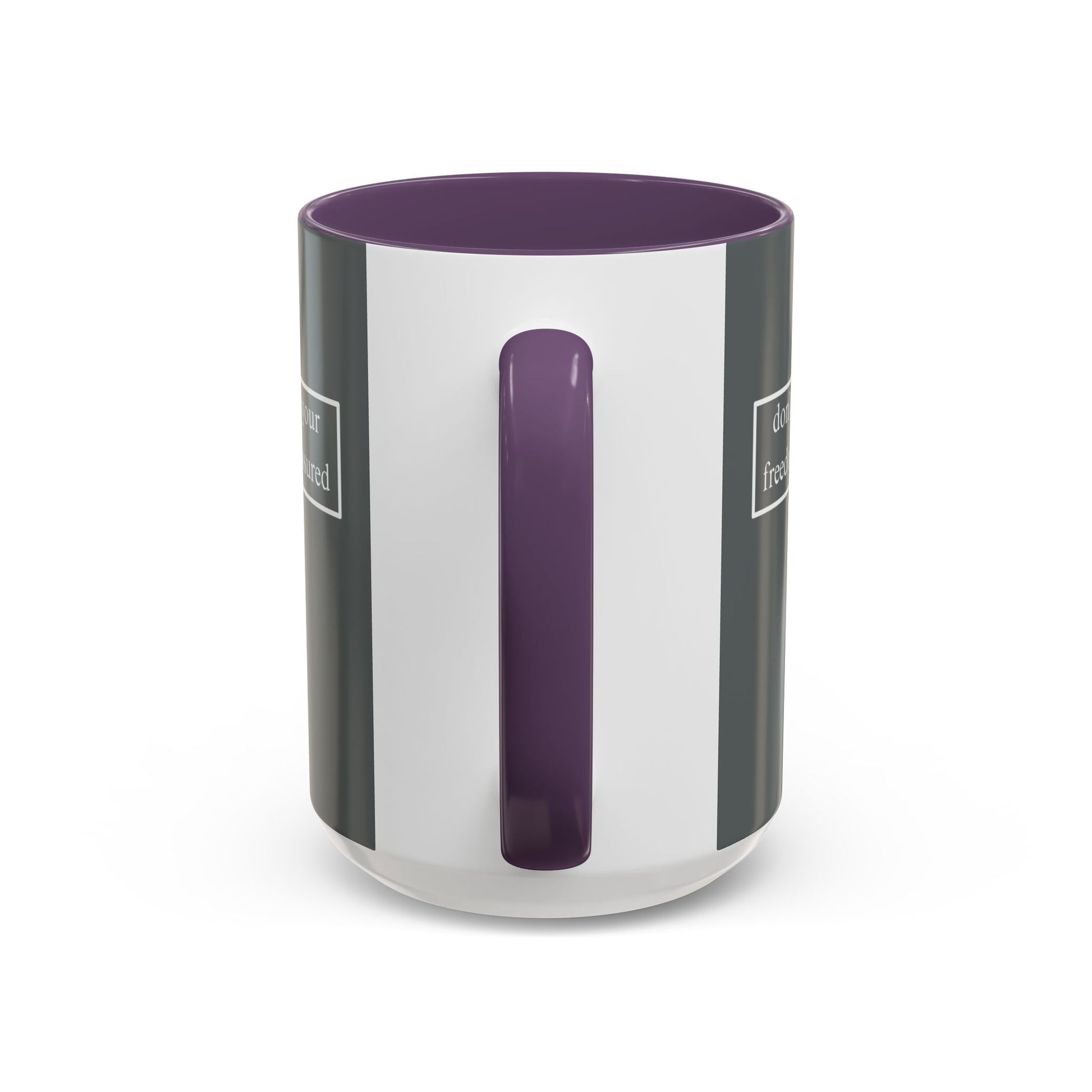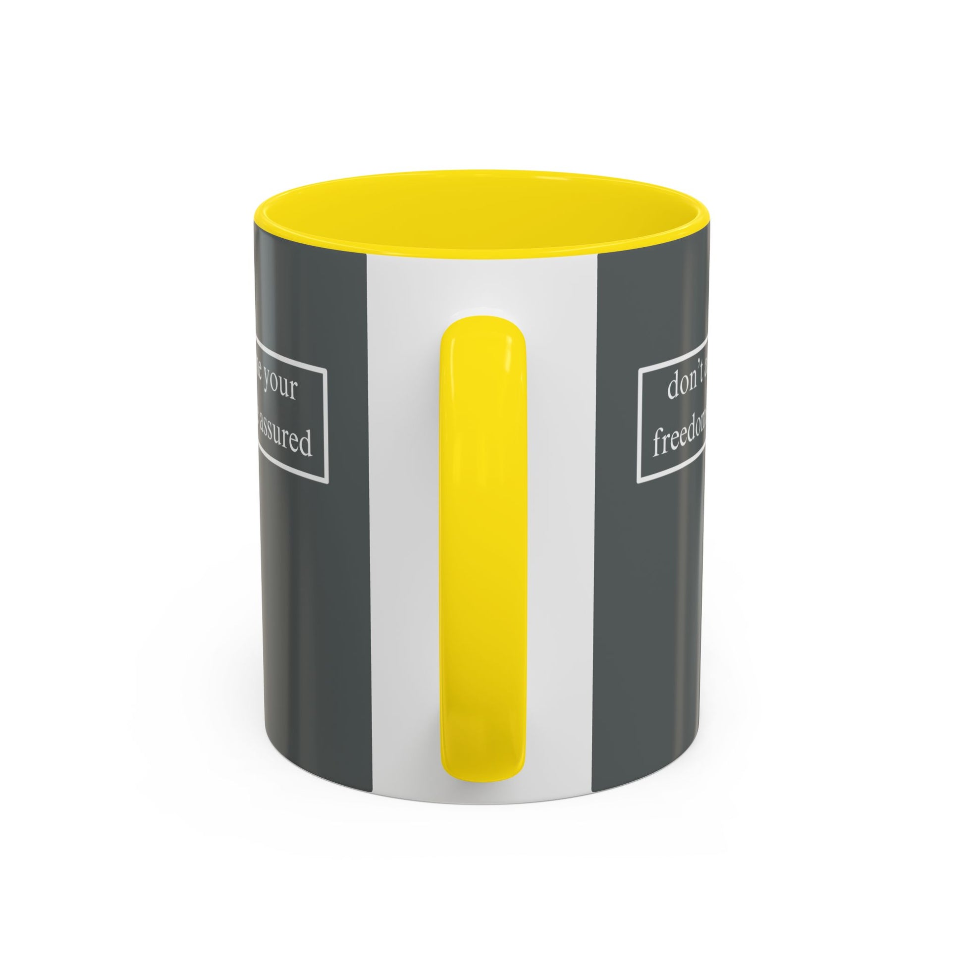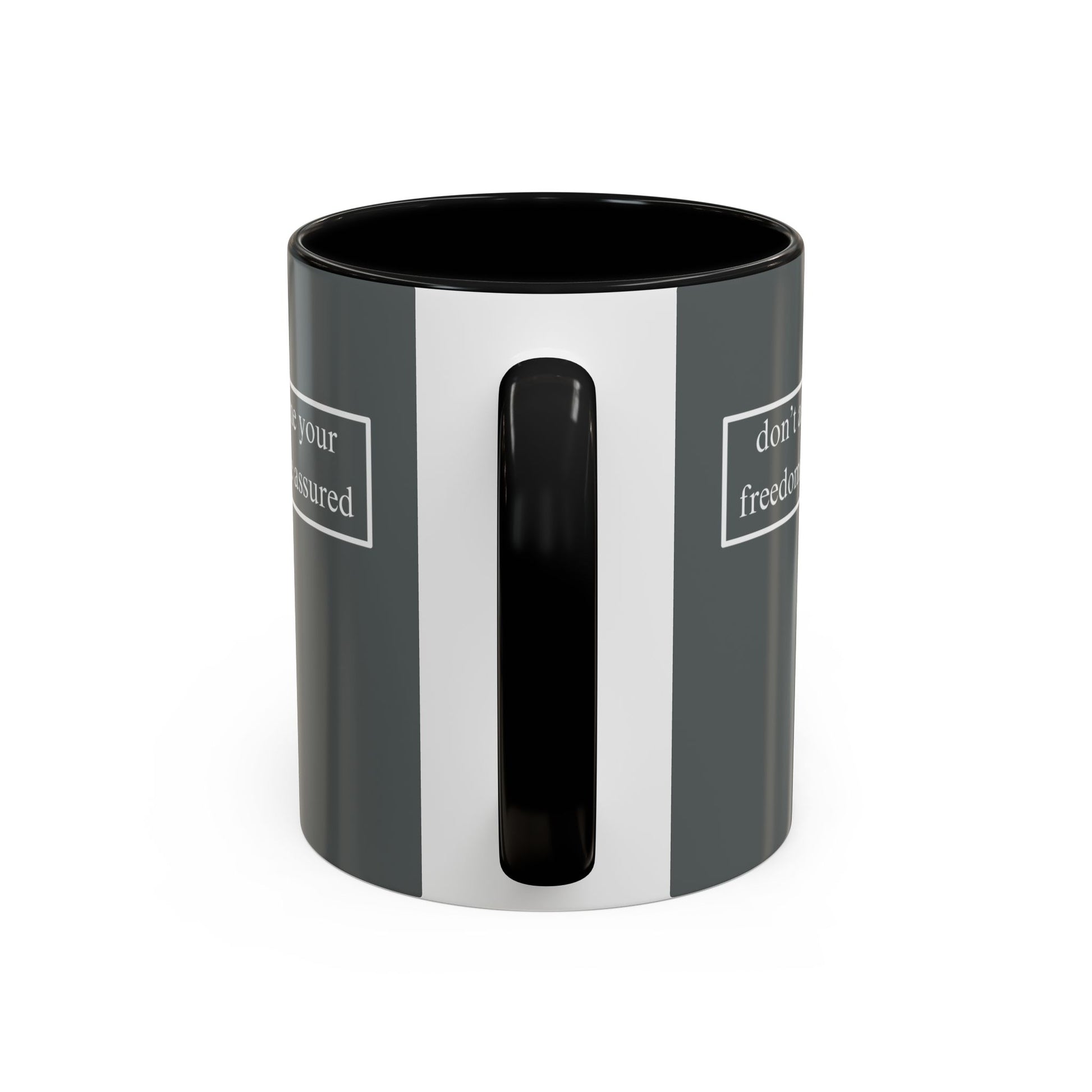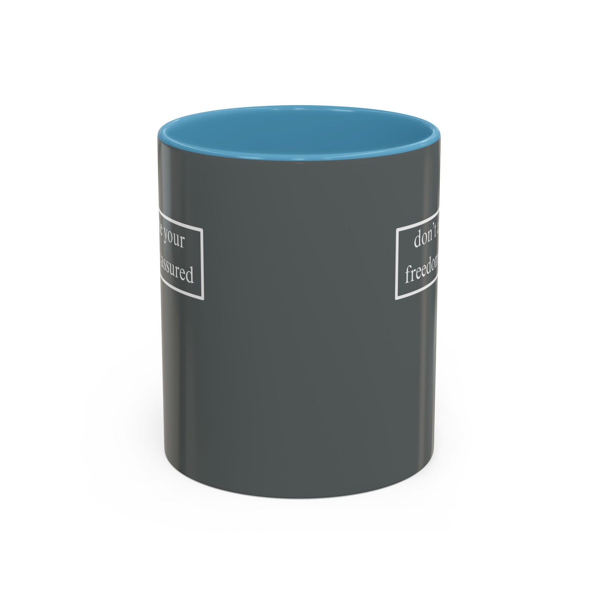 don't assume your freedoms are assured, White font, Grey Accent Mug by cypherpunkgear.com