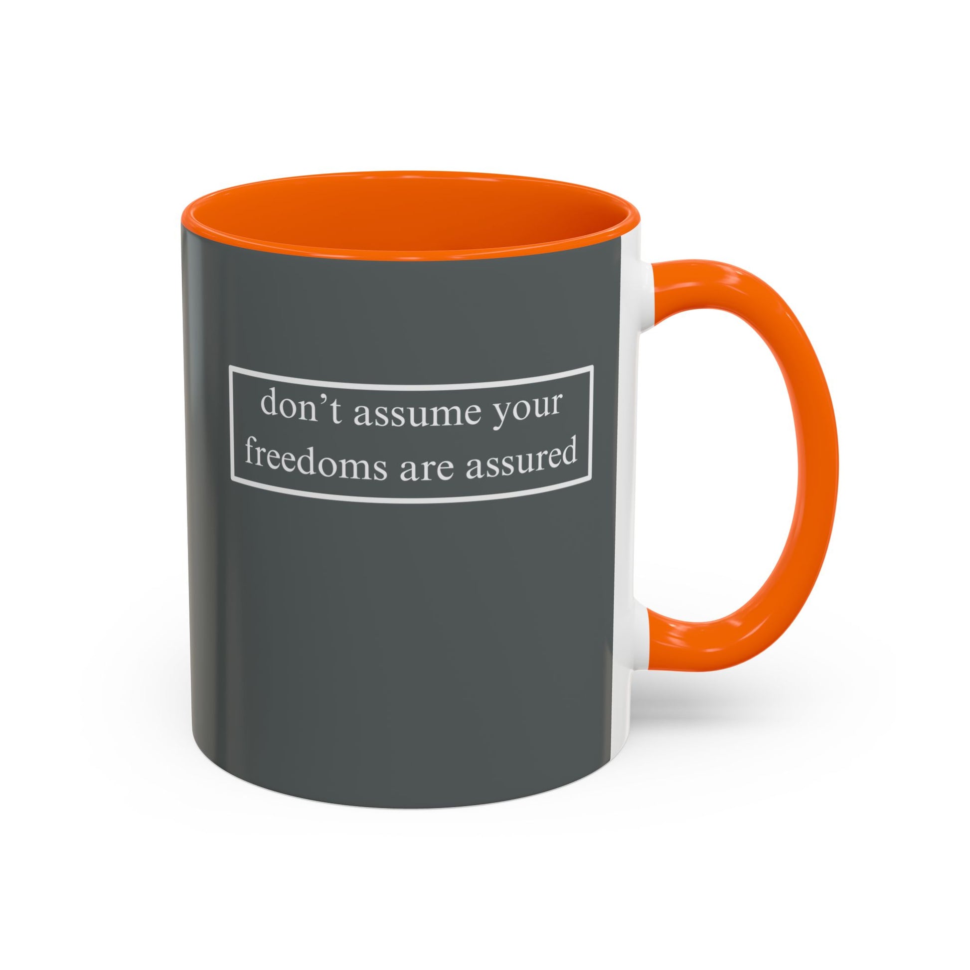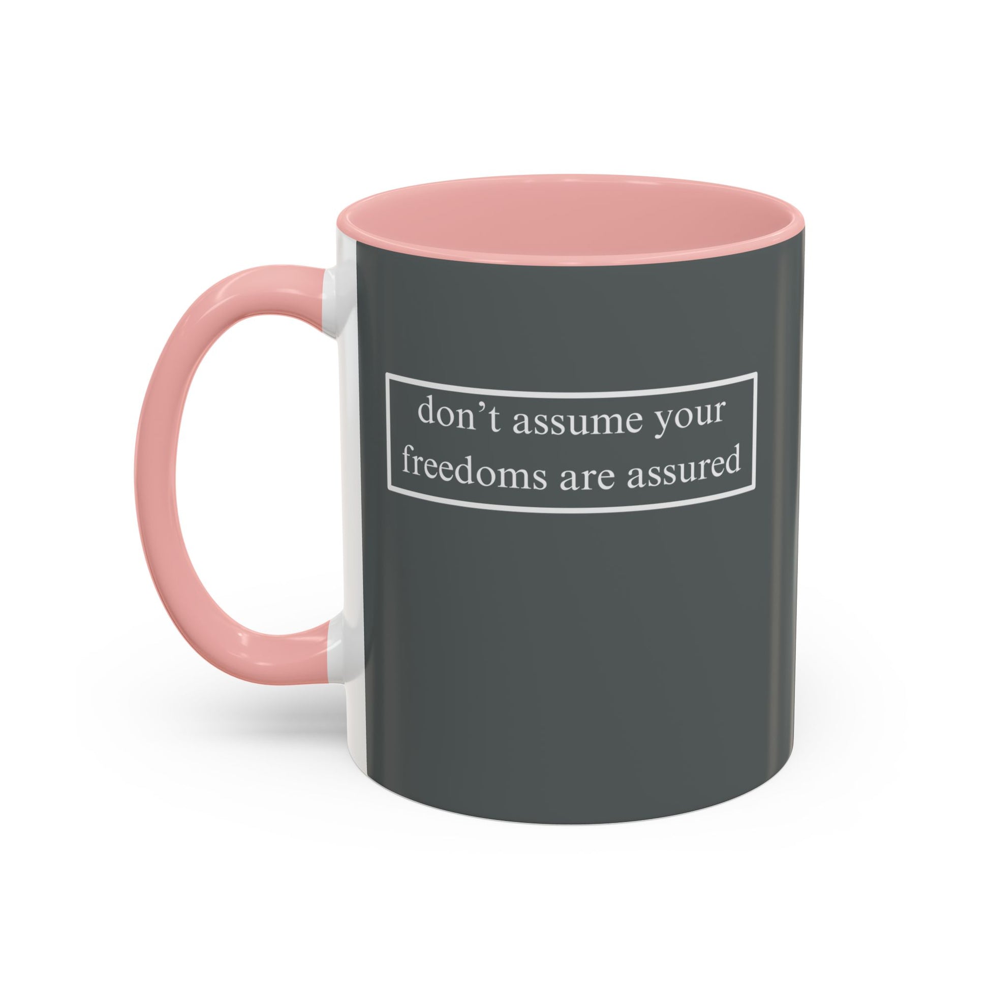 A simple but important message don't assume your freedoms are assured, White font, Grey Accent Mug by cypherpunkgear.com