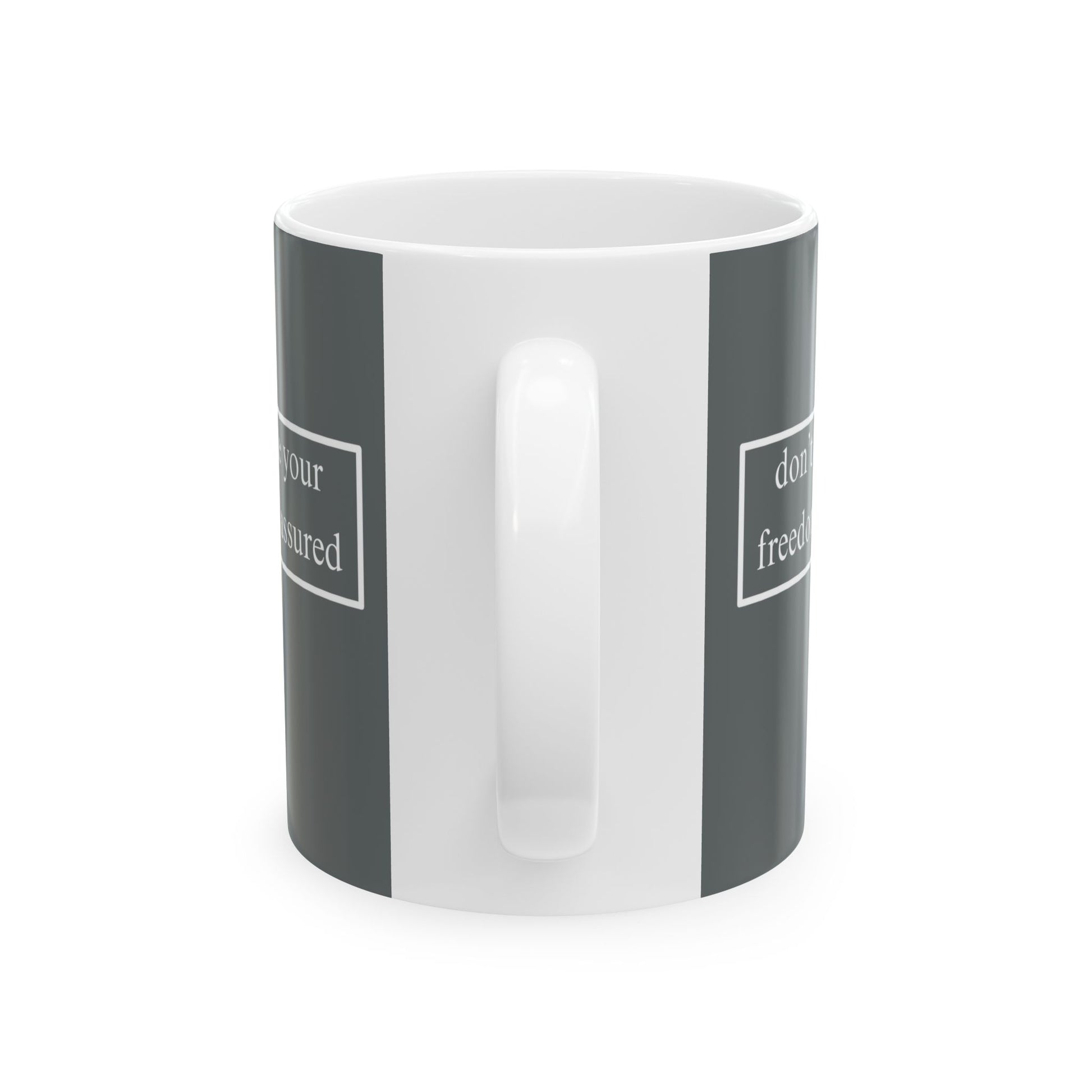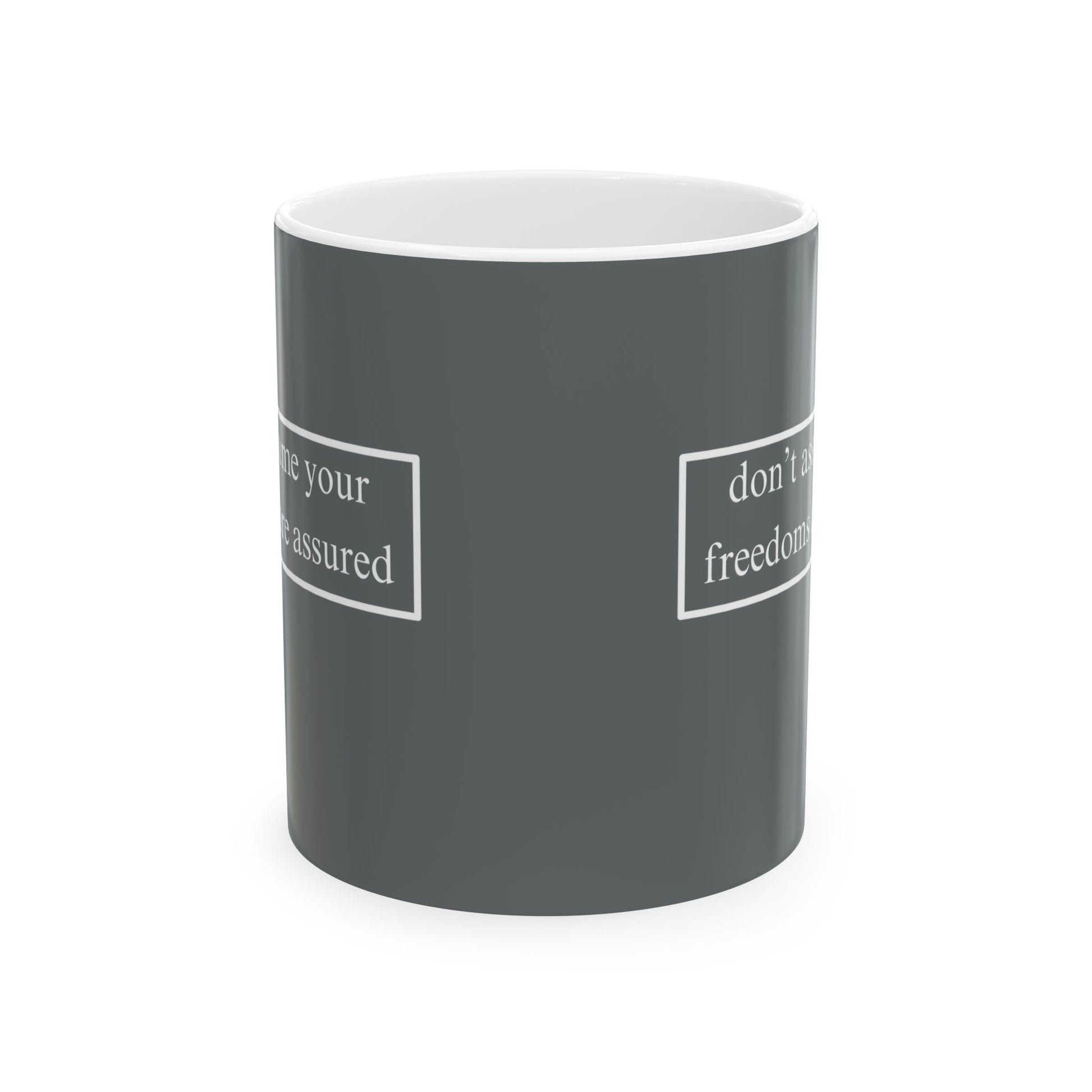A simple but important message don't assume your freedoms are assured, White font, Grey/White Mug by cypherpunkgear.com