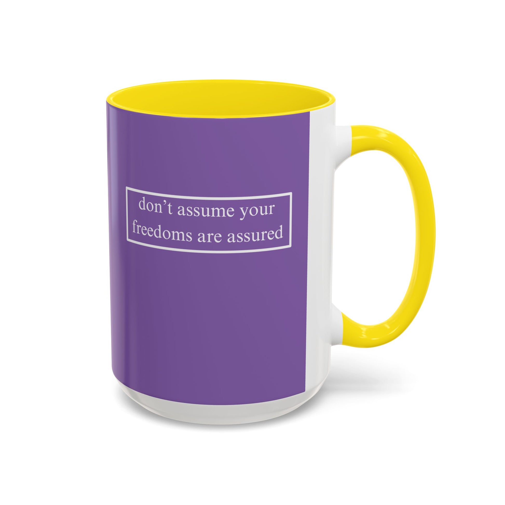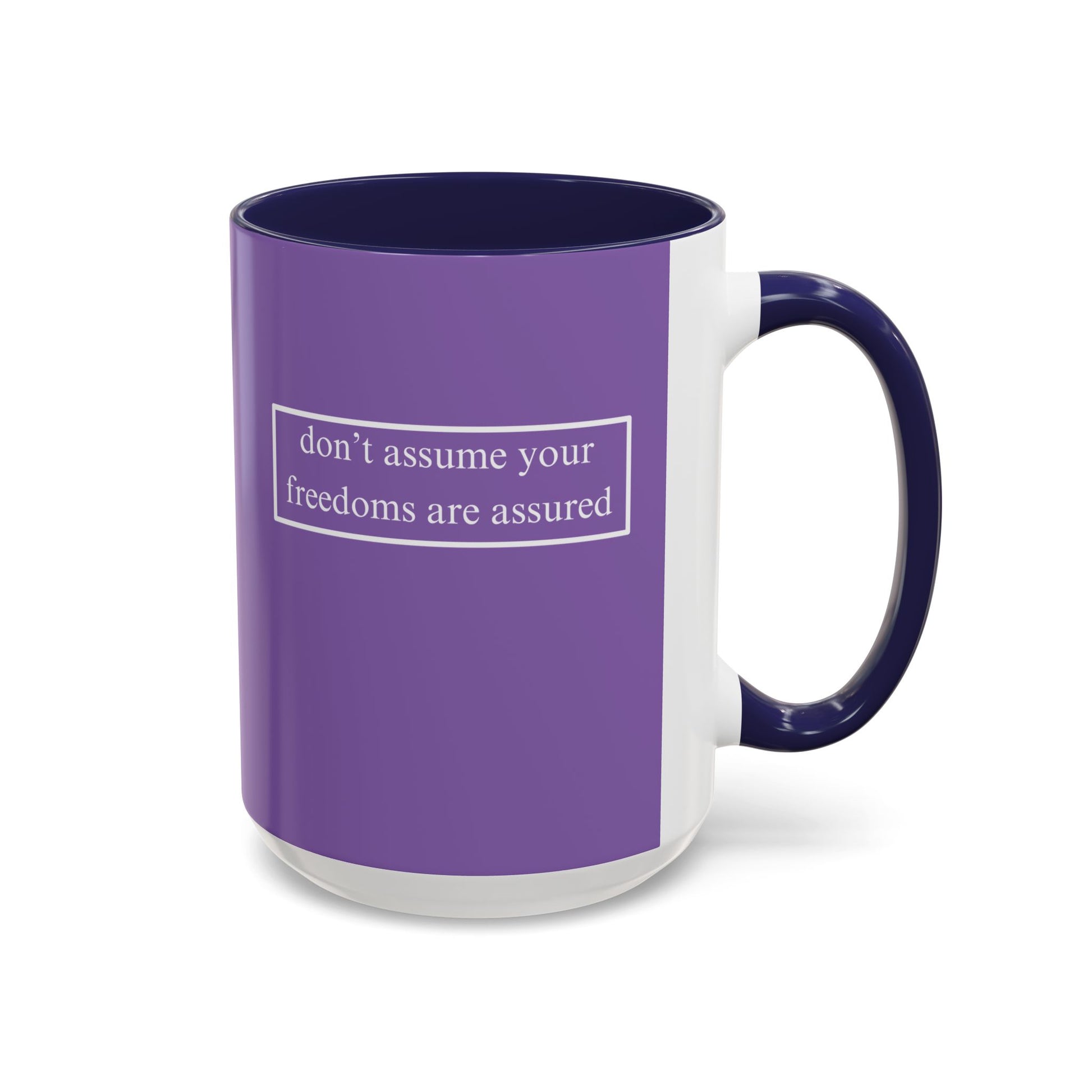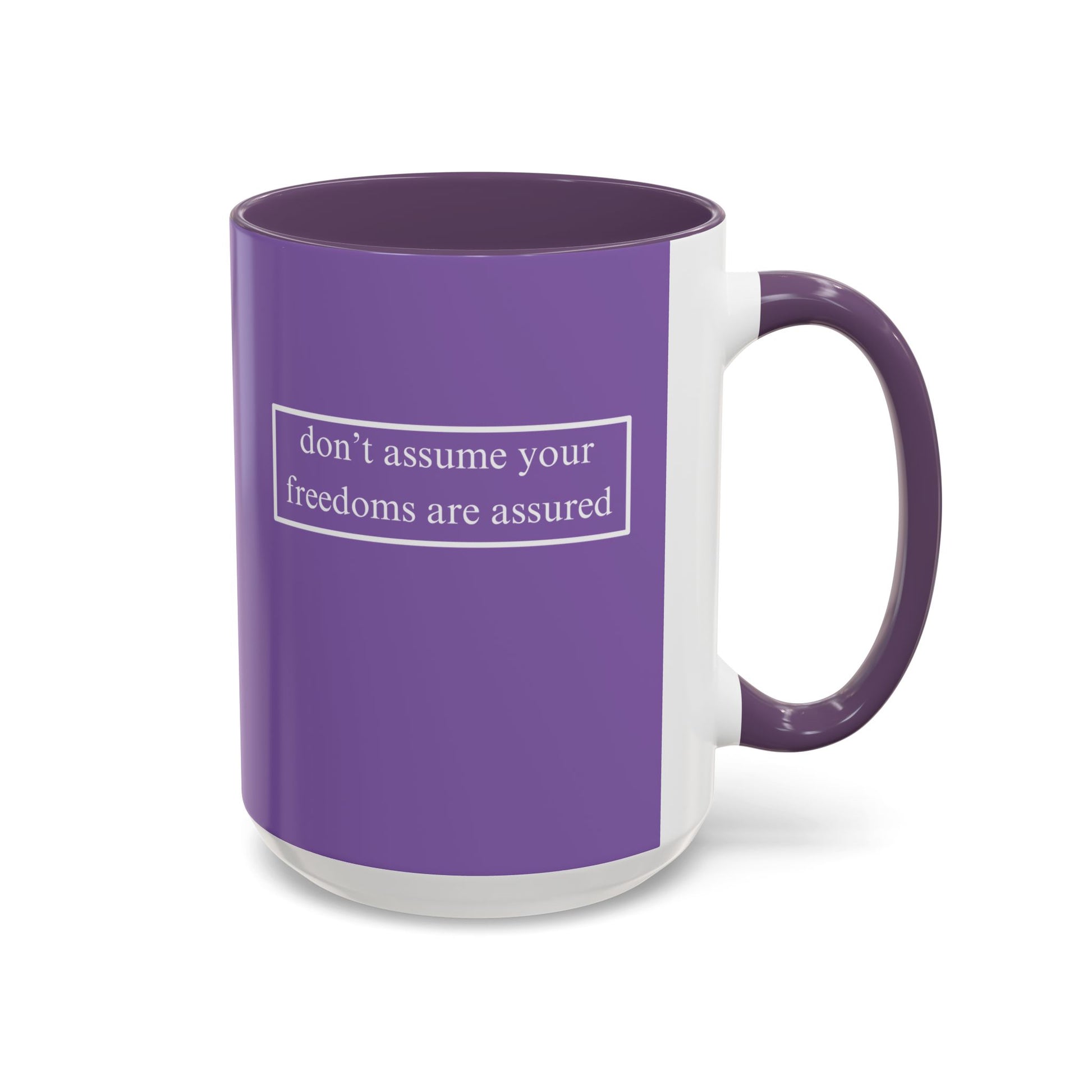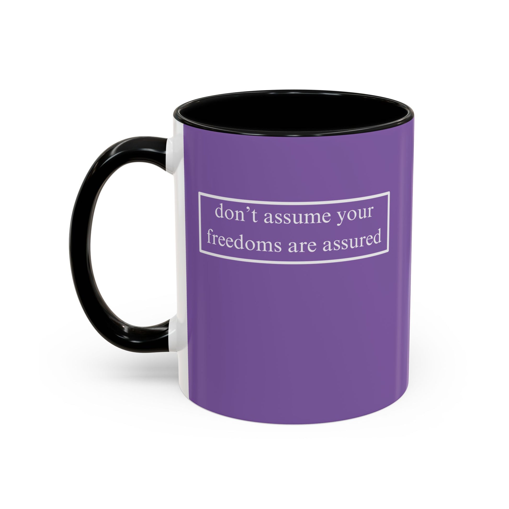 A simple but important message don't assume your freedoms are assured, White font, Light Purple Accent Mug by cypherpunkgear.com