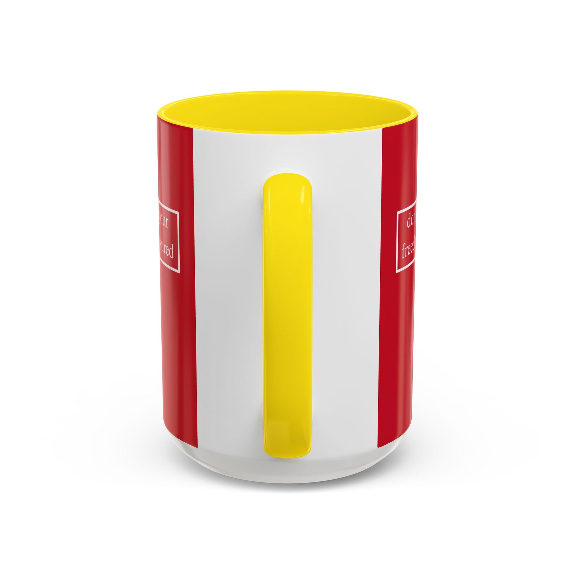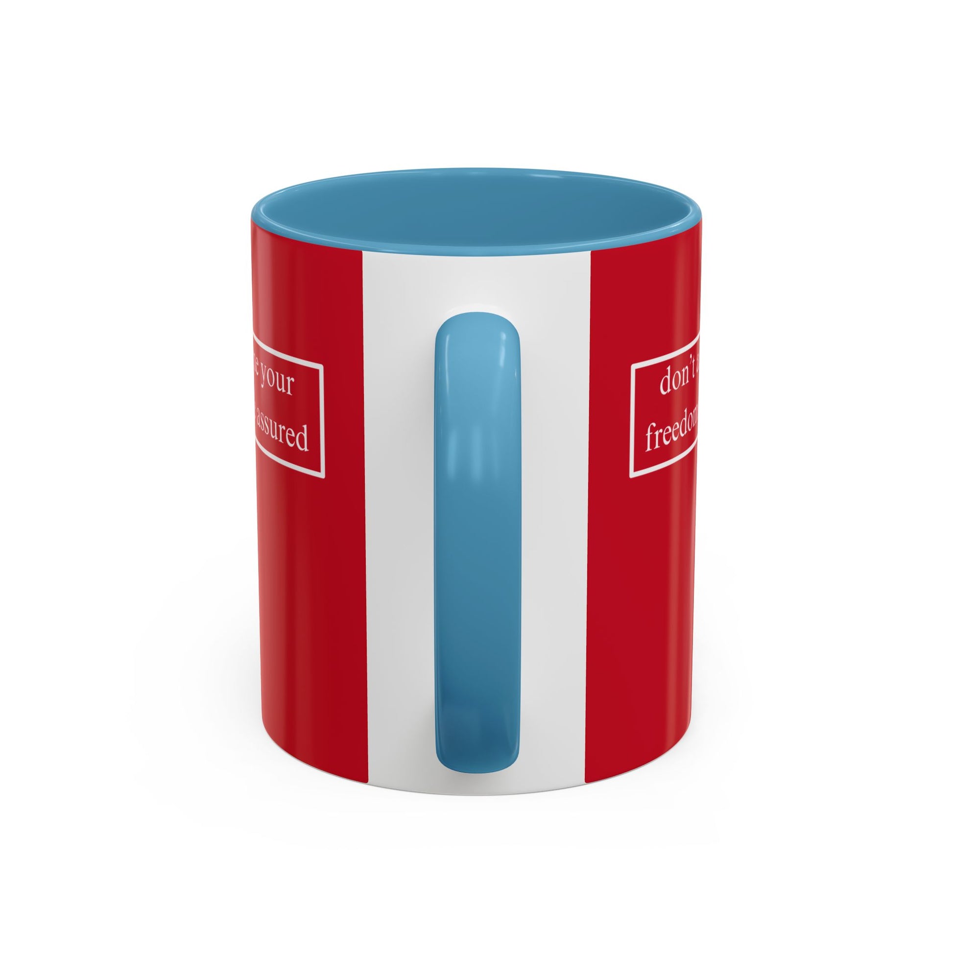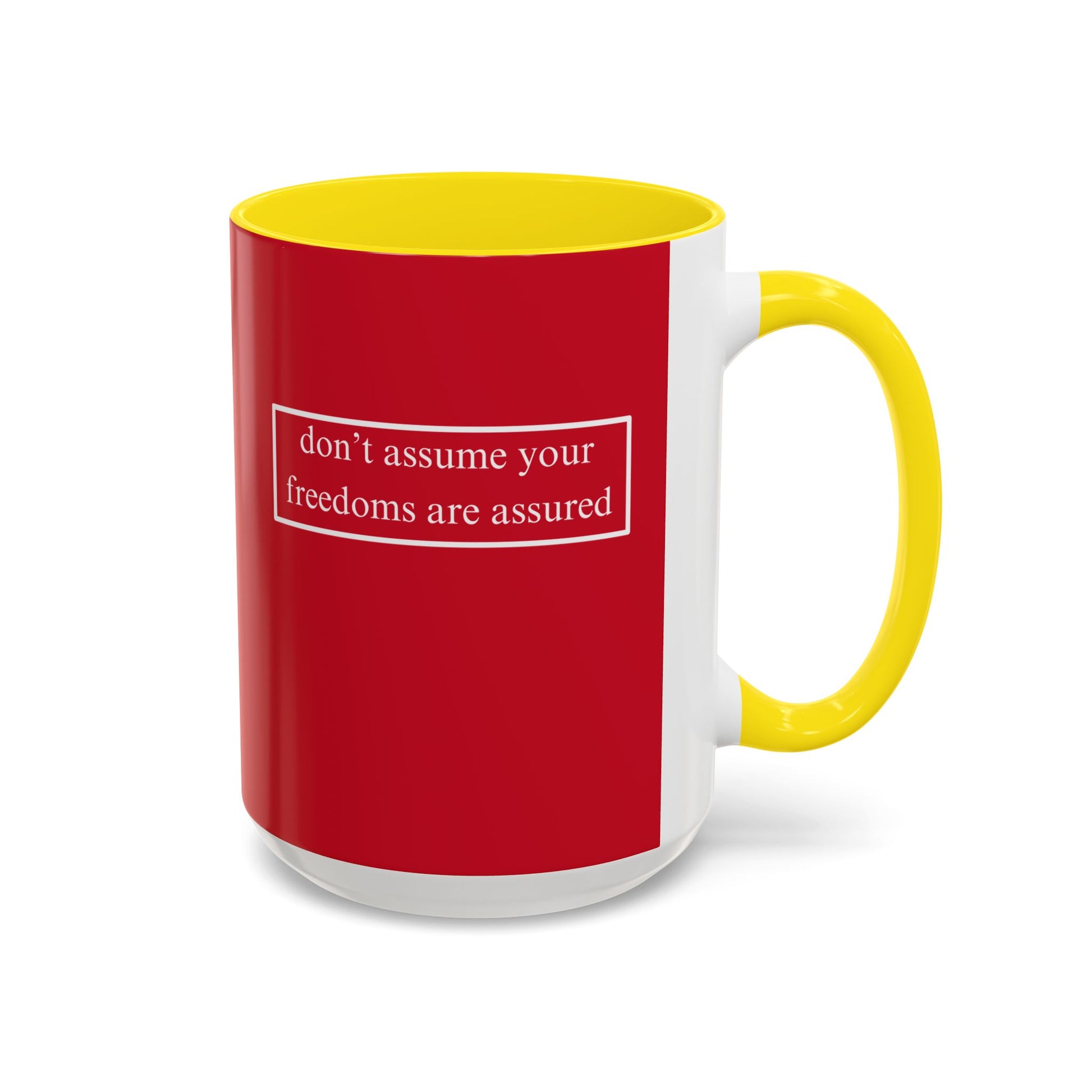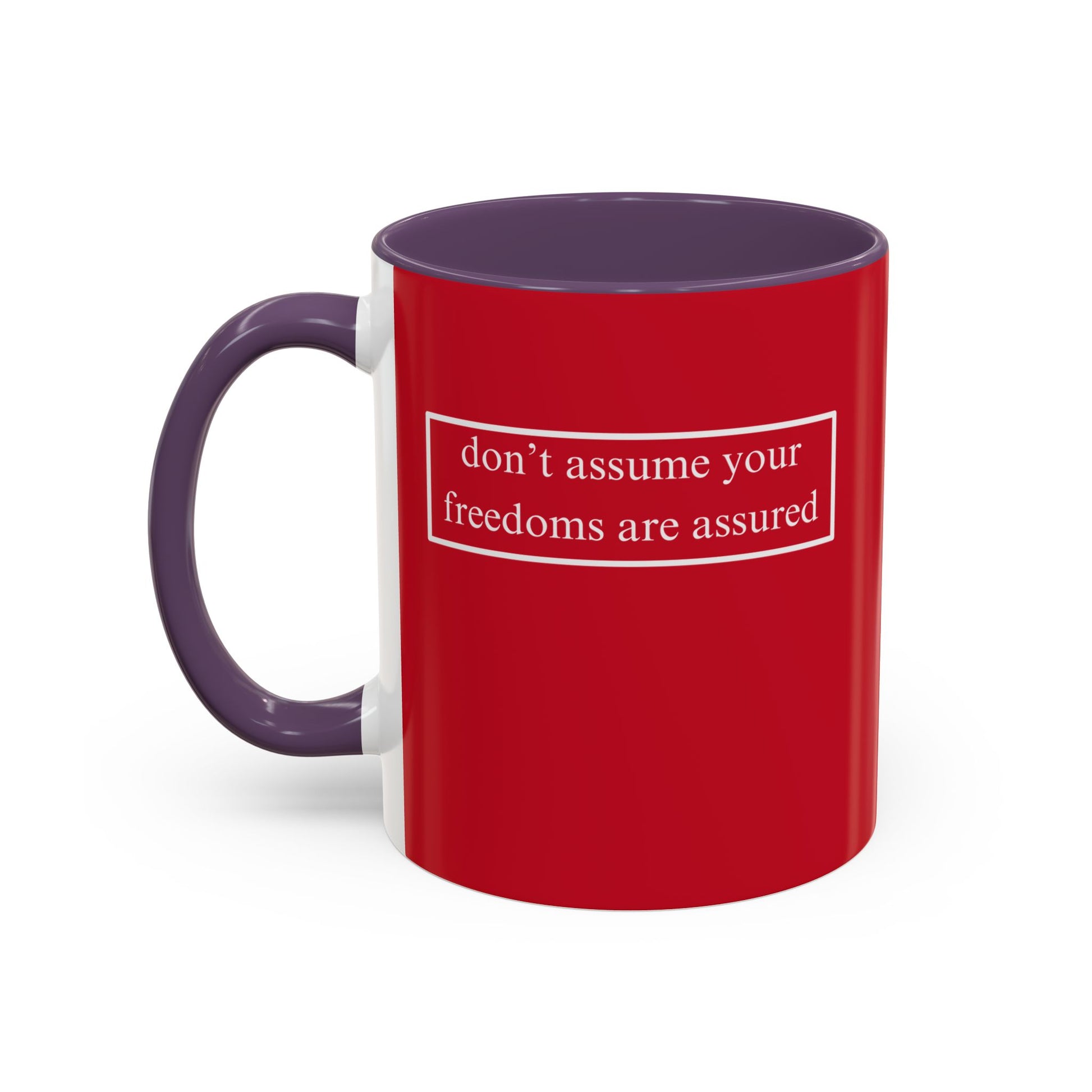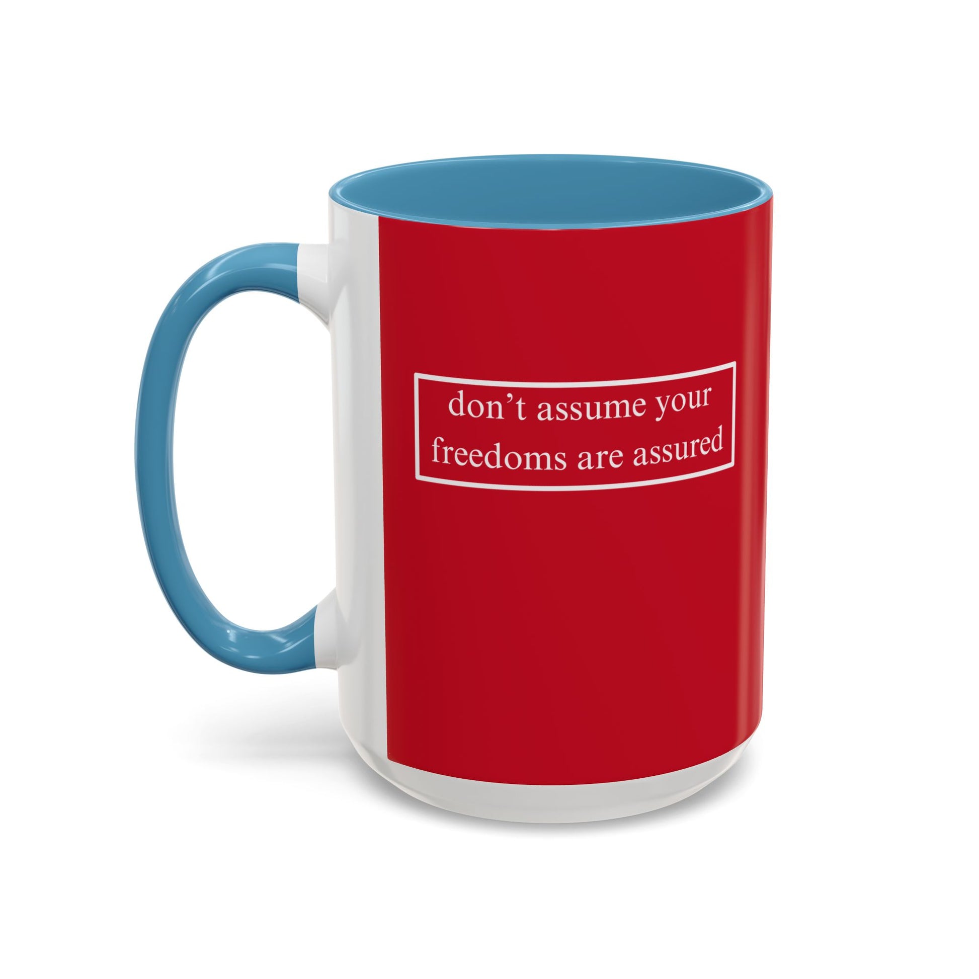 don't assume your freedoms are assured, White font, Red Accent Mug by cypherpunkgear.com