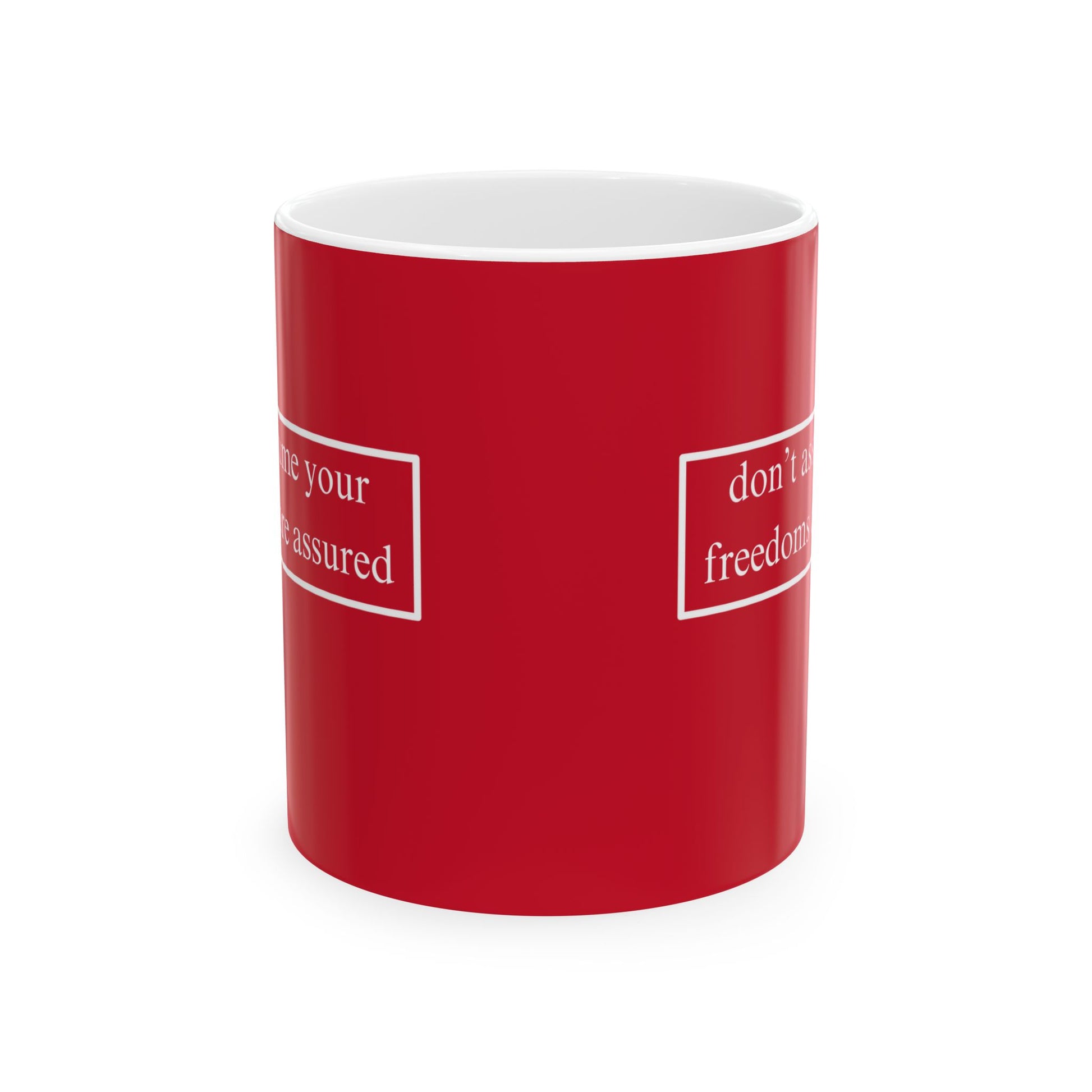 A simple but important message don't assume your freedoms are assured, White font, Red/White Mug by cypherpunkgear.com