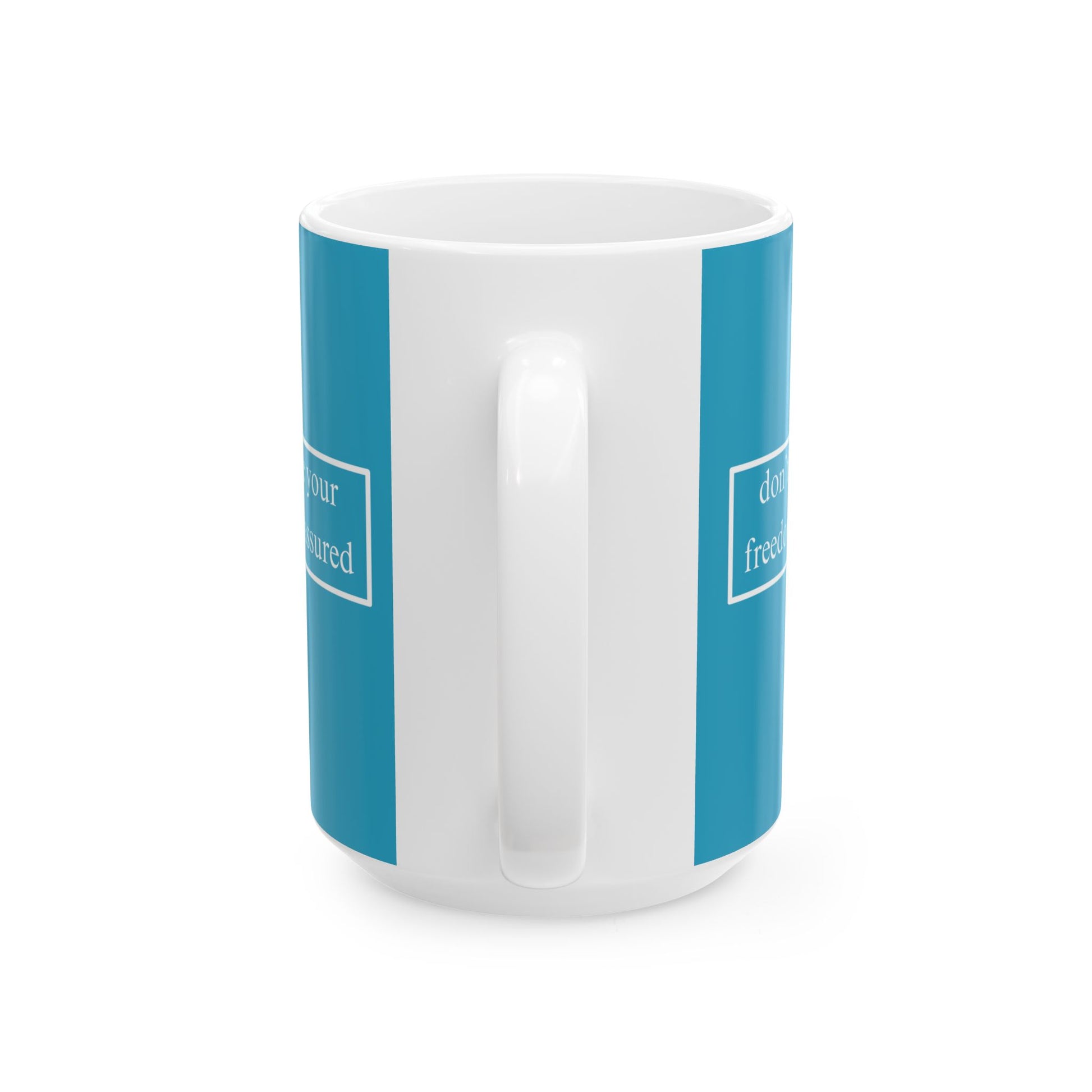 A simple but important message don't assume your freedoms are assured, White font, Turquoise/White Mug by cypherpunkgear.com