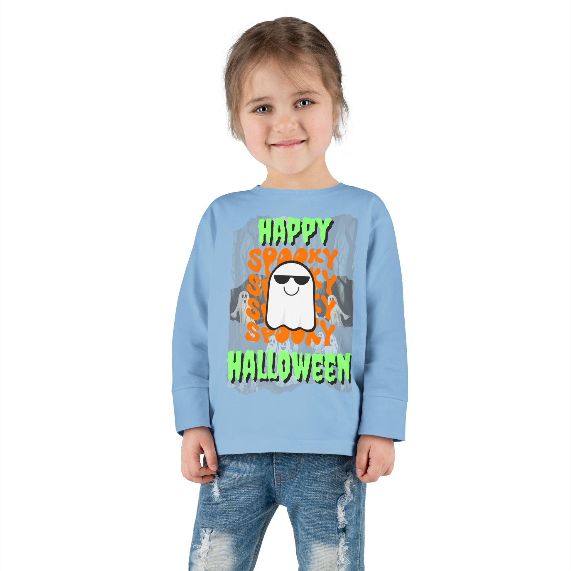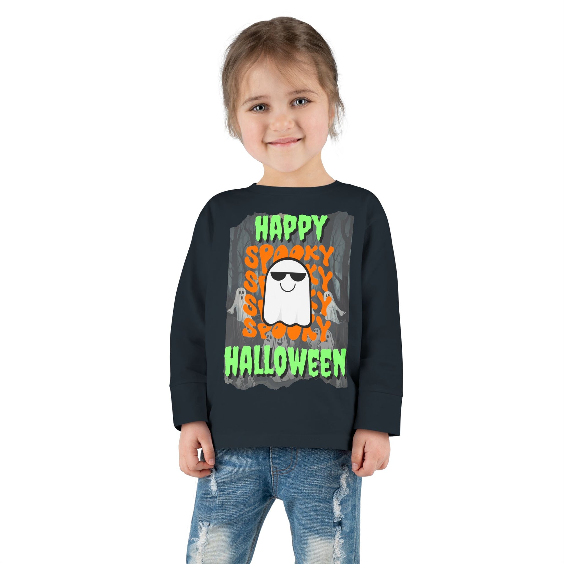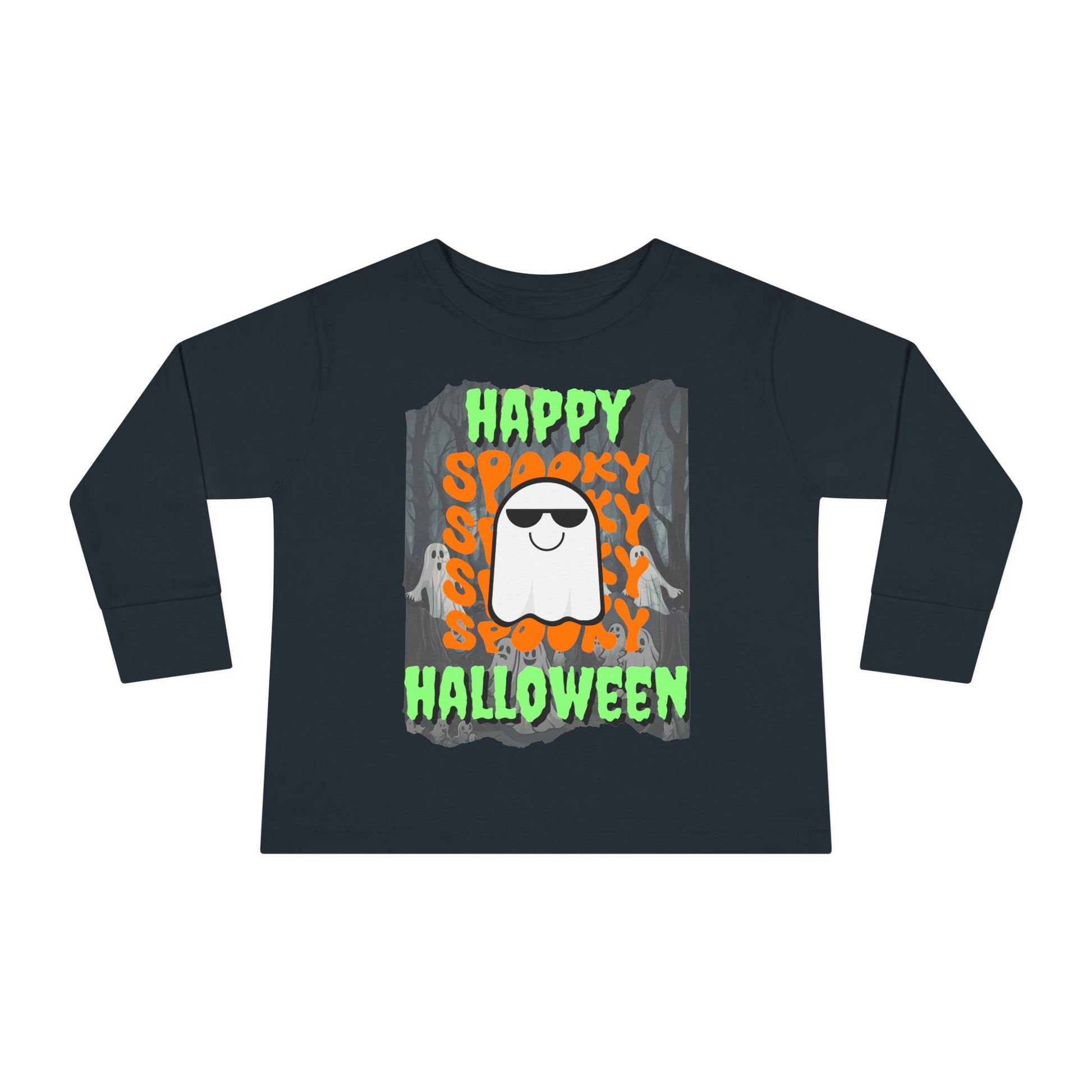 Spooky Happy Halloween Ghost Green font Toddler Long Sleeve Tee by CreepyCrafts.boo