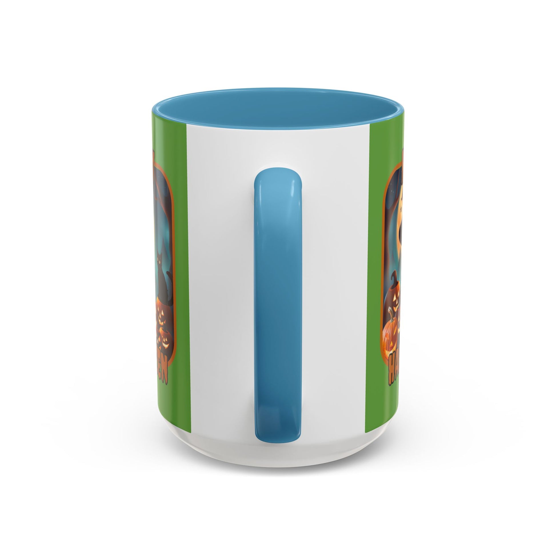 Happy Halloween Cute Witch Orange font Green Accent Mug by CreepyCrafts.boo