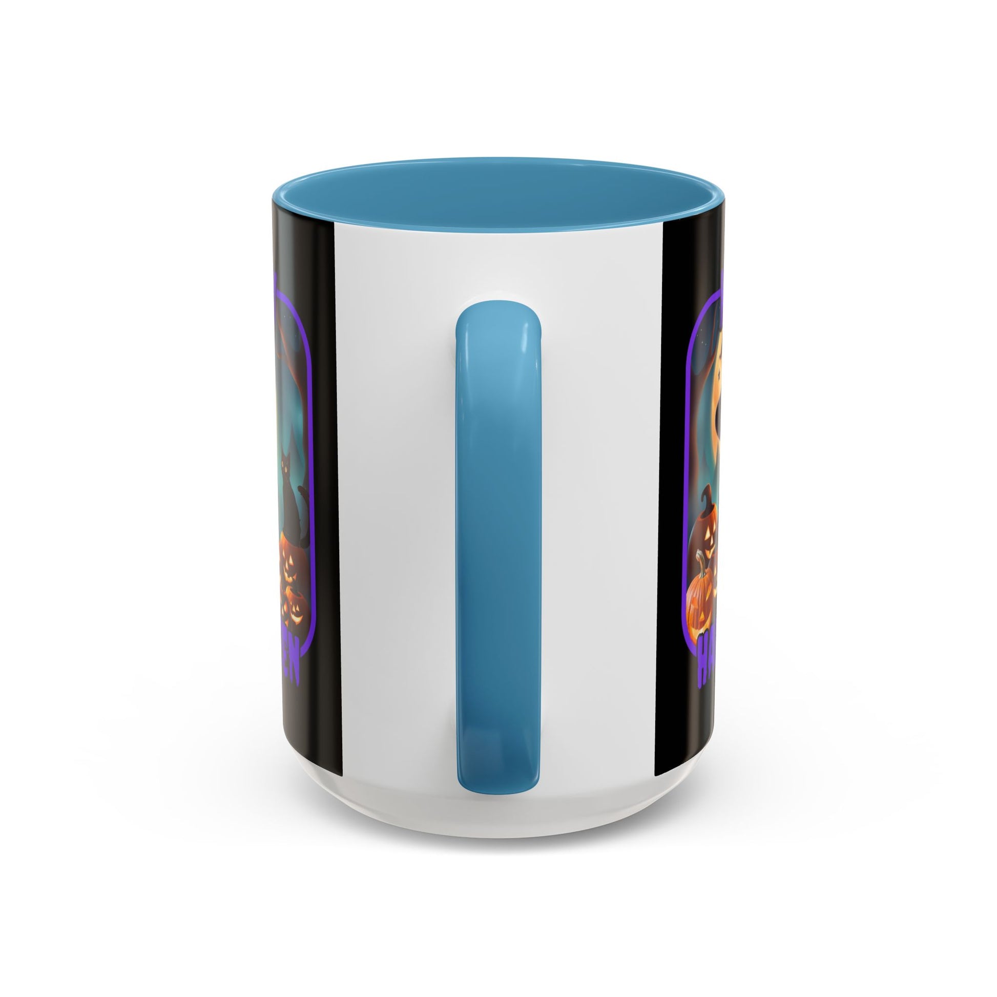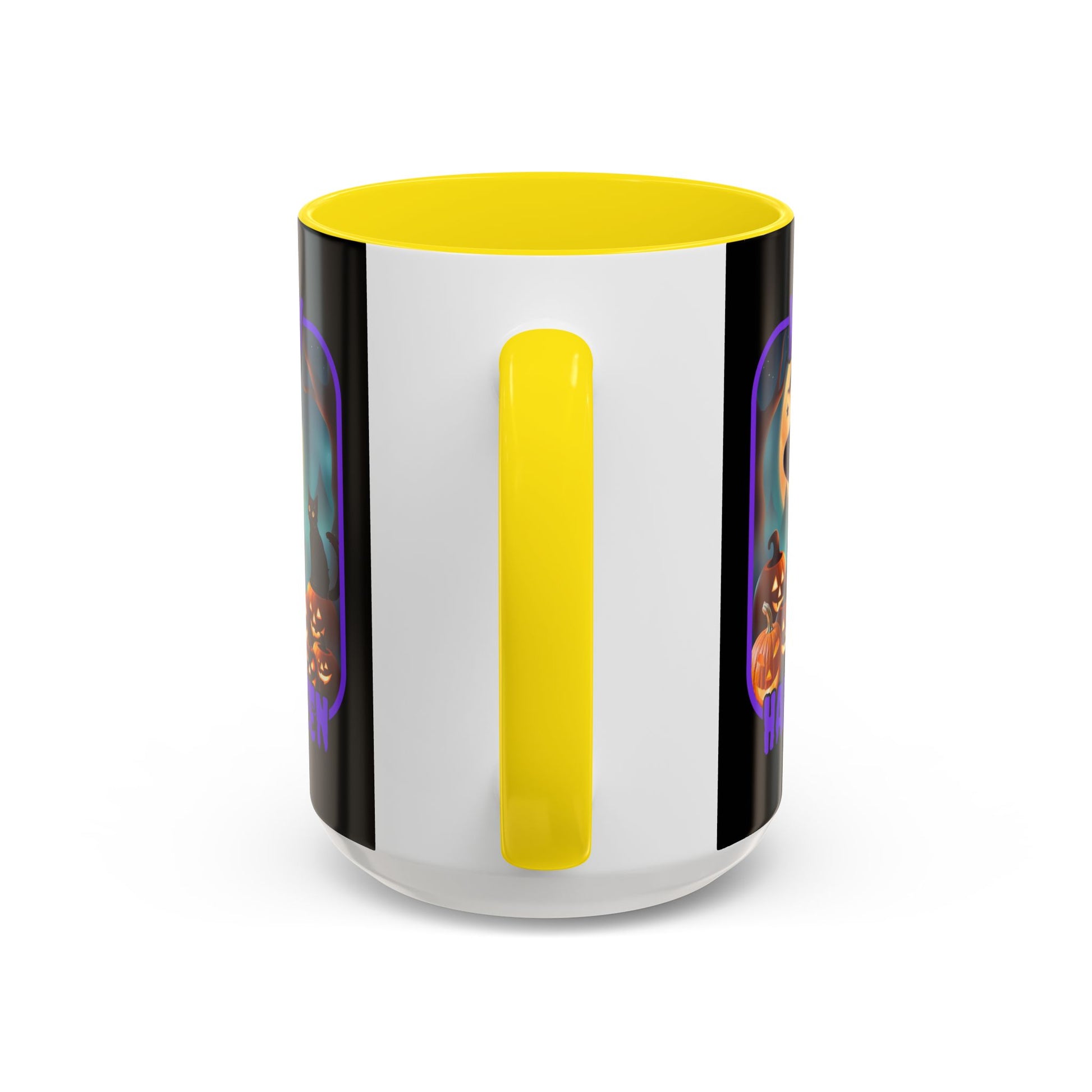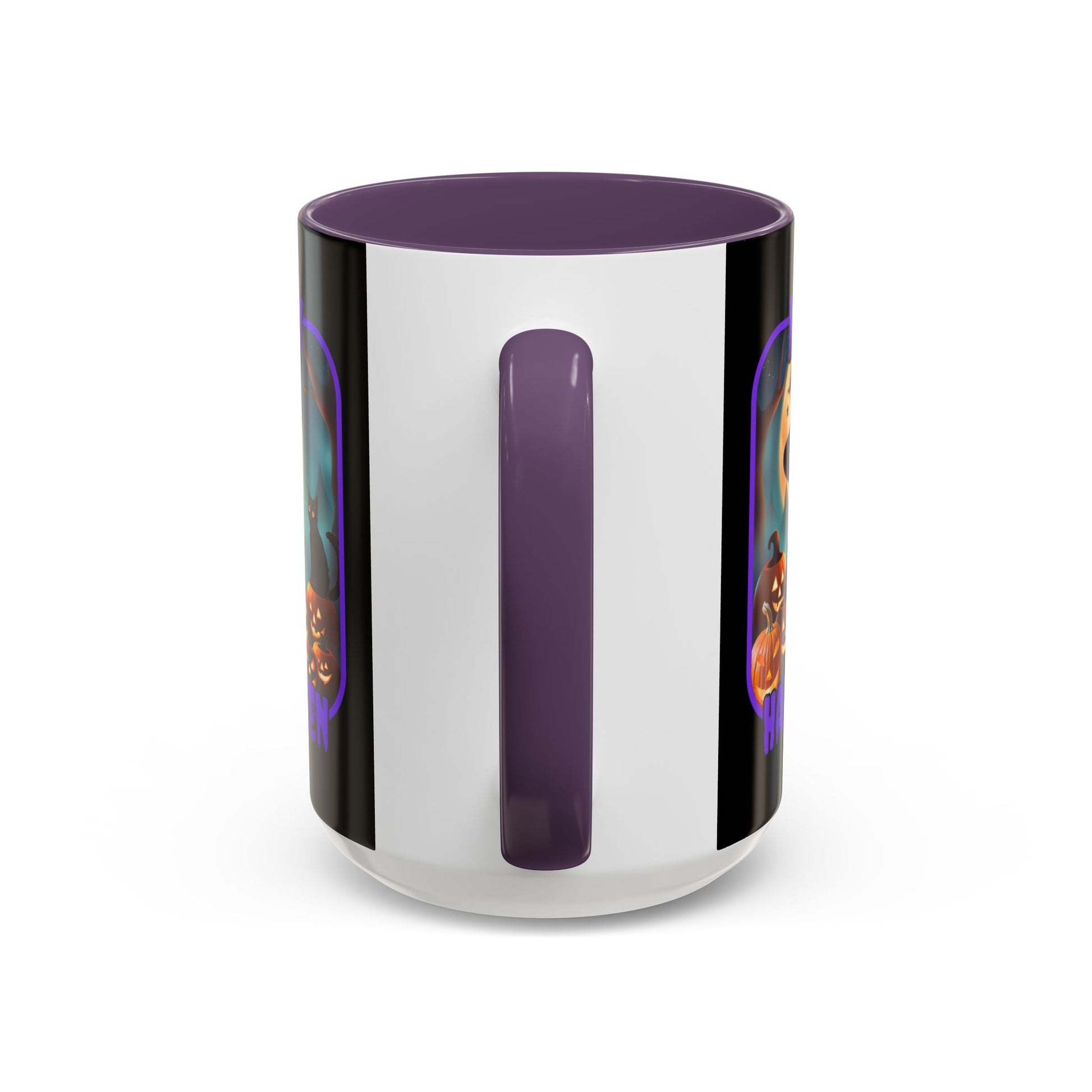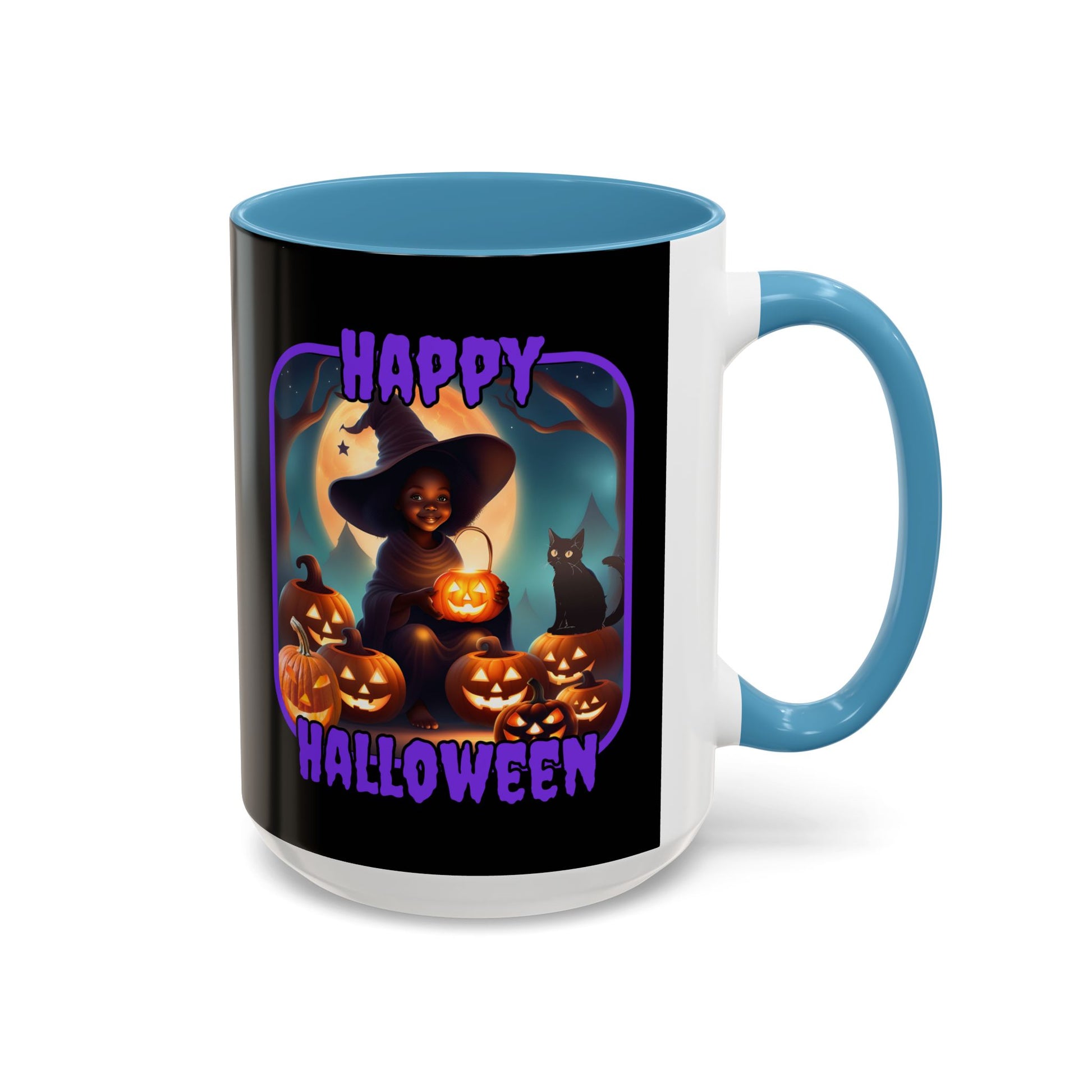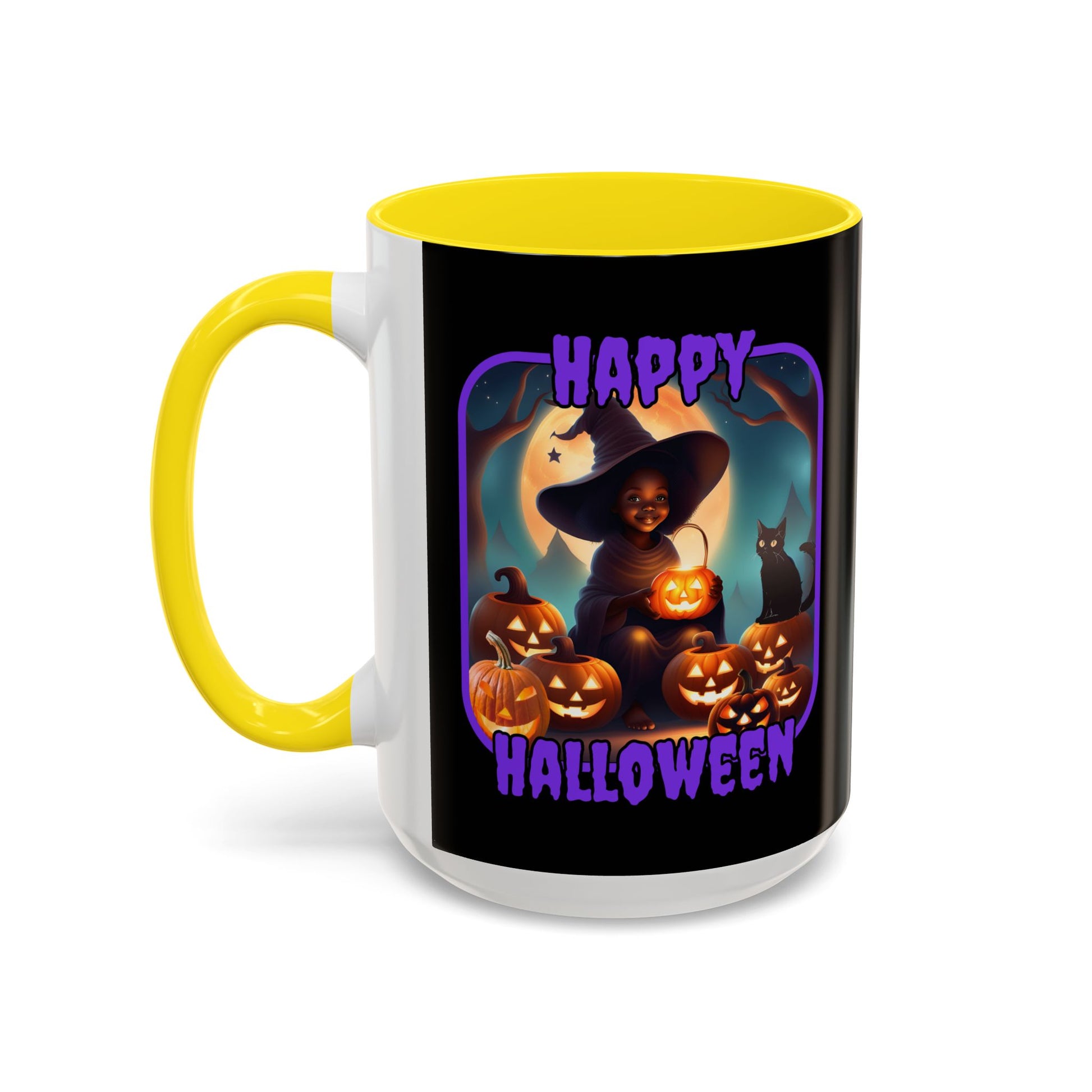 Happy Halloween Cute Witch Purple font Black Accent Mug by CreepyCrafts.boo