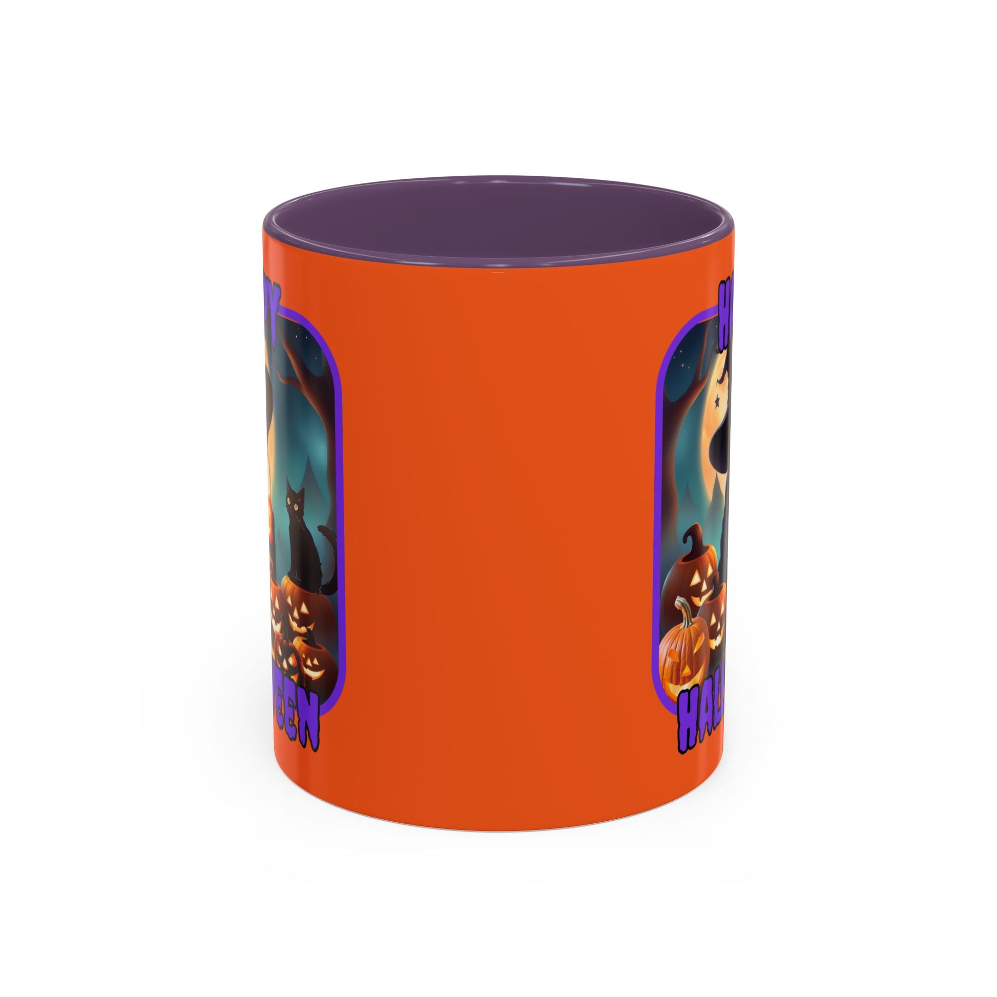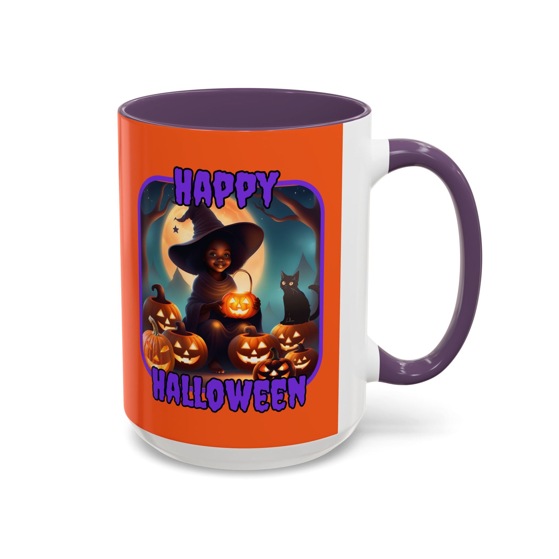 Happy Halloween Cute Witch Purple font Orange Accent Mug by CreepyCrafts.boo