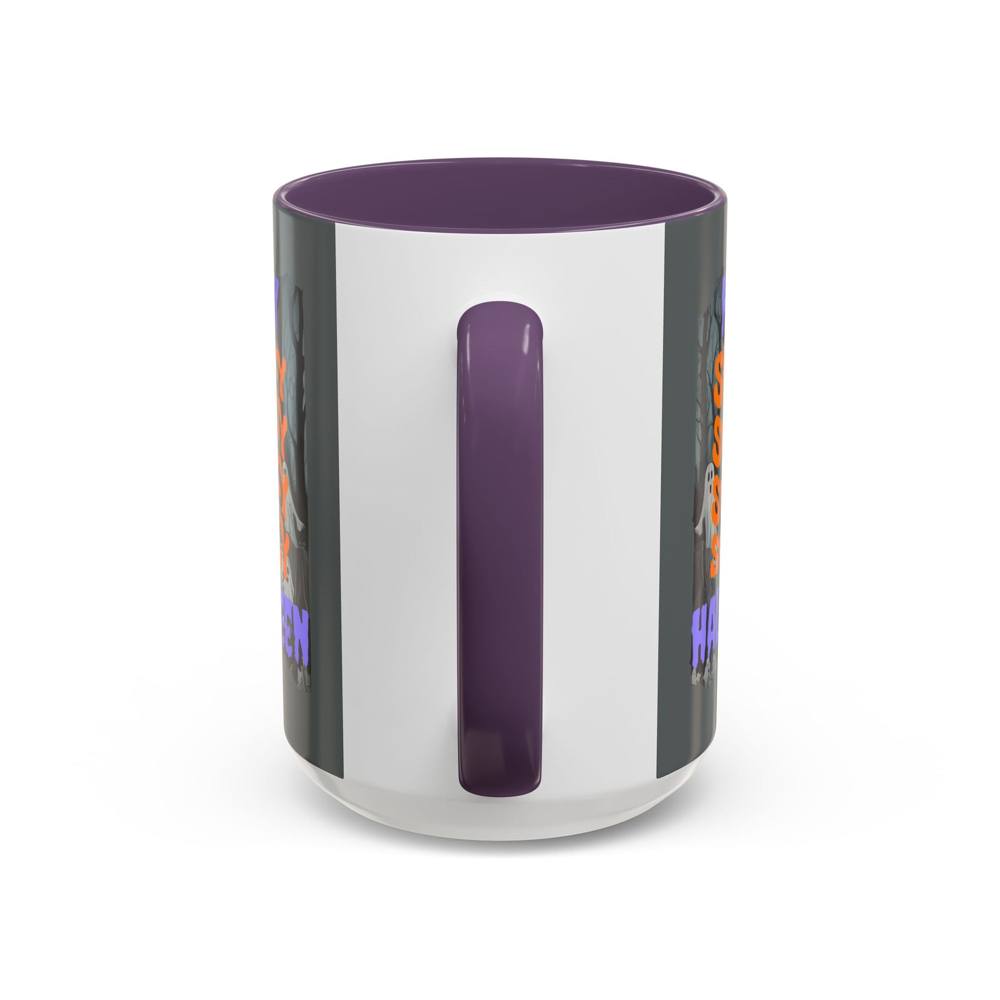 Spooky Happy Halloween Ghost Purple font Grey Accent Mug by CreepyCrafts.boo