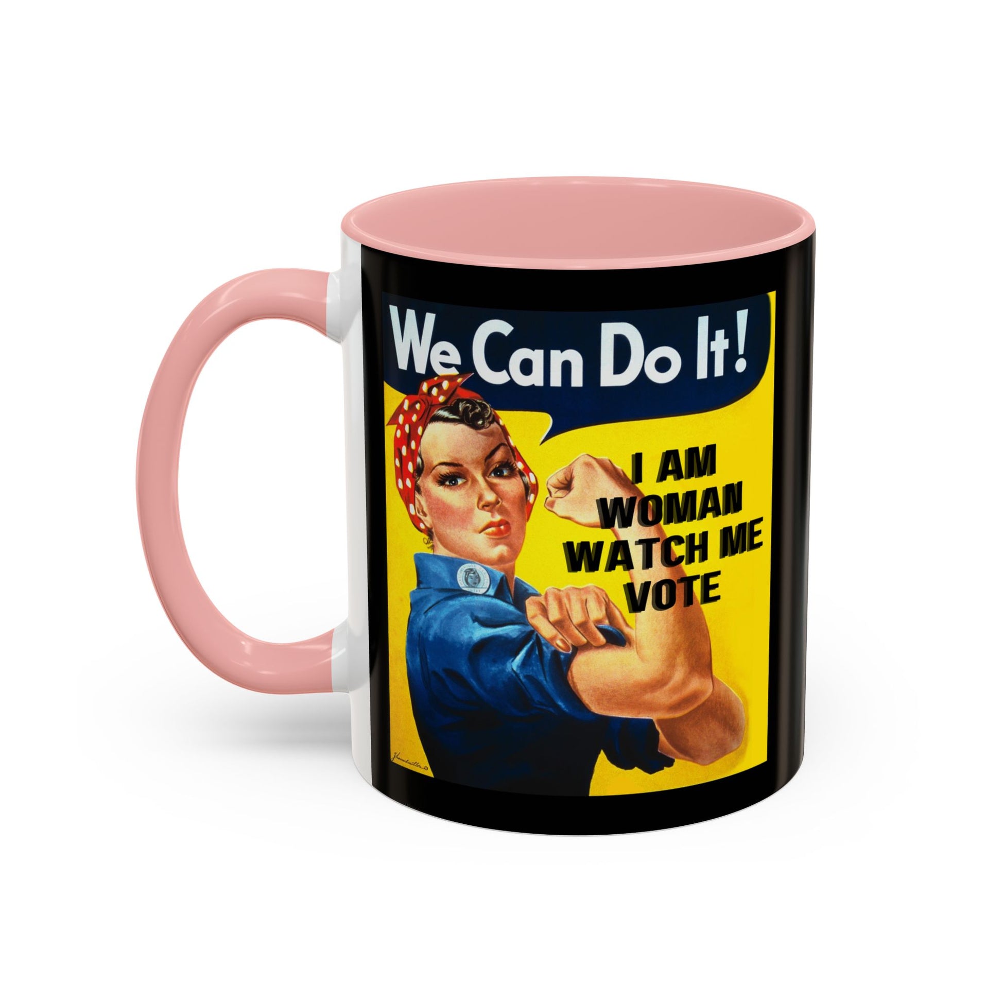Show off your commitment to civic engagement with the I Am Woman Watch Me Vote Rosie Black Accent Mug by cypherpunkgear.com