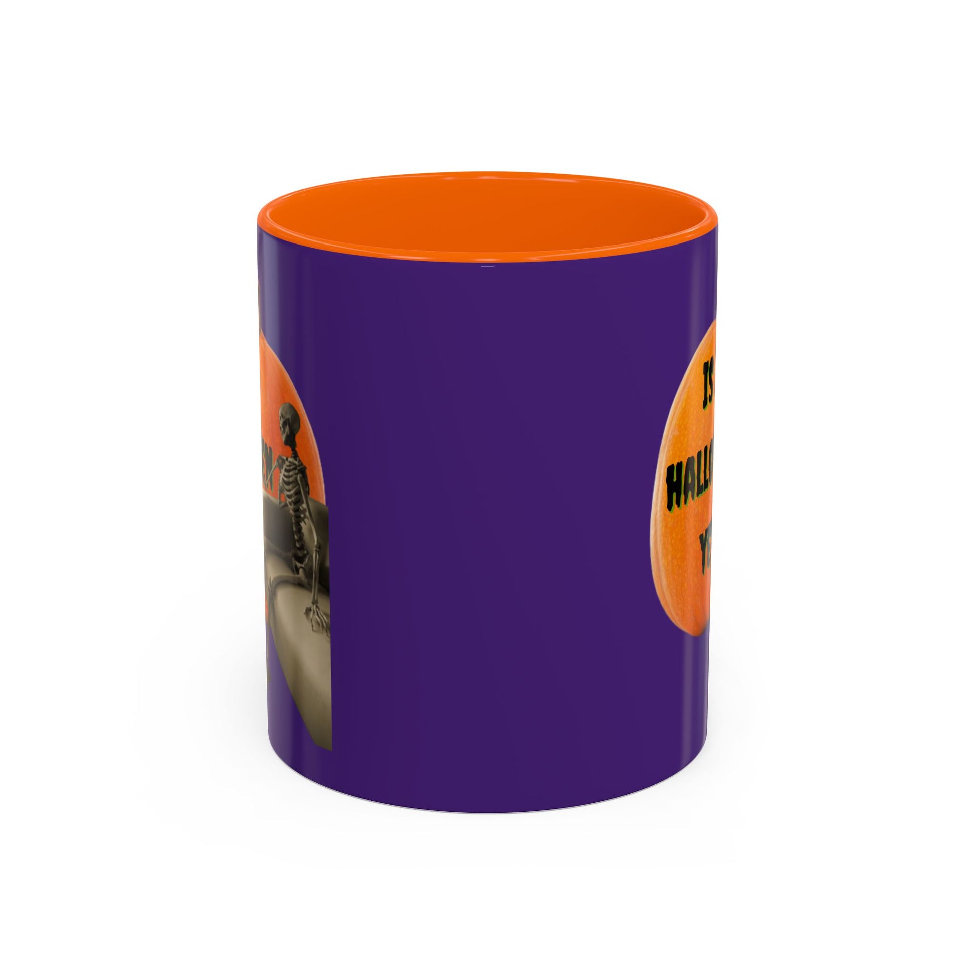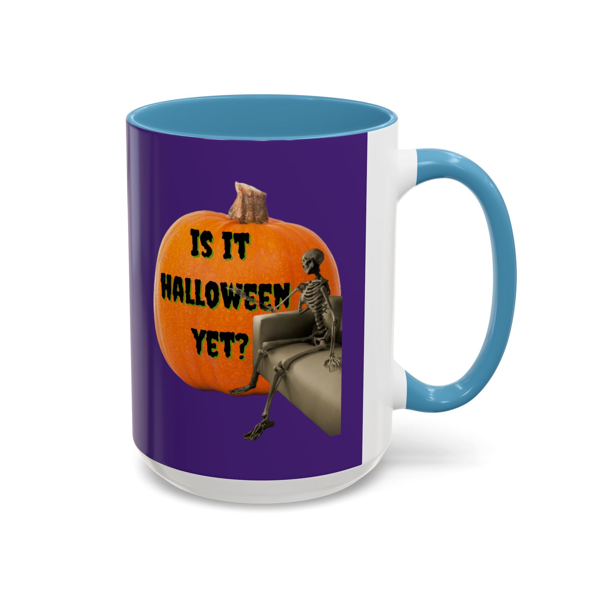 Is Halloween taking forever to arrive? The Is It Halloween Yet? Skeleton's Giant Pumpkin Purple Accent Mug from CreepyCrafts.boo captures your endless craving for October 31st! Picture a skeleton, a lifelong Halloween obsessive, chilling on a couch beneath a massive, looming pumpkin with the words, âIs It Halloween Yet?â This haunting design speaks to every ghoul whoâs been waiting eons for jack-oâ-lanterns and ghostly thrills. Perfect for haunted houses or sipping your favorite beverage on cozy fall nights. Grab it now and show the world youâre ready for Halloween...any century now...