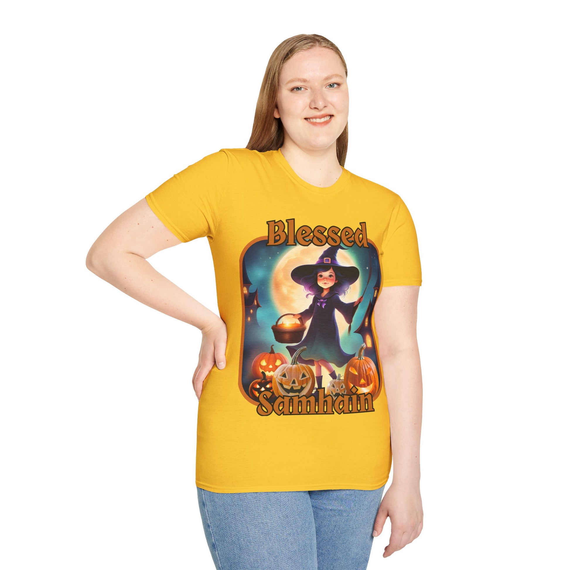 Blessed Samhain Little Witch Orange font Light colors Unisex T-Shirt by CreepyCrafts.boo