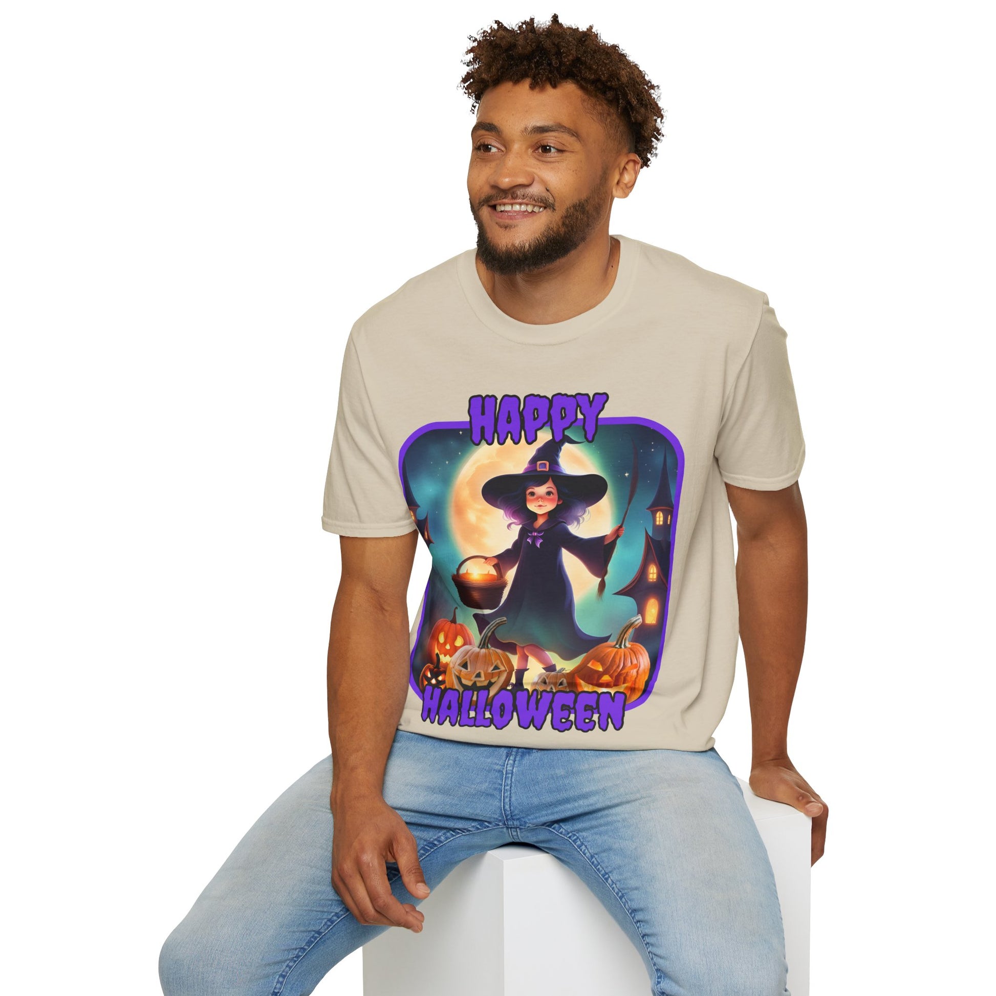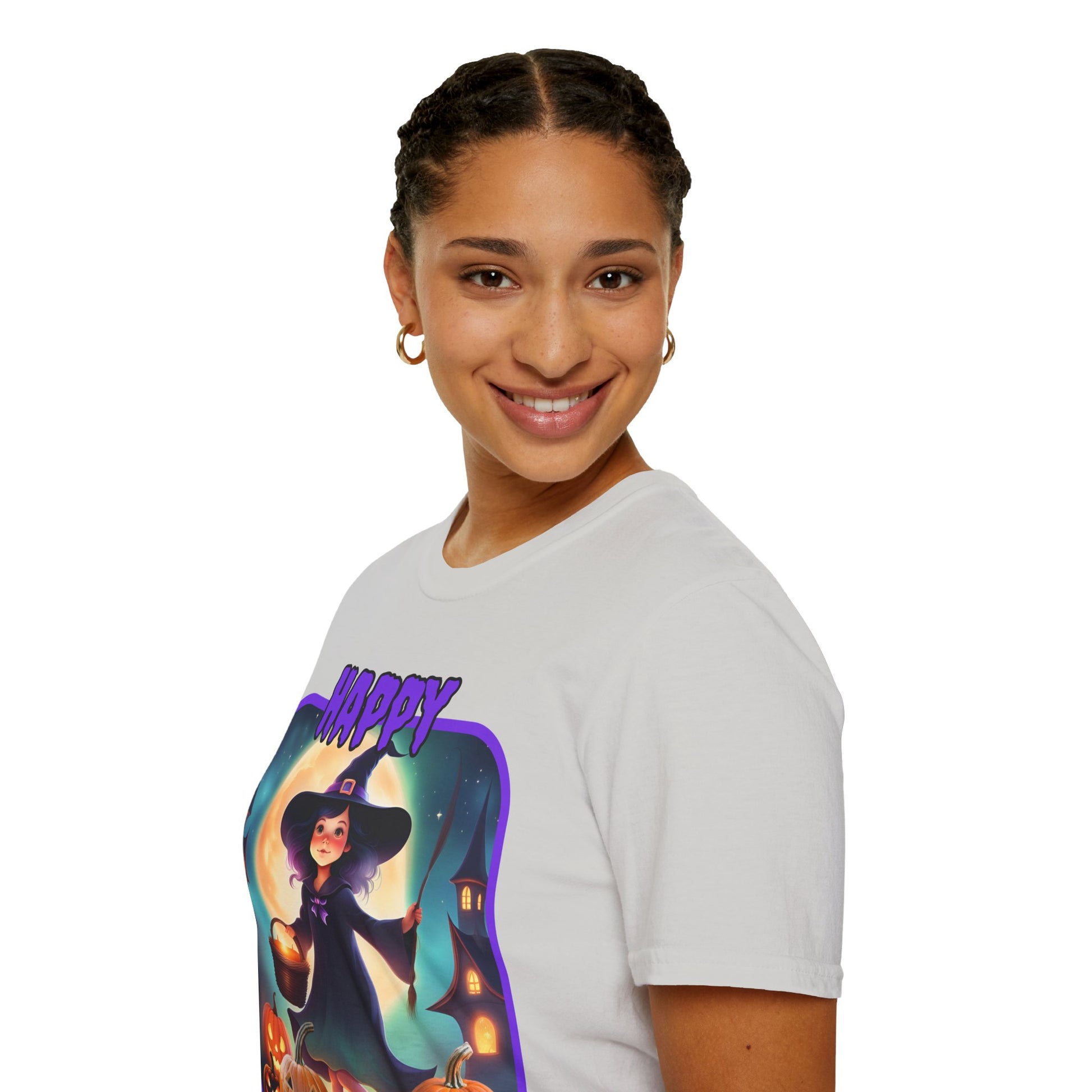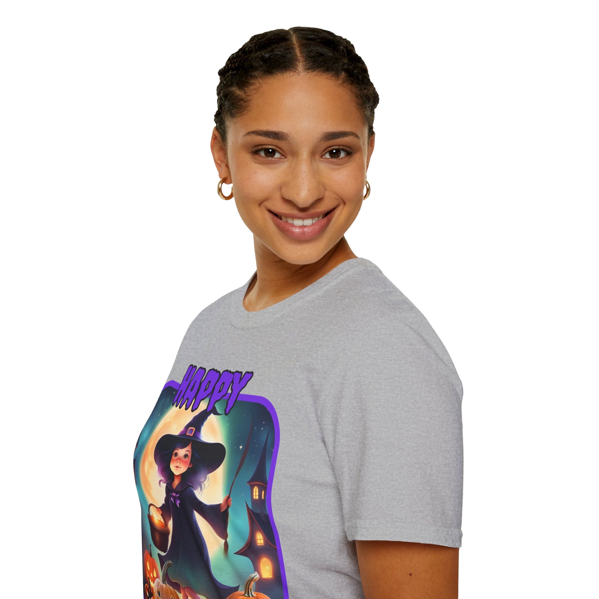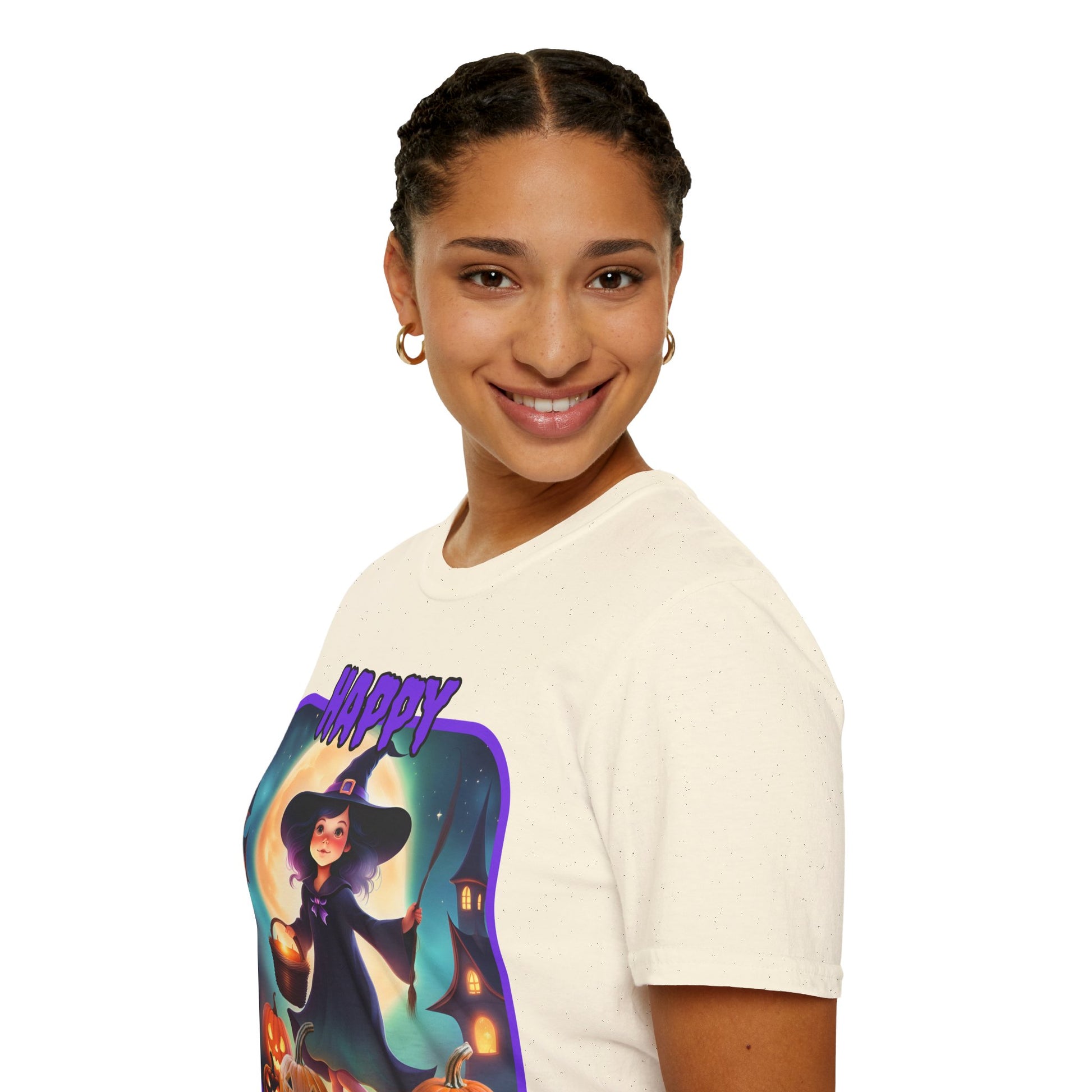 Happy Halloween Little Witch Purple font, Light colors, Unisex T-Shirt by CreepyCrafts.boo