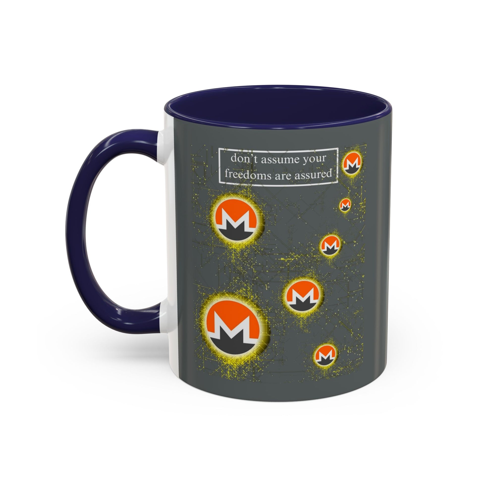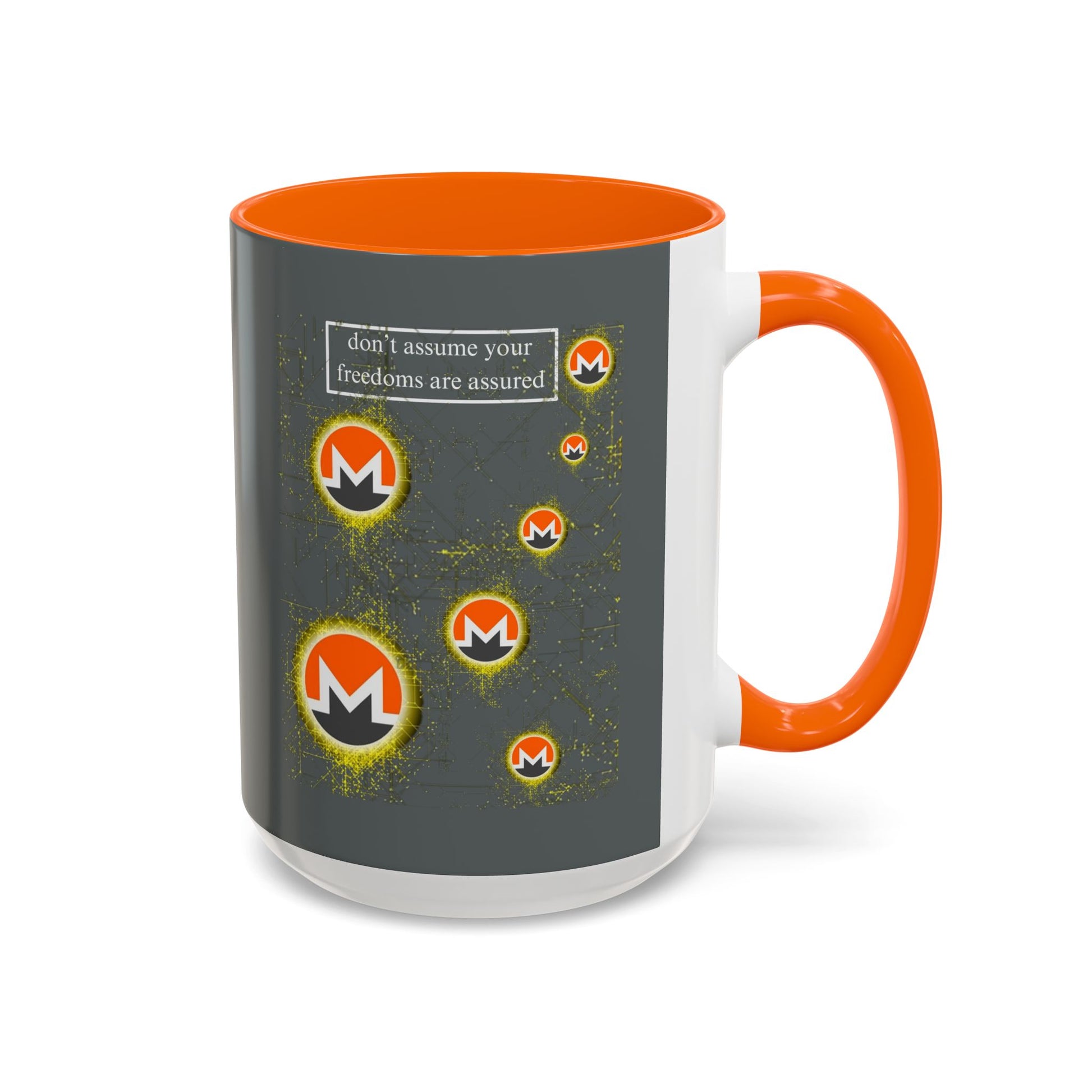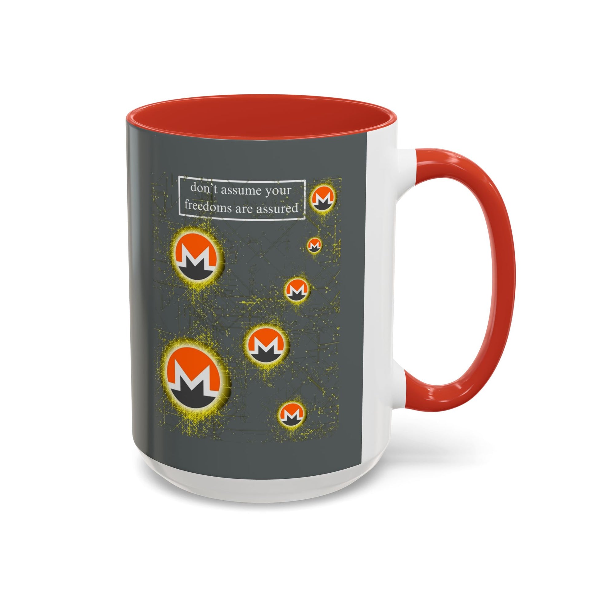Monero (XMR) don't assume your freedoms are assured Grey Accent Mug by cypherpunkgear.com